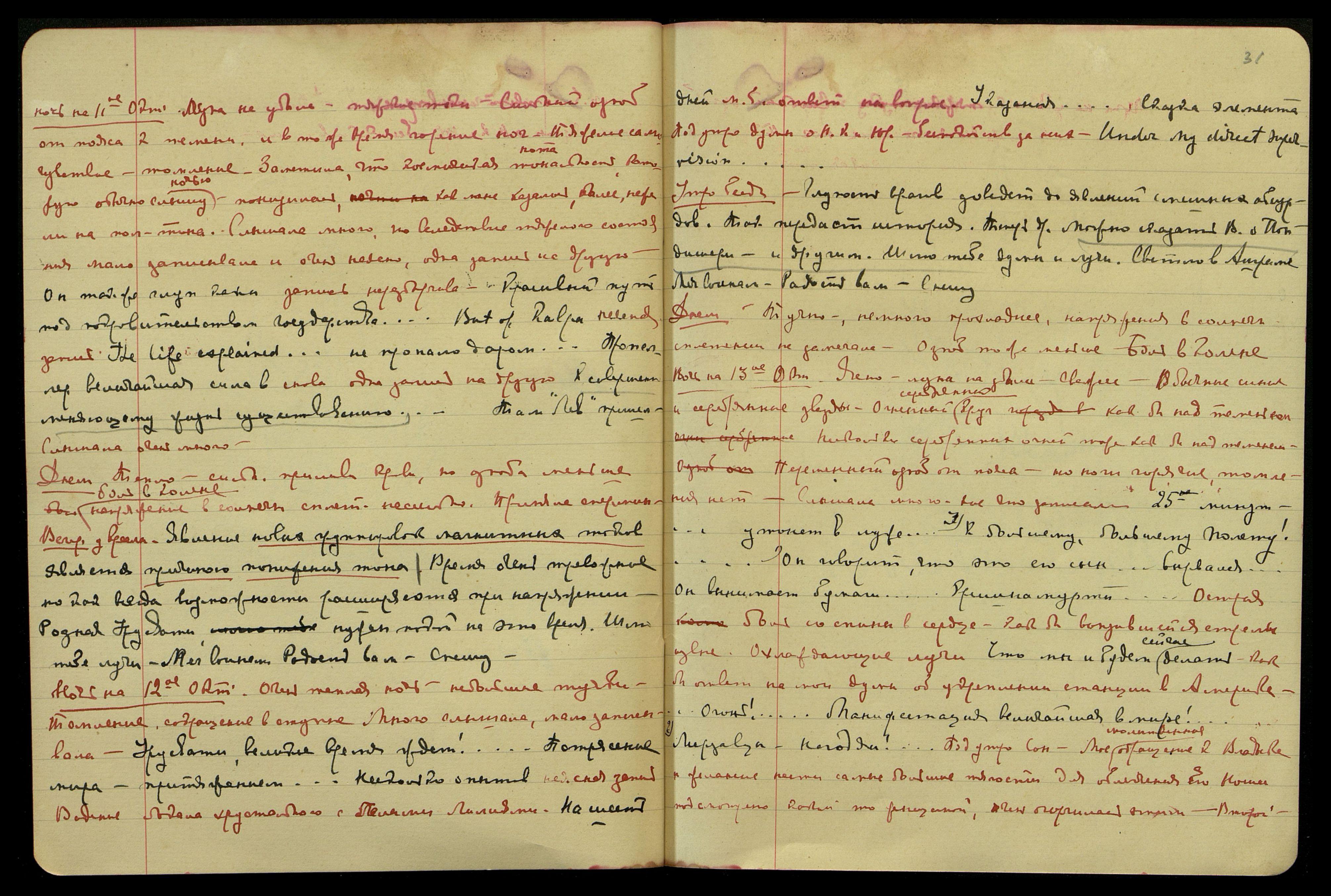 Ночь на 12-ое окт[ября]. Очень тёплая ночь, небольшие тучки. Томление, сокращение в ступне. Много слышала, мало записывала. Урусвати, великое время ждёт! ... Потрясение мира - притяжением... Несколько опытов. Неясная запись. Видение бокала хрустального с белыми лилиями. На шесть дней - м[ожет] б[ыть] ответ на вопрос. Указания ... Сказка элемента. Под утро думы о Н.К. и Юр[ии] - беспокойств[о] за них. Under My direet superior... [англ.: Под моим непосредственным начальством...]
