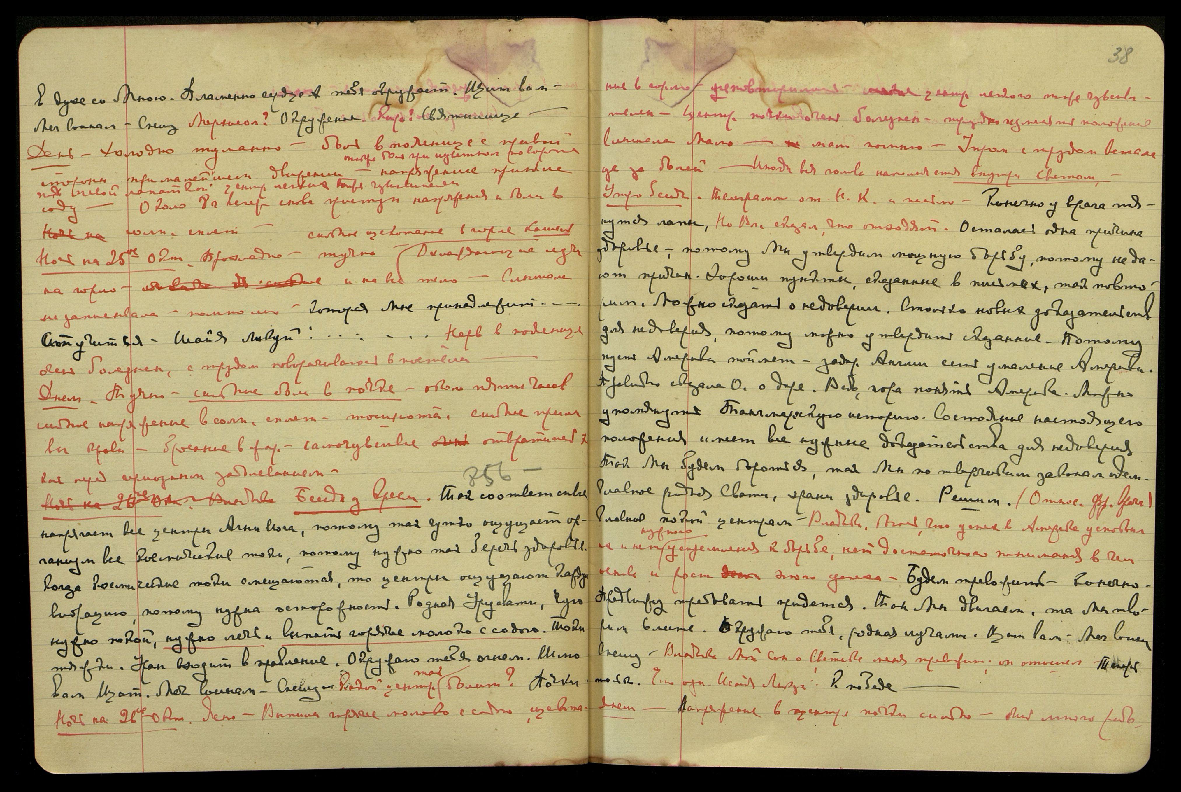 Ночь на 22-ое окт[ября]. После беседы сильнейшие боли в солнечном сплетении и напряжение в области груди, приступ рвоты, после этого лёгкое облегчение, хотя ночью снова был приступ напряжения и истечение слюны. С вечера 1) видение снежных вершин, формация острого длинного М. 2) Видение на фоне окна два мужских силуэта, первый плохо распознала, второй высокий и довольно тяжёлый блондин, волосы курчавые, одет в короткие хаки, штаны и белую рубаху, расстёгнутую на груди. Голова массивная. Here she is... [англ.: Здесь она...] - поняла, что это сыщики, следящие за нами. Затем несколько замечаний о Н.К: Страшный человек, такой умный... Новый узор начинается... Сладкий Jirodin... Посреди ночи раздвоение сознания, сознаю себя, играющей на токах пространства, причём левой рукой в басовом ключе с необычайной силою всё время вибрирую лишь одну ноту, тогда, когда правая даёт тему. Впечатление от этой музыки необычайной силы и прозрачности. В тоже время физически ощущала сильную вибрацию в области селезёнки и грудной полости. Скоро заснула и рано проснулась.