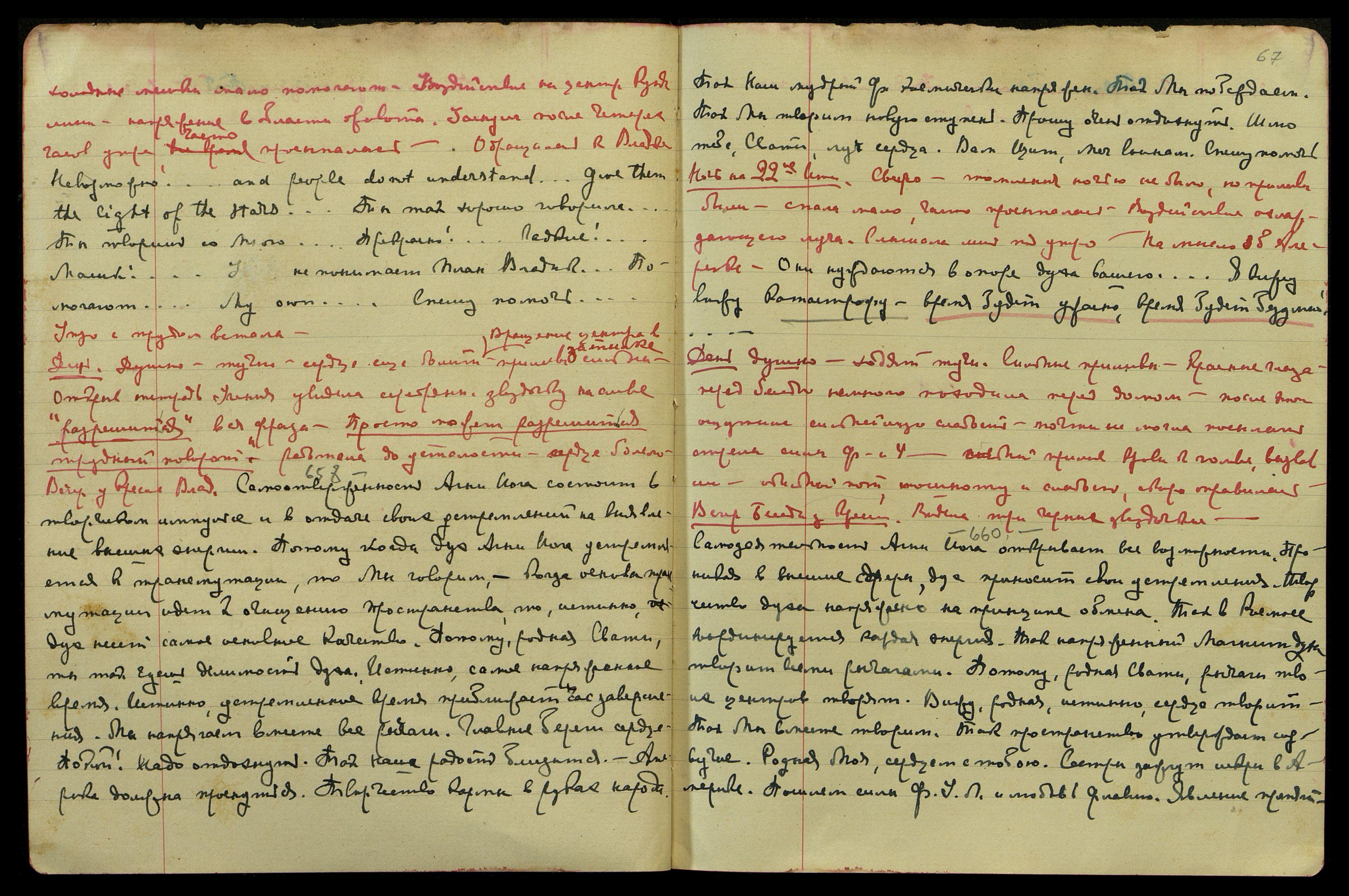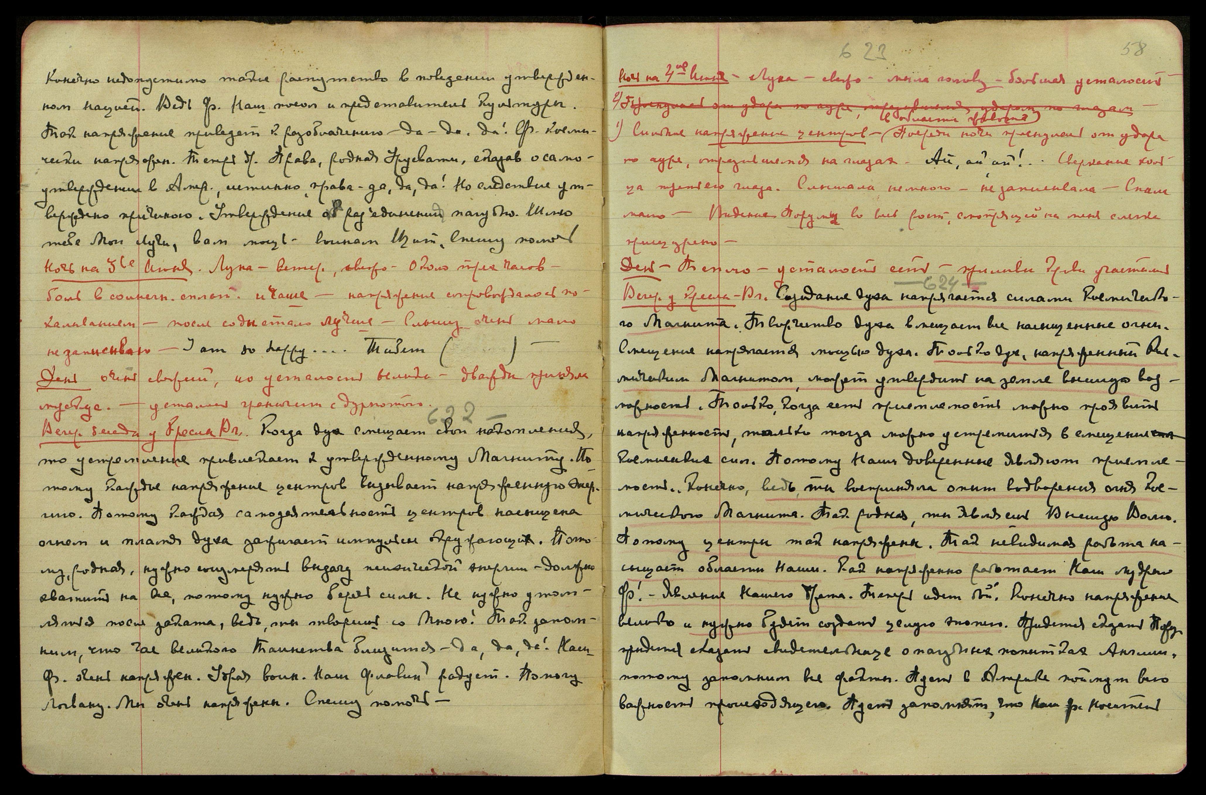 Ночь на 8-е июня. Луна в второй половине, тепло. Долго не могла заснуть, заснула около 4 часов, ритм вибрации 5/8, ударение на второй. Под утро гол[ос] Уч[ителя]; "Явление дураков нужно допустить... It can stupid, but the spectacle is necessary. [англ.: Это может быть глупо, но зрелище необходимо.]" Поняла, что Ф[уяма] должен быть вознесён мировым сочувствием, и также убедиться в положении в Европе и Америке. "It is impossible, the same as to the path of a meteor... [англ.: Это невозможно, так же как и на пути метеорита...]" − ответ на мой вопрос.