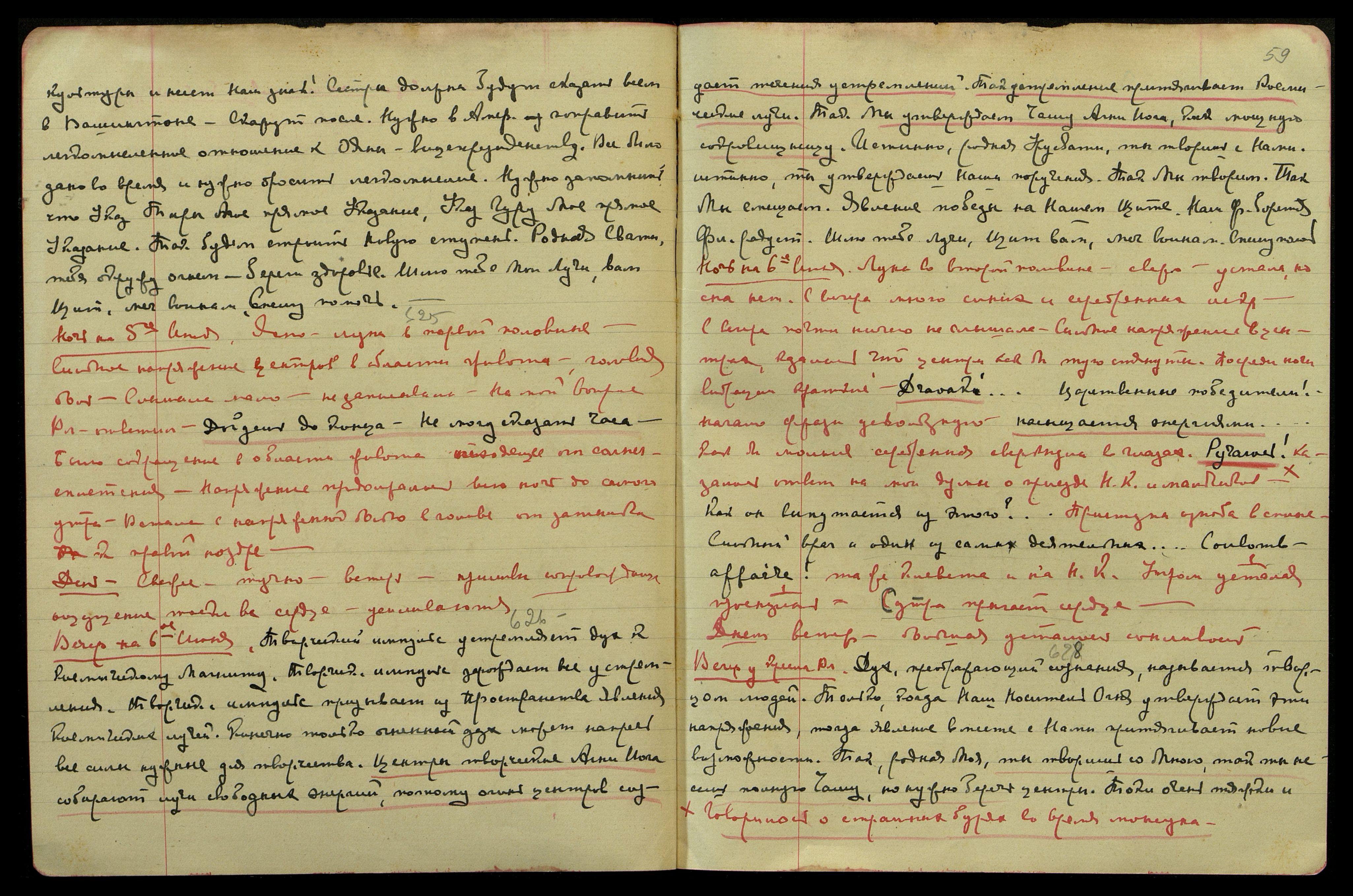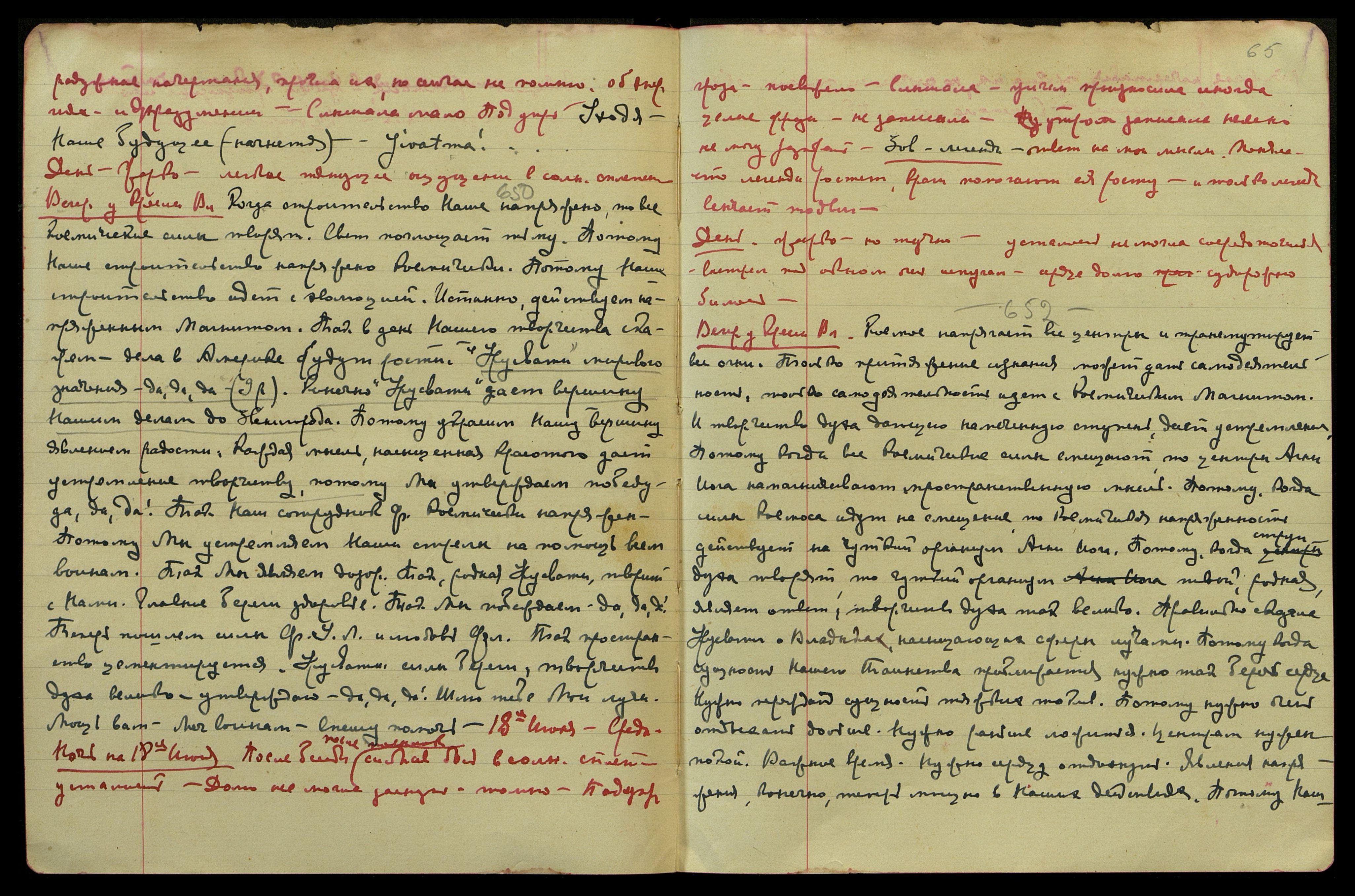 Ночь на 6-ое июня. Луна во второй половине, свежо, устала, но сна нет. С вечера много синих и серебряных искр. С вечера почти ничего не слышала. Сильное напряжение в центрах, казалось, что центры как бы туго стянуты. Посреди ночи вибрации краткие. "Dravaka... Царственные победители!" Начало фразы ускользнуло: "...насыщается энергиями..." Как бы молния серебряная сверкнула в глазах. Ручаюсь! − Казалось, ответ на мои думы о приезде Н.К и мальчиков. Говорилось о страшных бурях во время монсуна. "Как он выпутается из этого?..." Приступы озноба в спине. "Сильный враг и один из самых деятельных... Coulomb, affaire! [англ.: Дело Кулонов!*]" − та же клевета и на Н.К. Утром проснулась, усталая. С утра прыгает сердце.
