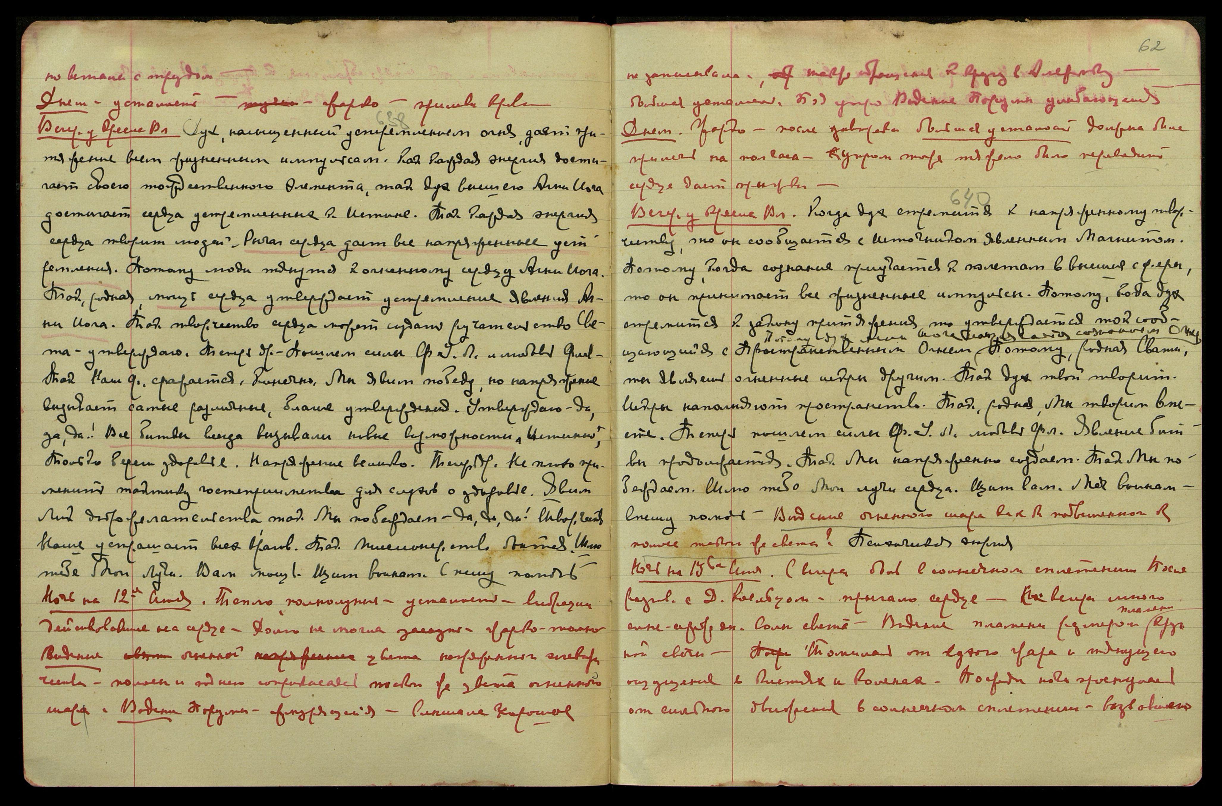 Ночь на 13-ое июня. С вечера боль в солнечном сплетении. После разгов[ора] с Д. Коельцом прыгало сердце. С вечера много сине-серебрян[ых] волн света. Видение пламени размером пламени крупной свечи. Томилась от сухого жара и тянущего ощущения в кистях и коленях. Посреди ночи проснулась от сильного движения в солнечном сплетении, вызвавшего