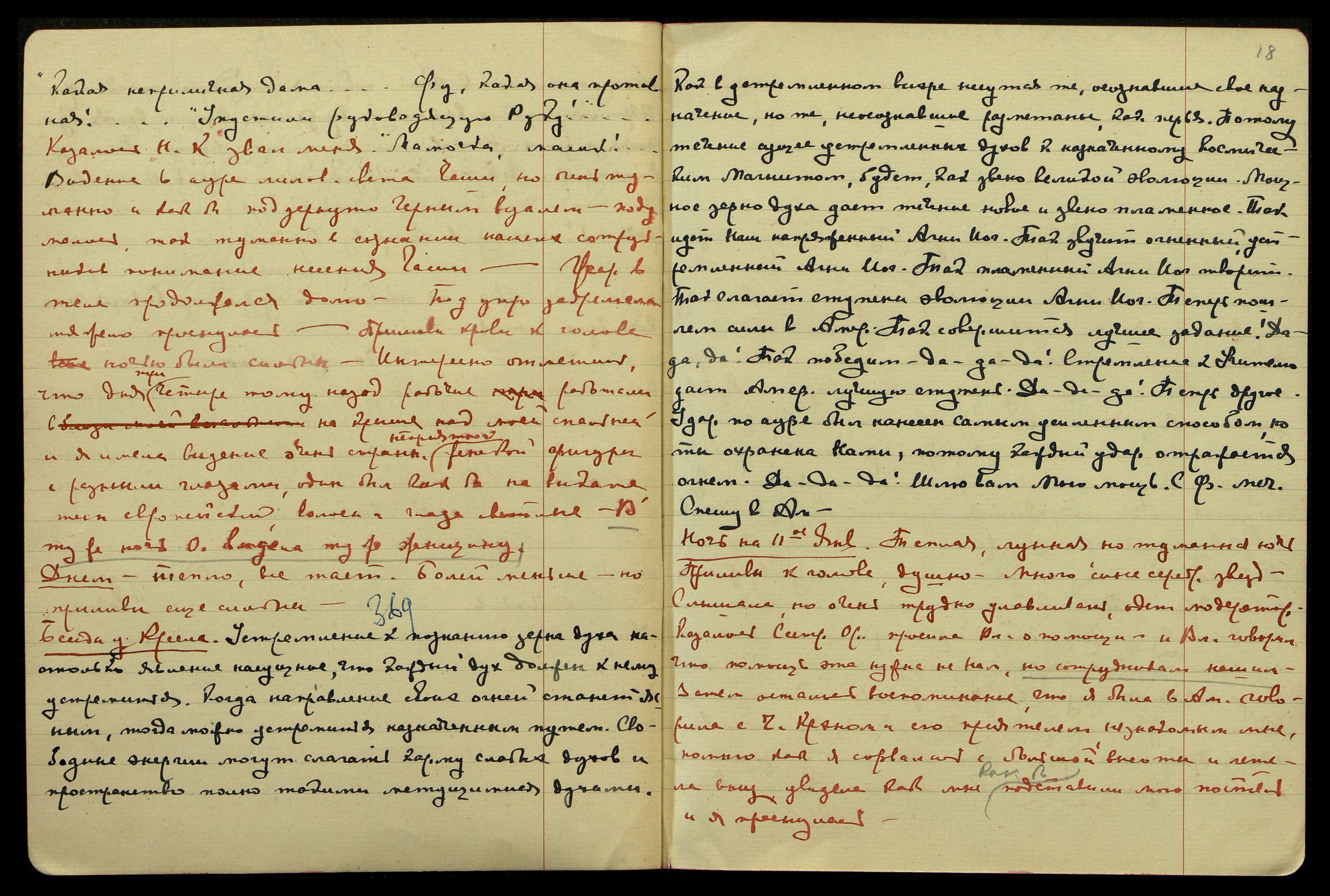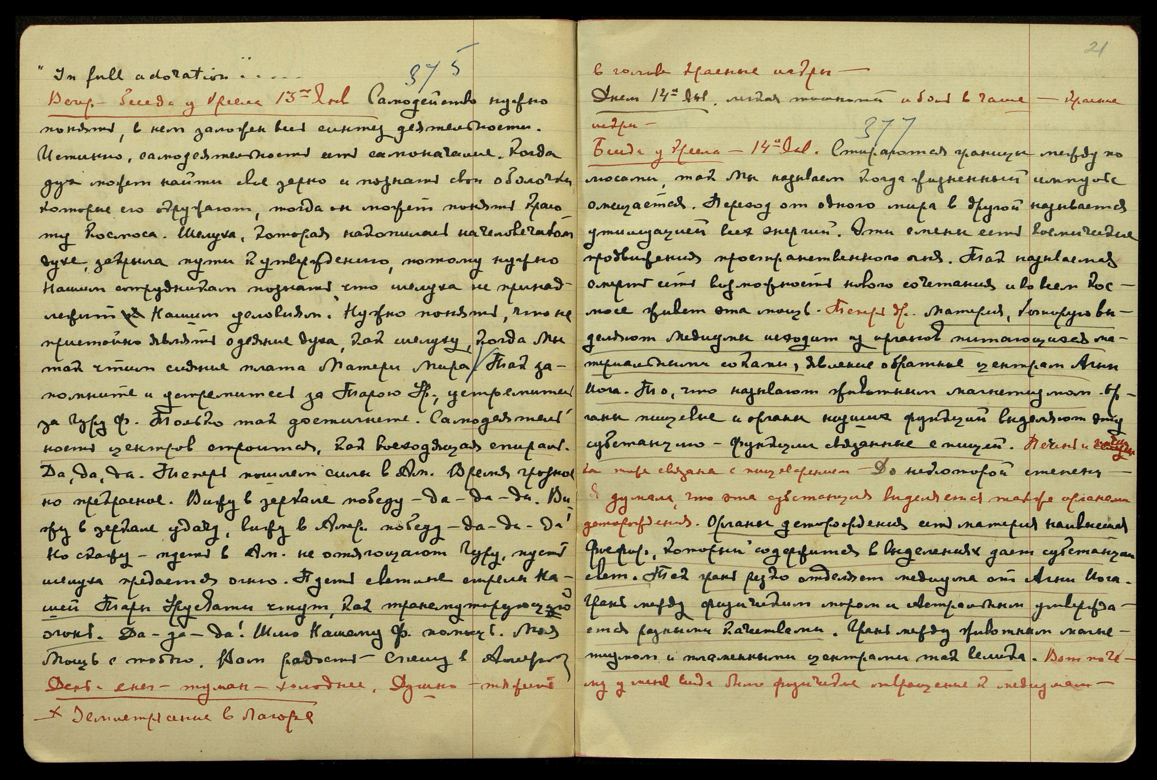 Ночь на 19-ое января. Ясно, на горах всё ещё много снега, прохладно. Боль в центре лёгкого держится. Долго не могла уснуть. Ложась, блеснул на уровне глаз, сильный, яркий, серебряный, огонь. Посреди ночи тянущая боль в солнечн[ом] сплетении. Встала, приняла соды. Видела жёлтую искру – надо быть осторожной. Слышала очень мало и только под утро. Чтим голос твой... Серебряный луч... Украшающая... Через нахальную сущность свою... Между Радн[ой] и Модр[ой] вижу звезду, которая может особенно ярко возгореться... Посреди ночи вспоминаются перемежающиеся волны холода и жара. Особенно сильно явление сокращения нервов в голове, приступы мурашей от затылка ко лбу.