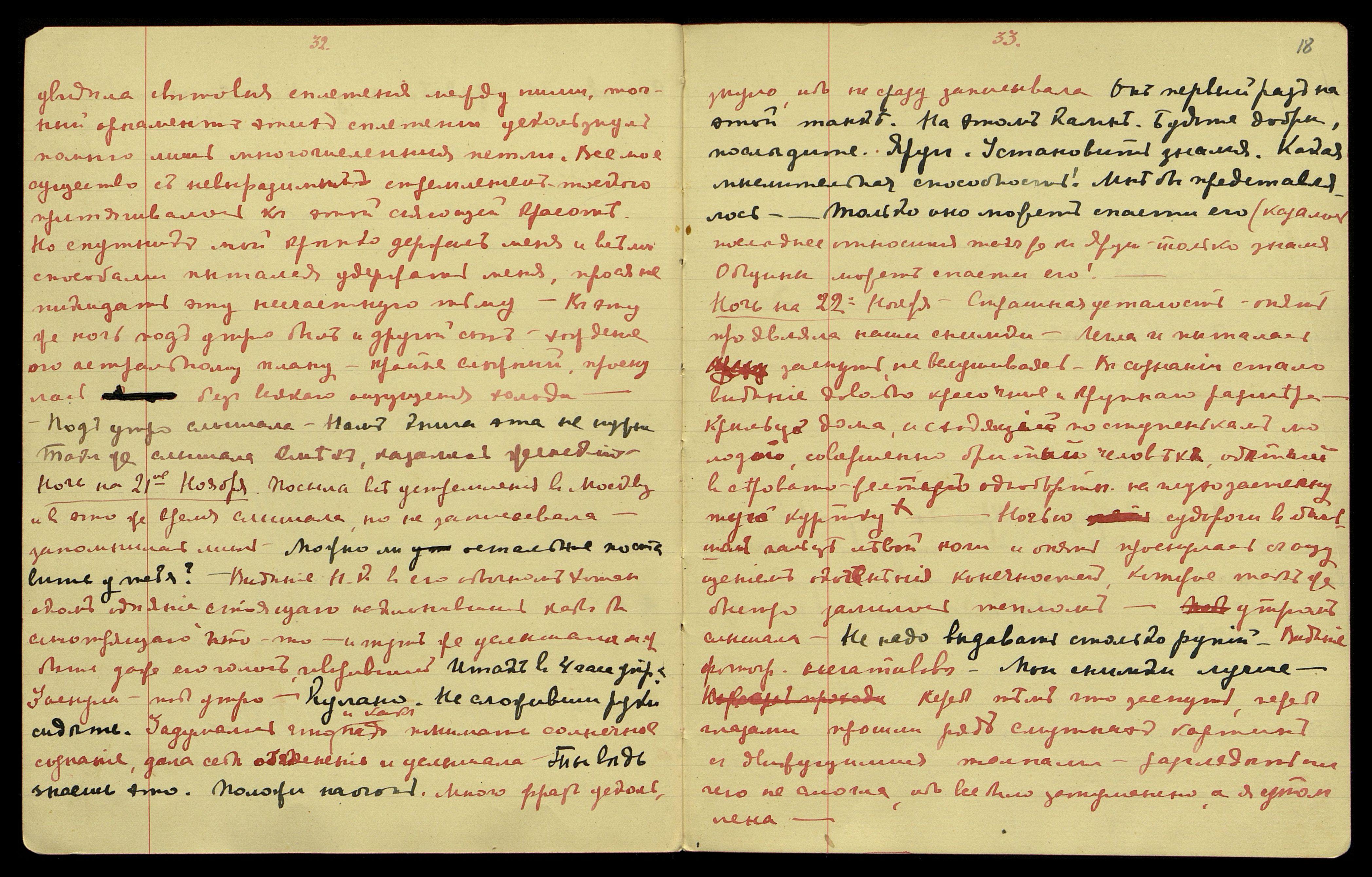 Ночь на 23-ье ноября. Целый день занималась фотографией, устала ужасно. Очень скоро стала видеть радугу, особенно ярко-зелёные и жёлтые тона, много тоньше в соединениях, нежели раньше. Держалась довольно долго. Слышала немного, скоро заснула. "Но своим одним духом, это большое достижение. Пламя соединения лежит в космической..." Неясная запись. "Случайная..." − восклицание. "Я (на)хожу сам. История". Под утро слышала многое об аурах, но сейчас смутно помню.