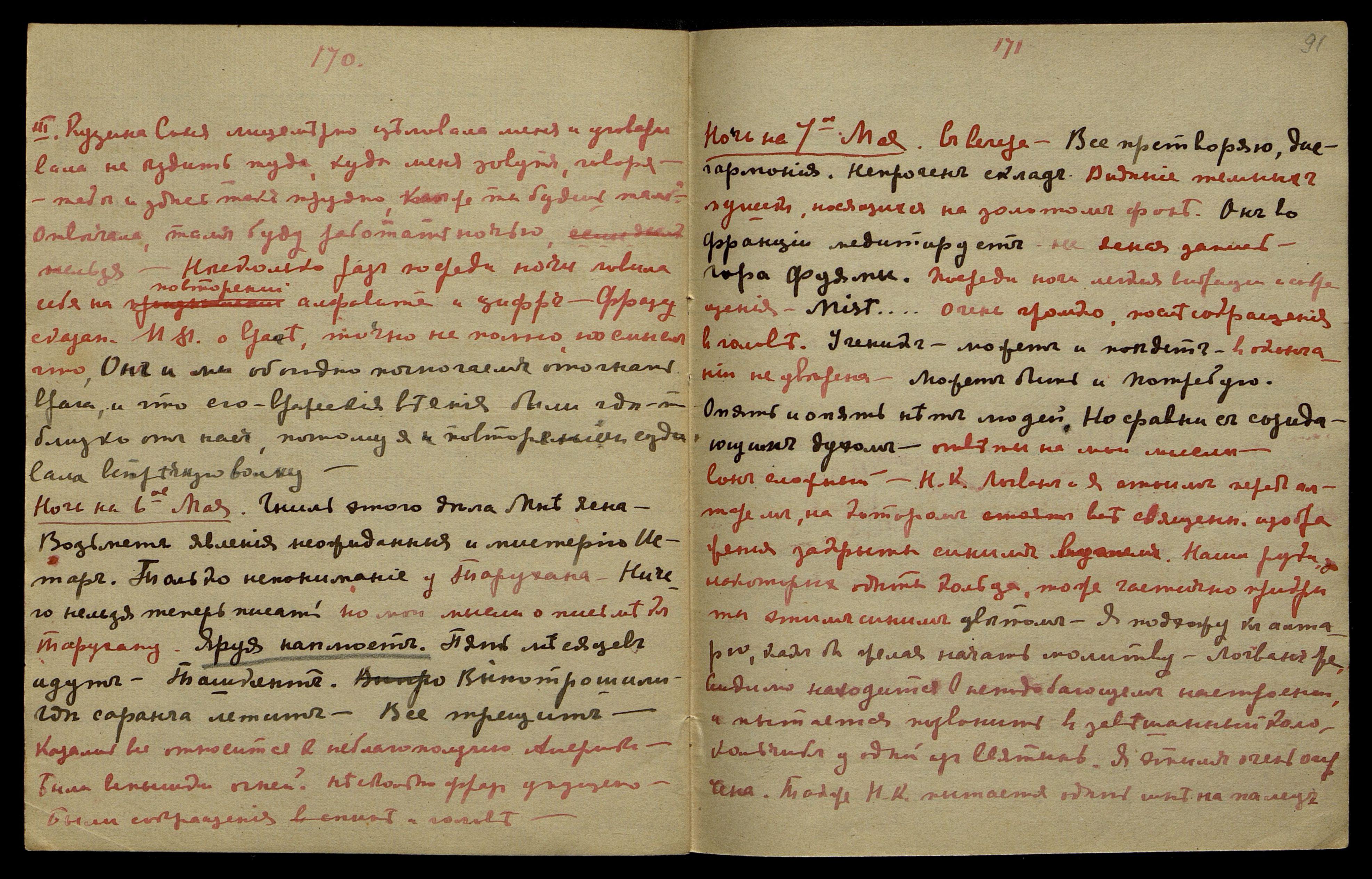 Ночь на 6-ое мая. "Гниль этого дела Мне ясна. Возьмем явления неожидания и мистерию Истар. Только непонимание", − у Тарухана. "Ничего нельзя теперь писать", − на мои мысли о письме к Тарухану. "Яруя наплюет. Пять месяцев идут. Ташкент. Выпотрошили, где саранча летит. Всё трещит". Казалось, всё относится к неблагополучию Америки. Были вспышки огней. Несколько фраз упущено. Были сокращения в голове.