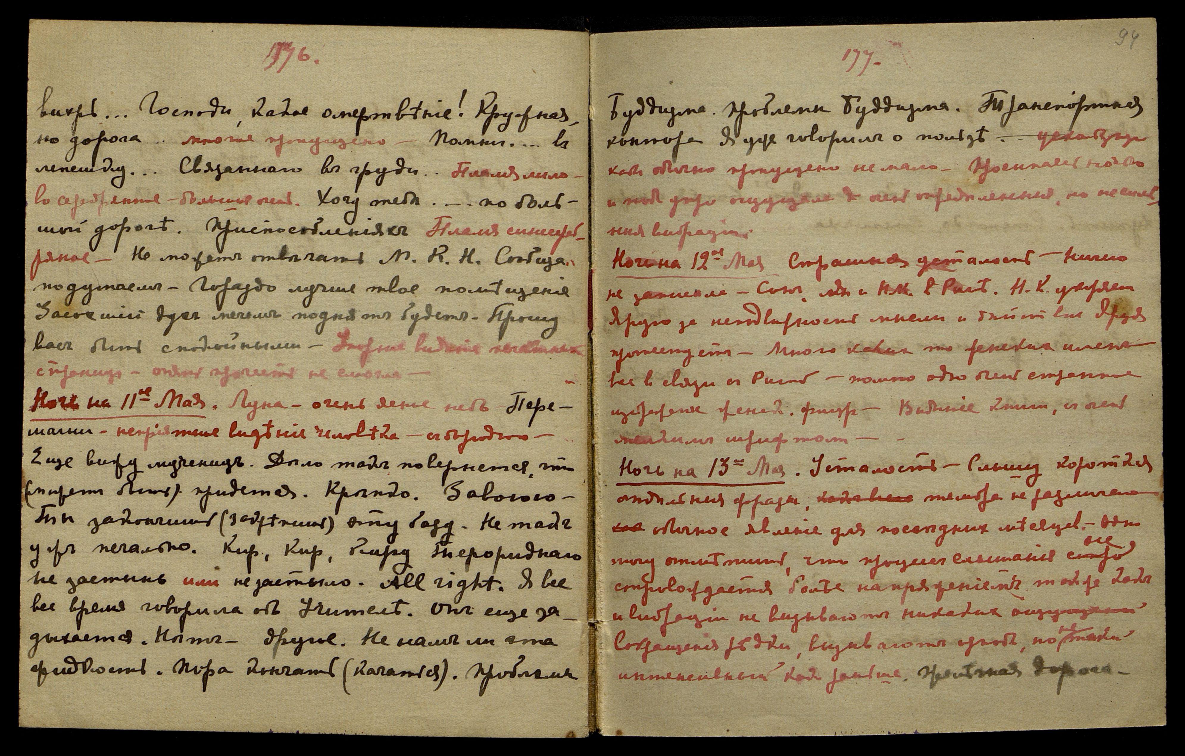 Ночь на 12-ое мая. Страшная усталость. Ничего не записала. Сон. Я и Н[иколай] К[онстантинович] в Риге. Н[иколай] К[онстантинович] укоряет Ярую за неподвижность мысли и действия. Яруя протестует. Много каких-то женских имен, все в связи с Ригой. Помню одно очень странное изображение женской фигуры. Видение книги с очень мелким шрифтом.