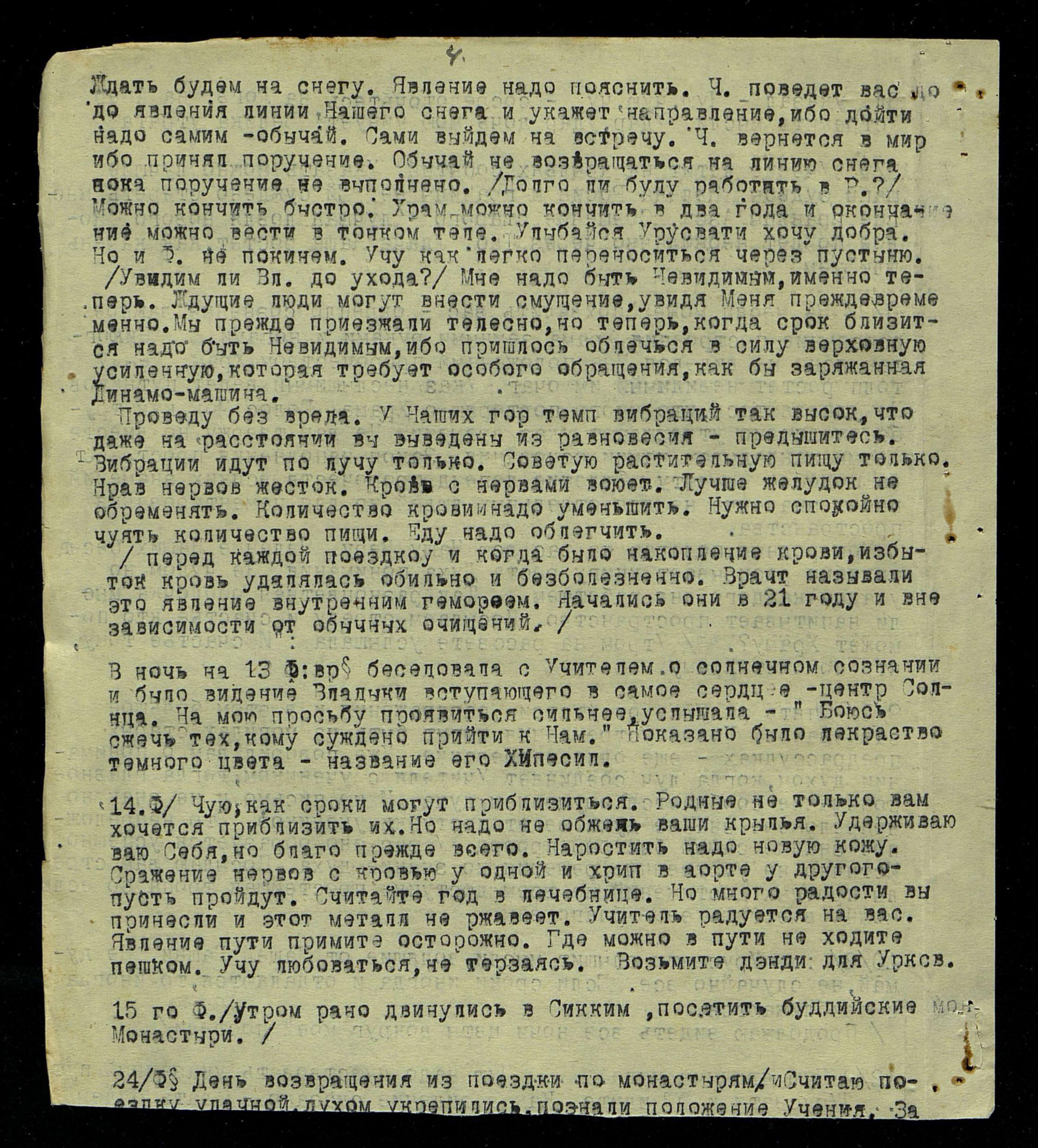 В ночь на 13 февр[аля] беседовала с Учителем о солнечном сознании и было видение Владыки, вступающего в самое сердце − центр Солнца. На мою просьбу проявиться сильнее, услышала: "Боюсь сжечь тех, кому суждено прийти к Нам". Показано было лекарство тёмного цвета, название его − "Хипесил".