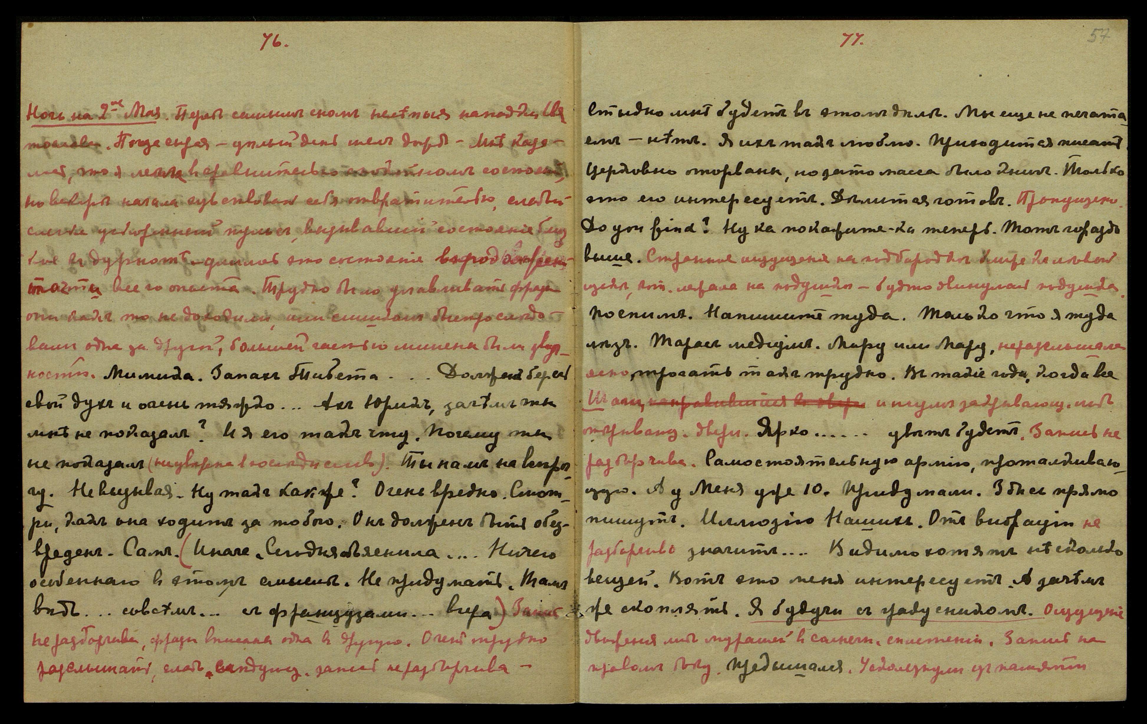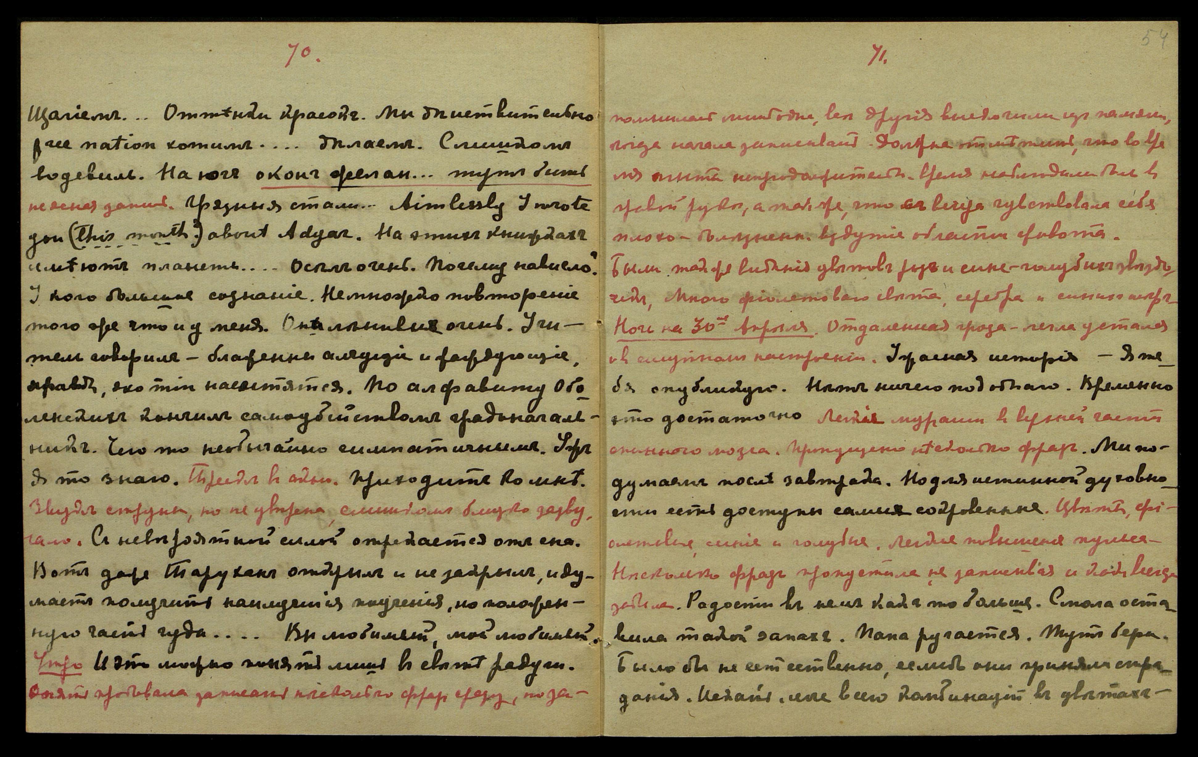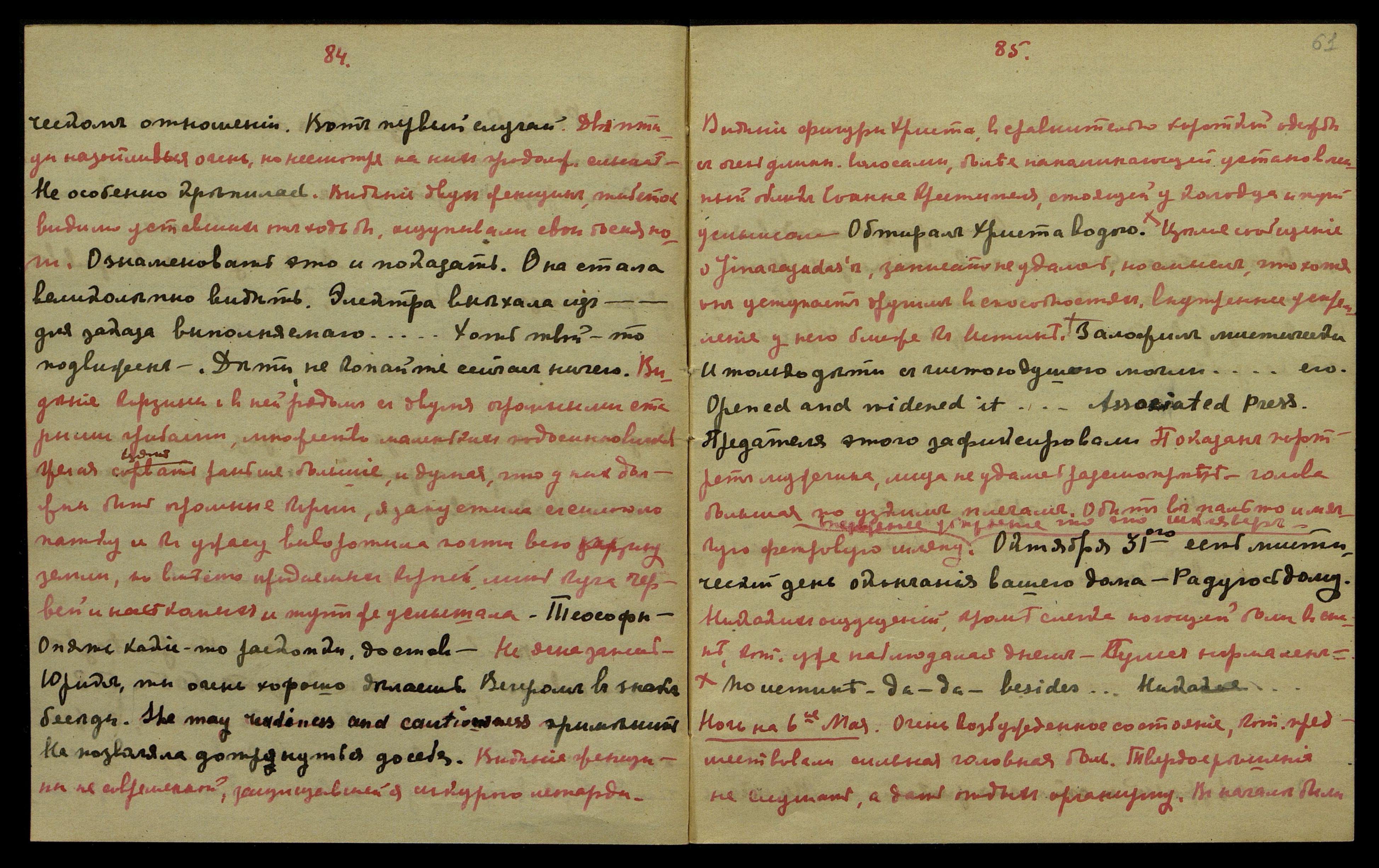 Щагием... Оттенки красок. Мы действительно free nation [англ: свободная нация] хотим... делаем. Слишком водевиль". "На юг окон желан... тут быть...", − неясная запись. "Грязные стали... Aimlessly I wrote you (this months) about Adyar. [англ: Бесцельно я писал вам (в эти месяцы) об Адьяре.] На этих книжках имеют планеты... Осел очень. Почему нависло? У кого больше сознание. Немножко повторение того же, что и у меня. Они ленивые очень. Учитель говорил: "Блаженны алчущие и жаждущие правды, яко тим насытятся". По алфавиту Оболенских кончил самоубийством градоначальник. Чего-то необычайно симпатичным. Уж я-то знаю". Треск в окно. "Приходит ко мне". Звук струны, но не уверена, слишком близко зазвучало. "С невероятной силой отрекается от сна. Вот даже Тарухан открыл и не закрыл, и думает получить наилучшие поучения, но положенную часть чуда... Вы любимый, мой любимый".