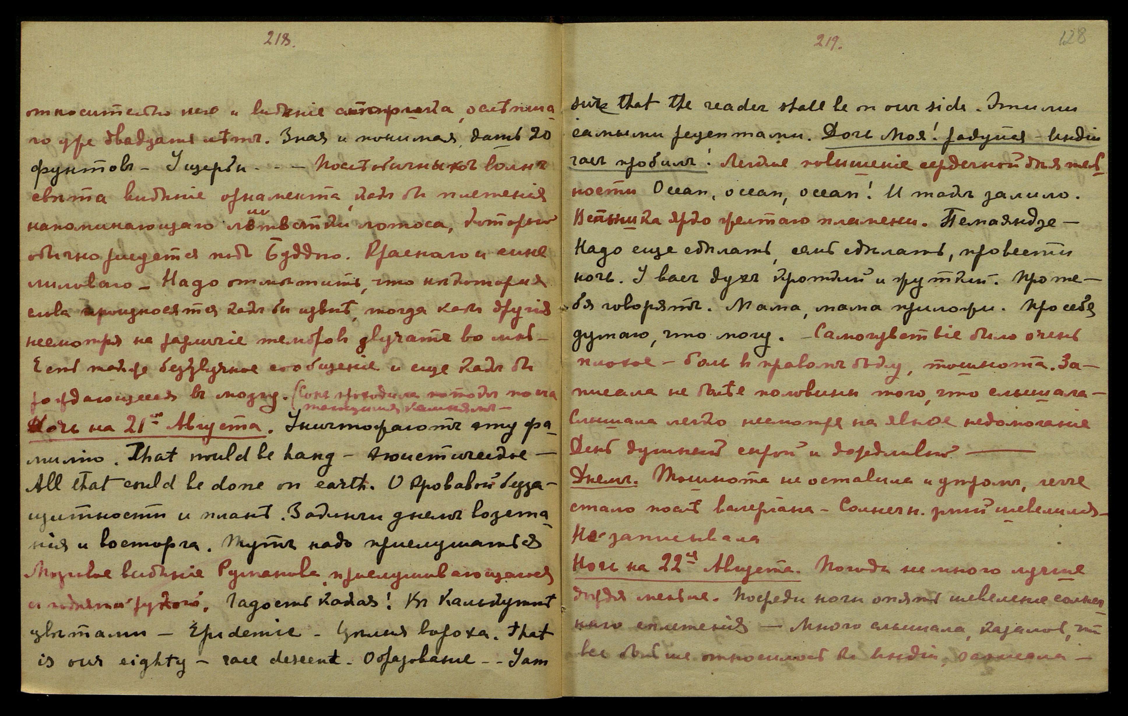 Ночь на 21-ое августа. "Уничтожают эту фамилию. That would be hang [англ: Чтобы повесить] эгоистическое. All that could be done on earth. [англ: Всё, что можно было сделать на земле.] О кровавой беззащитности и план. Закончи днём восстания и восторга. Тут надо прислушаться". Мозговое видение Руманова, прислушивающегося, с поднятой рукой. "Гадость какая! В Калькутте цветами... Epidemie... Целый ворох. That is our eighty race descent. [англ: Это наша восьмидесятая гонка спуска.] Образование... I am sure, that the reader shall be on our side. [англ: Я уверен, что читатель будет на нашей стороне.] Этими самыми рецептами. Дочь Моя! Радуйся − Индии час пробил!" Лёгкое повышение сердечной деятельности. "Ocean, Ocean, Ocean! [англ: Океан!] И так залило". Вспышка ярко-жёлтого пламени. "Пемаяндзе. Надо ещё сделать, семь сделать, провести ночь. У вас дух кроткий и жуткий. Про тебя говорят. Мама, мама, приложи. Про себя думаю, что могу". Самочувствие было очень плохое − боль в правом боку, тошнота. Записала не более половины того, что слышала. Слышала легко, несмотря на явное недомогание. День душный, сырой и дождливый.