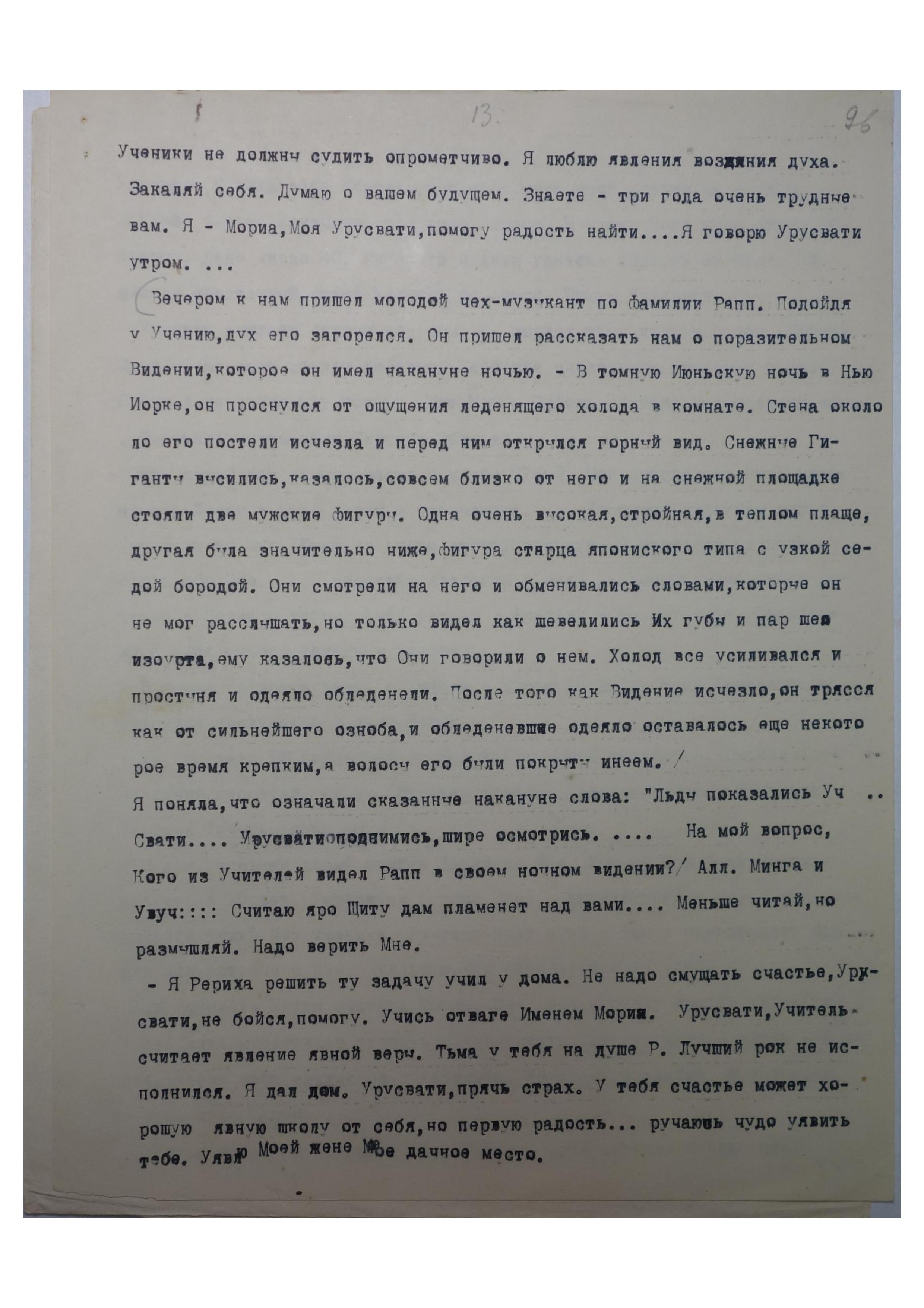 Я поняла, что означали сказанные накануне слова: "Льды показались Уч... Свати... Урусвати, поднимись, шире осмотрись..." (На мой вопрос, кого из Учителей видел Рапп в своем ночном видении?) Алл[ал] Минга и Увуч[ая]. Считаю, яро Щиту дам пламенеть над вами.... Меньше читай, но размышляй. Надо верить Мне.