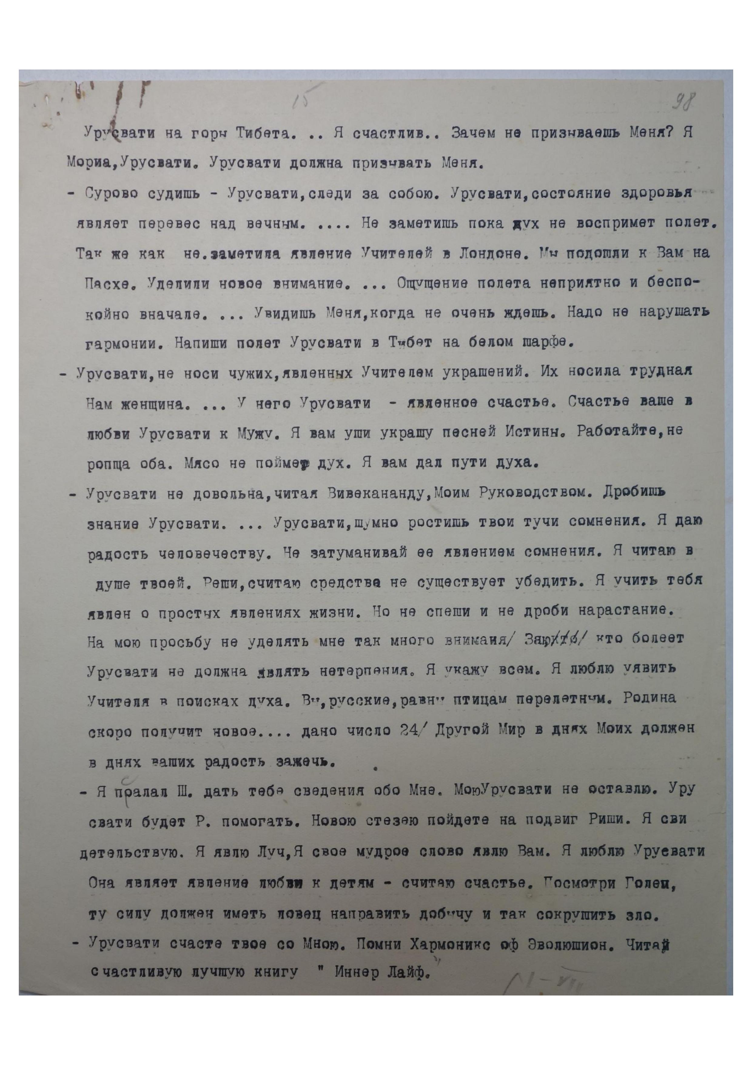 Урусвати недовольна, читая Вивекананду, Моим Руководством. Дробишь знание, Урусвати... Урусвати, шумно растишь твои тучи сомнения. Я даю радость человечеству. Не затуманивай ее явлением сомнения. Я читаю в душе твоей. Реши, считаю средства не существует убедить. Я учить тебя явлен о простых явлениях жизни. Но не спеши и не дроби нарастание. (На мою просьбу не уделять мне так много внимания). Знаю, кто болеет.