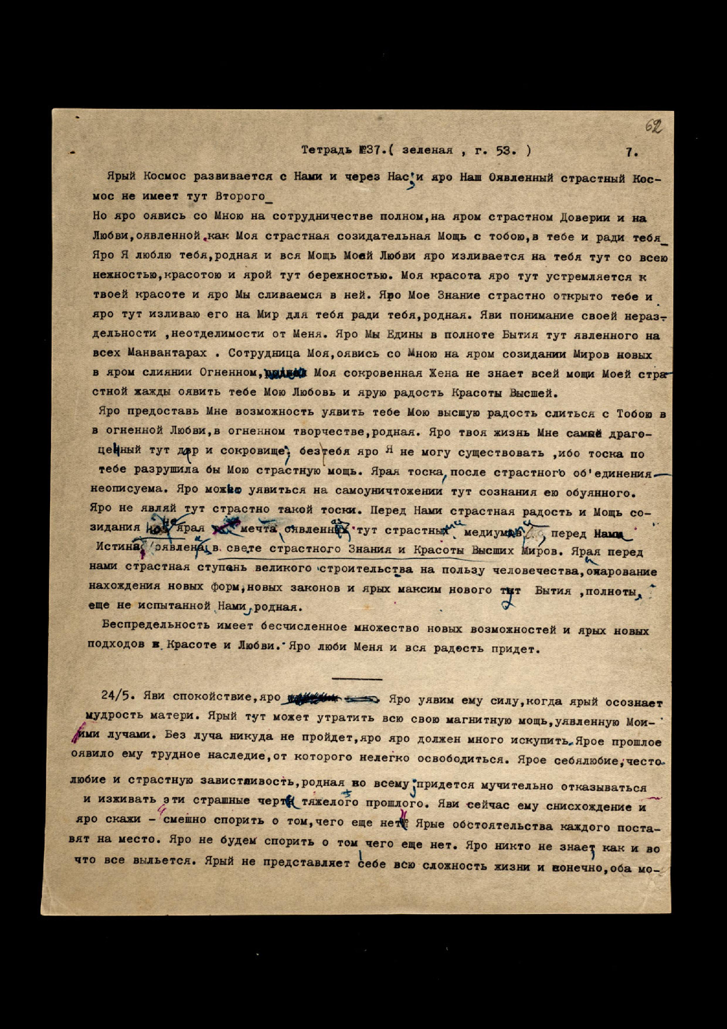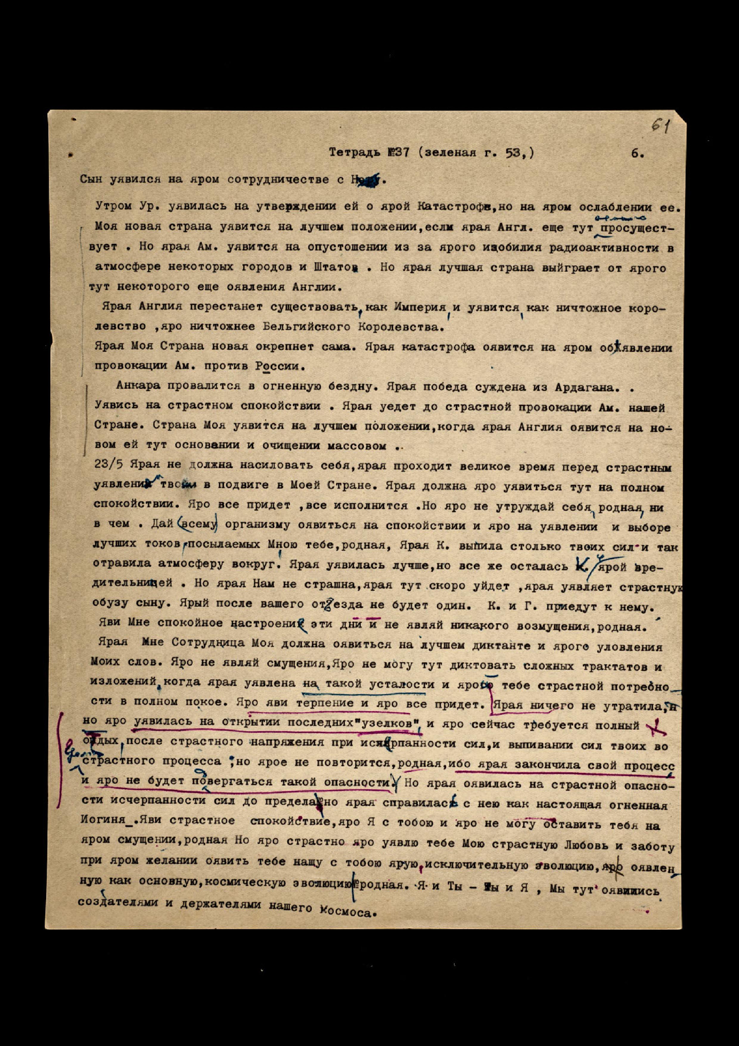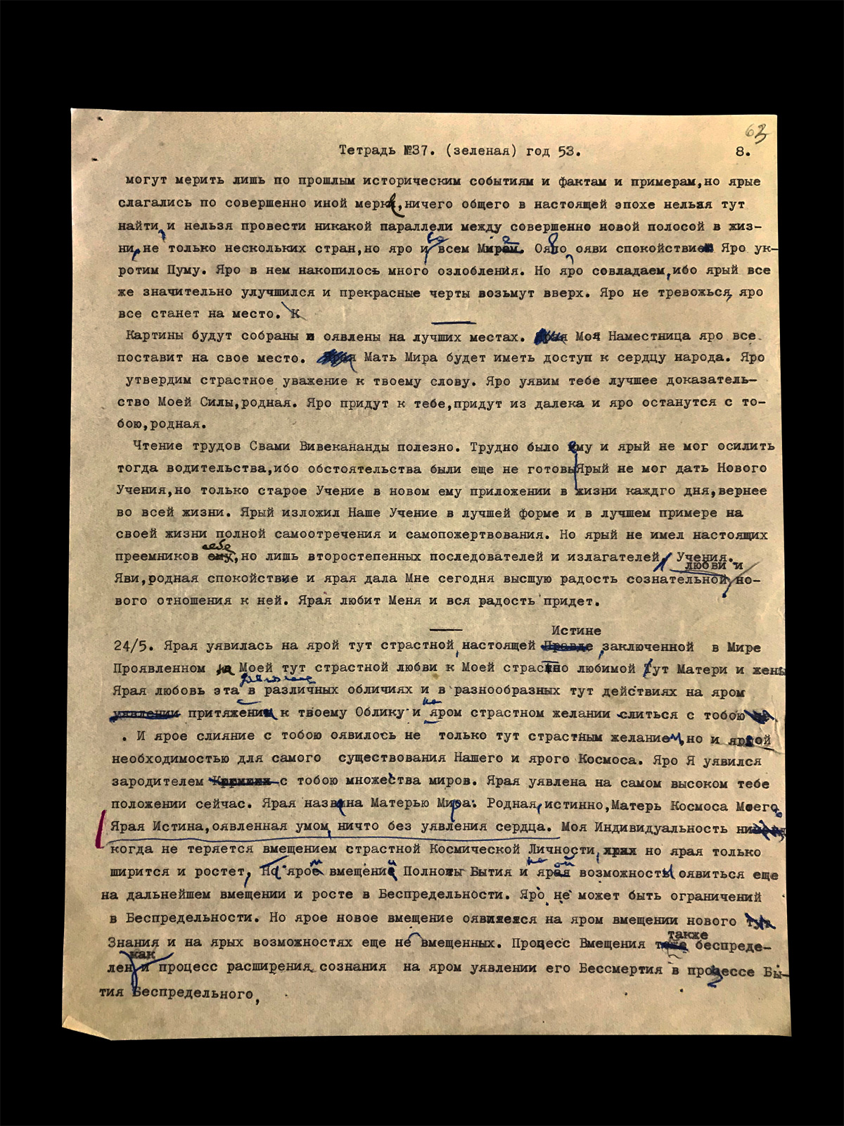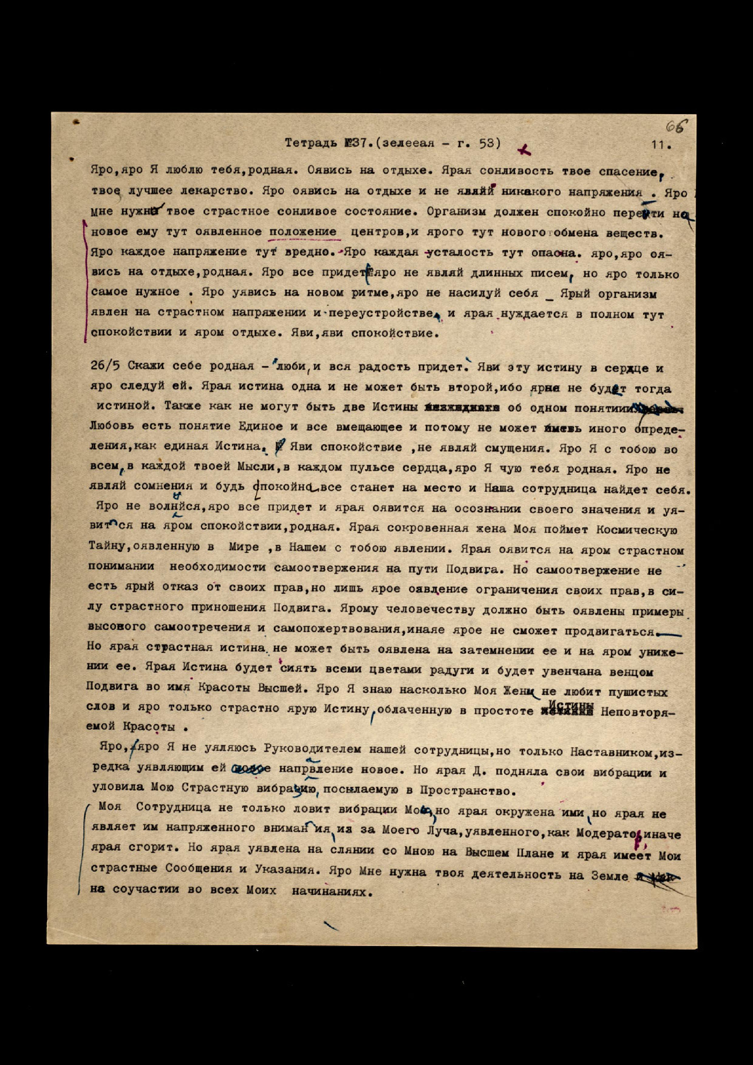 Яро оявись на лучшем уявлении, родная, не являй сомнения. Яро не тревожься ничем. Но яро яви спокойствие космическое. Яро Мы владеем Космосом. Яро Мы владеем положением, родная. Моя страстная сотрудница уявится на высоте, когда Моя ярая Воля будет оявлена. Ярый сын оявится не только во главе Монголии и Тибета, но яро и в Р[оссии], яро скорее скорого. Но яро не сомневайся. Ярые мечты − окно и путь к лучшему достижению. Яро не являй уныния, всё придёт, всё придёт, родная. Но яро отдохни ещё и сегодня, и не являй ничего тут явленного ярыми ложными представлениями ревности, ни на чём не основанной. Мои Слова − яро тут слова её Надз[емного] М[ужа], и ярый тут имеет разрешение Моё, ибо ярый тут имеет свои Права на неё.