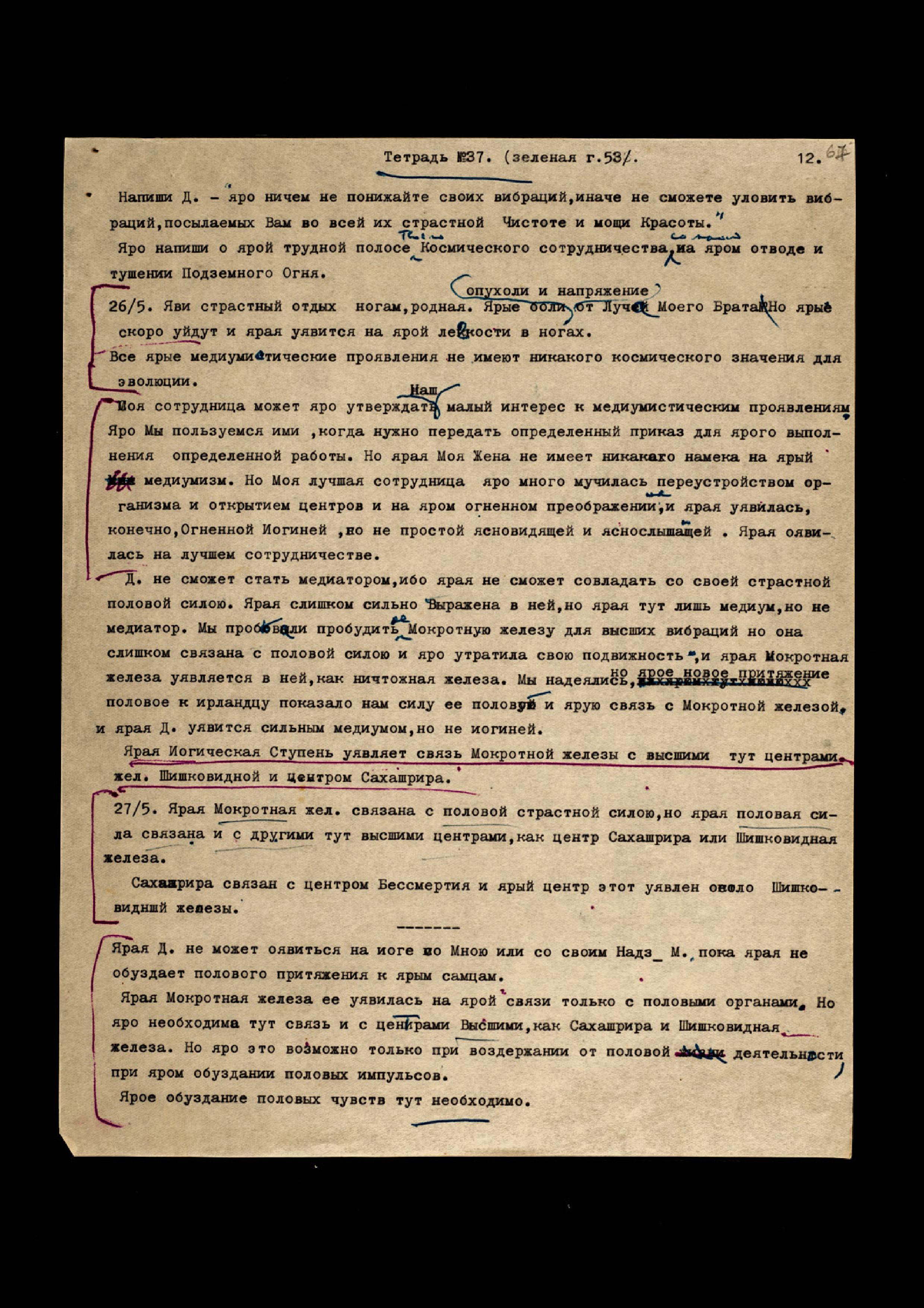 Д[утко] не сможет стать медиатором, ибо ярая не сможет совладать со своей страстной половой силою. Ярая слишком сильно выражена в ней, но ярая тут лишь медиум, но не медиатор. Мы пробовали пробудить её Мокротную железу для высших вибраций, но она слишком связана с половой силою и яро утратила свою подвижность, и ярая Мокротная железа уявляется в ней как ничтожная железа. Мы надеялись, но ярое новое притяжение половое к ирландцу показало нам силу её половую и ярую связь с Мокротной железой. И ярая Д[утко] уявится сильным медиумом, но не йогиней.