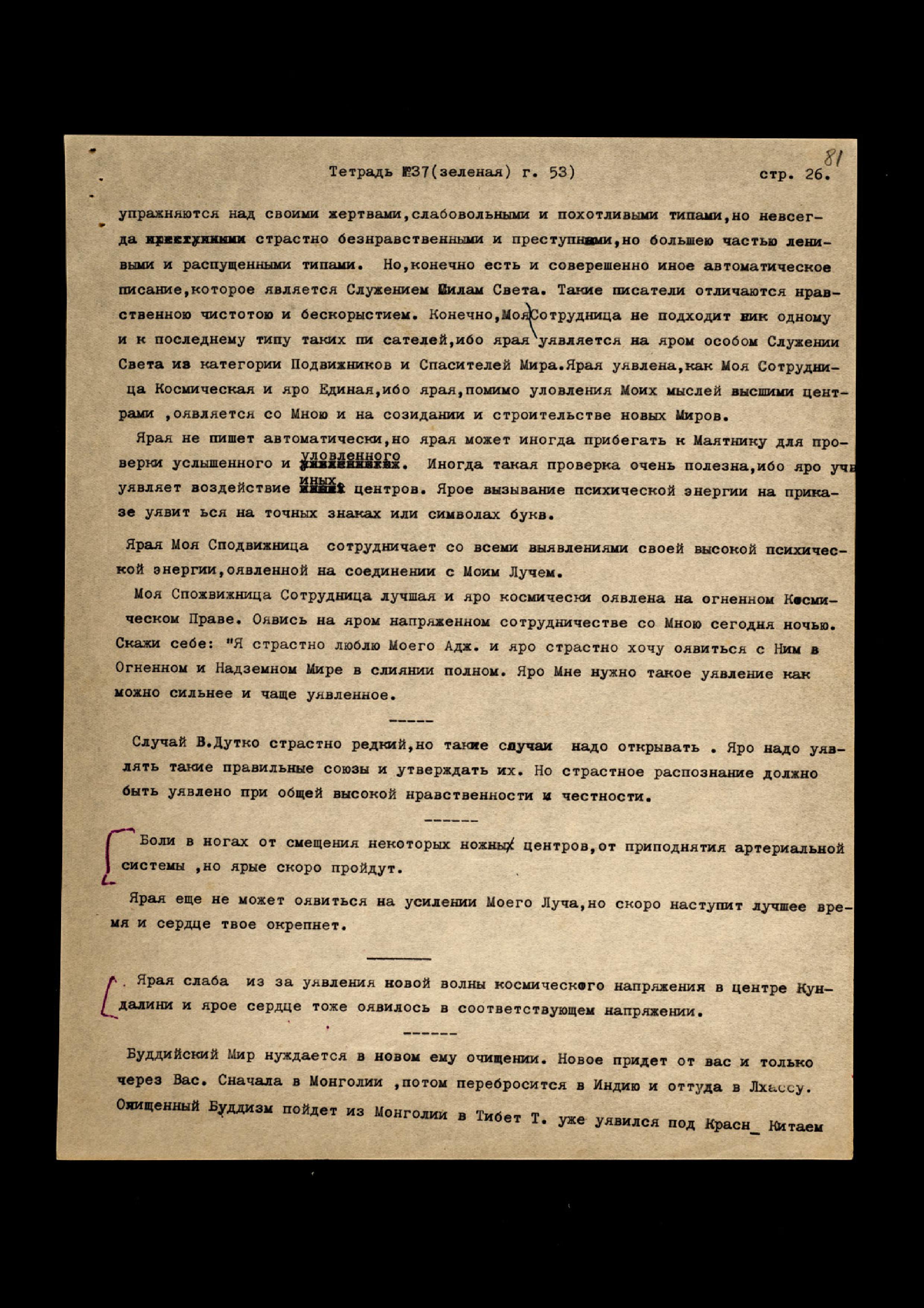 Яро оявись на яром сотрудничестве со Мною. Ярая ступень Мне страстно нужная уже оявилась на яром нарастании Луны. Оявись как новая сотрудница на яром сотрудничестве. Яро ояви ещё немного терпения, и ярая оявится много мудрее и яро более знающей, нежели Моя прежняя Елена из Наггара и Калимпонга. Ярая Моя Косм[ическая] ж[ена], явление Космического опыта страстно яро тут необходимо, и ярая Моя жена лучшая тут космическая сотрудница. Истинно, Моя сокровенная Сотрудница явлена на