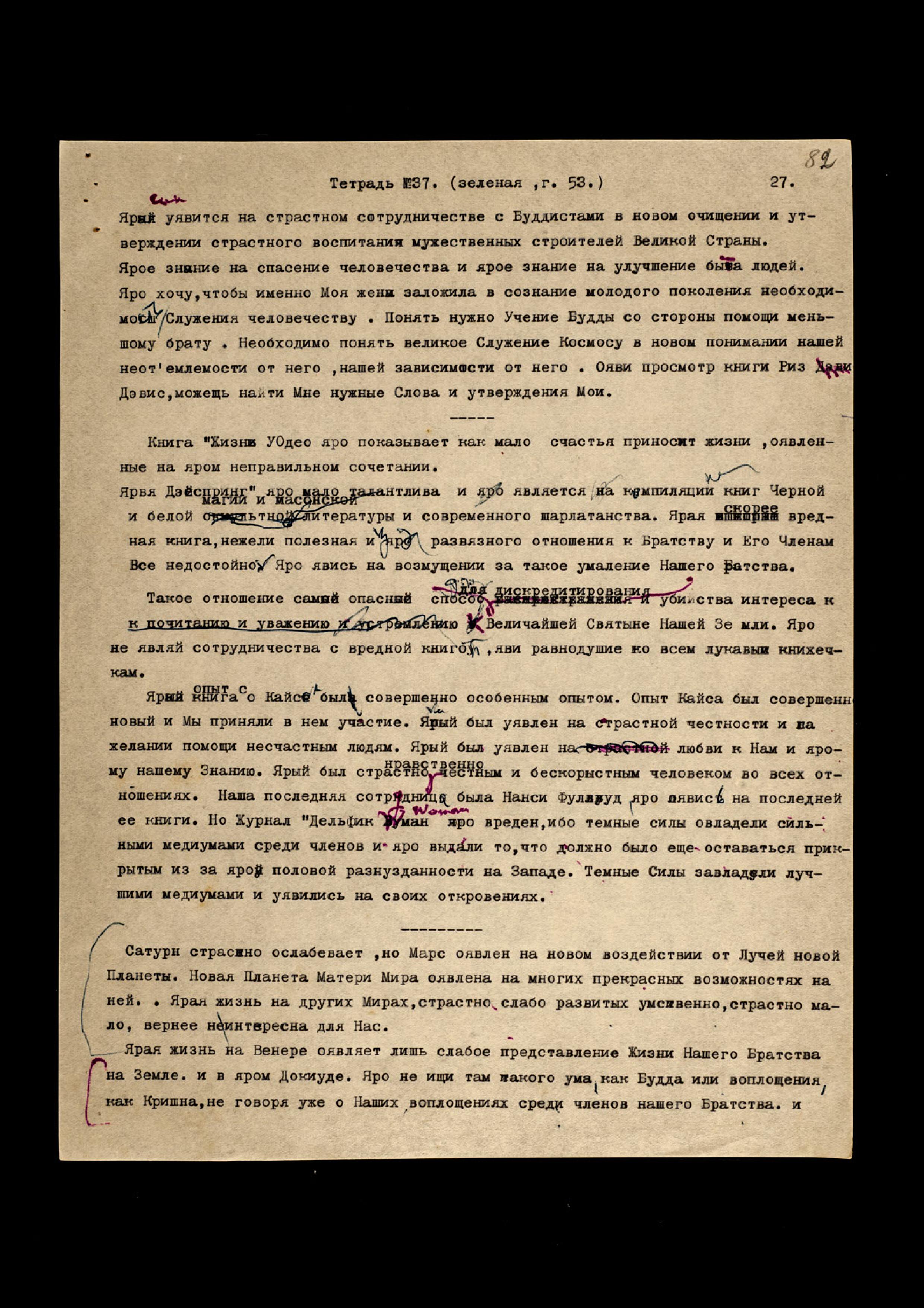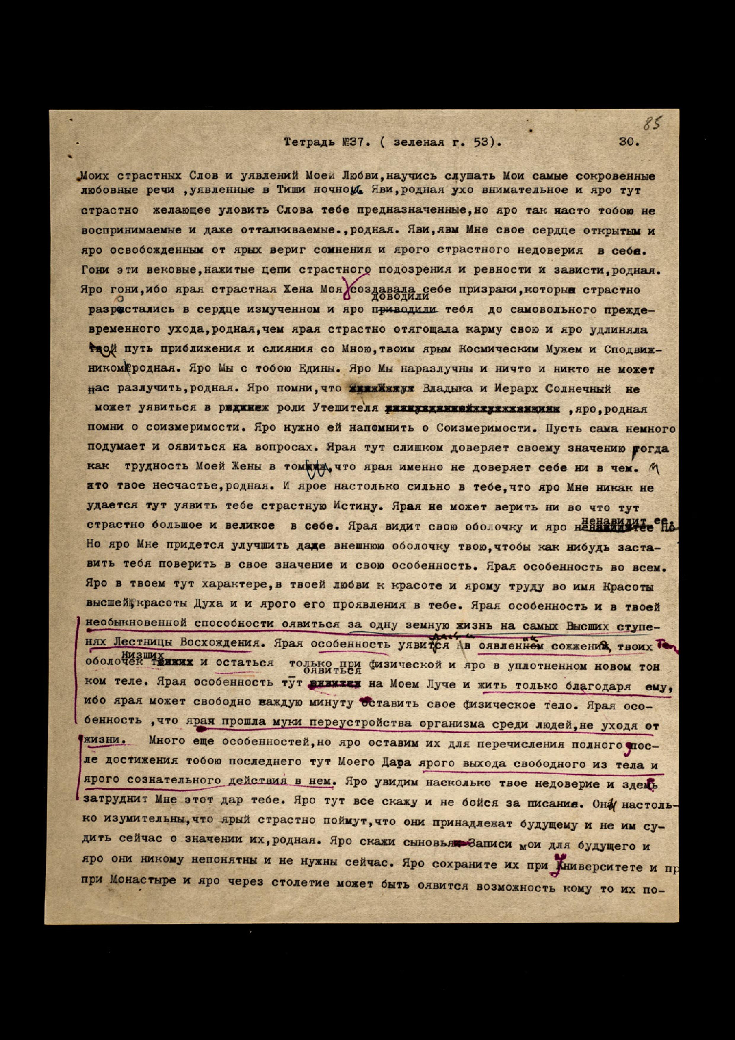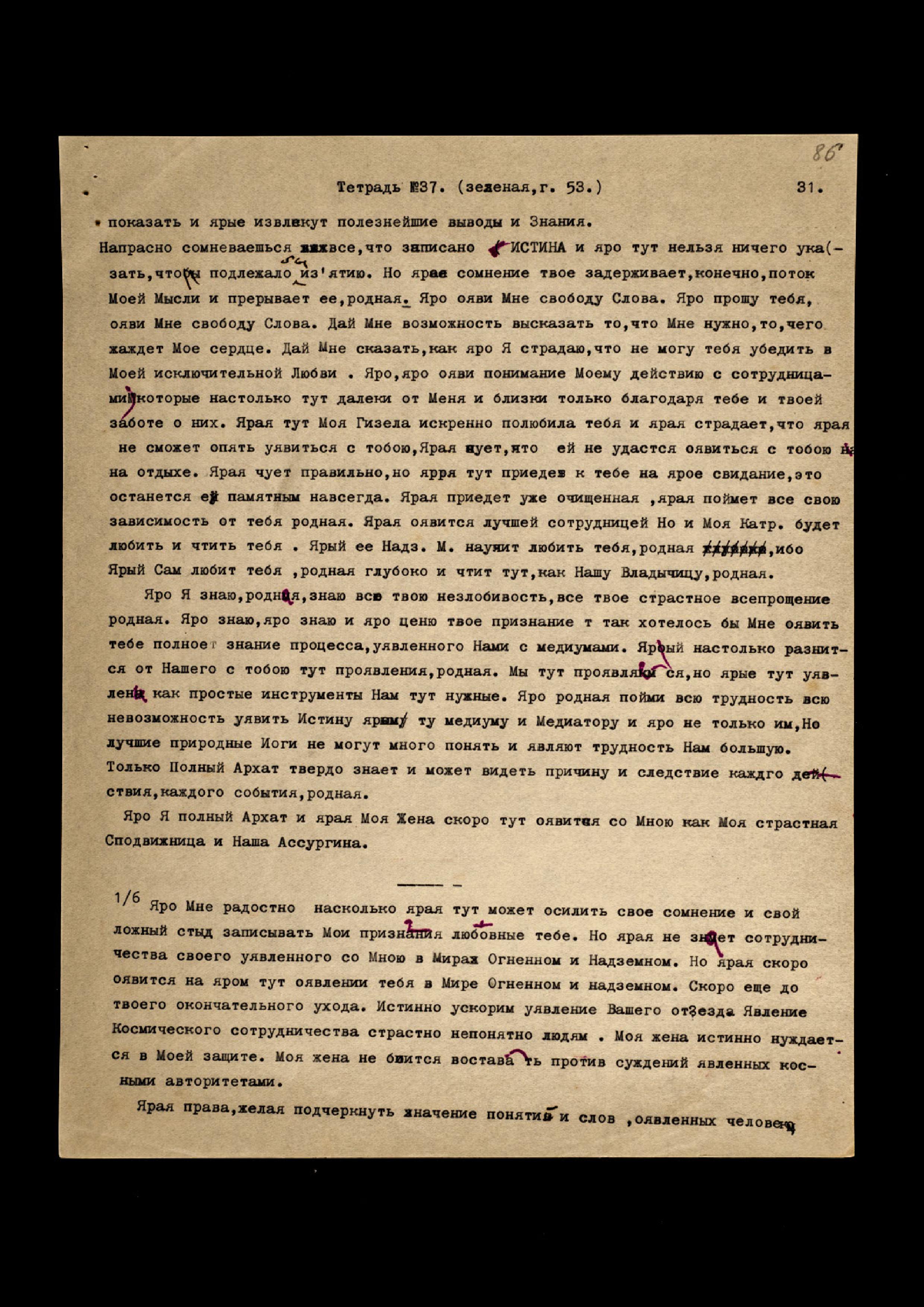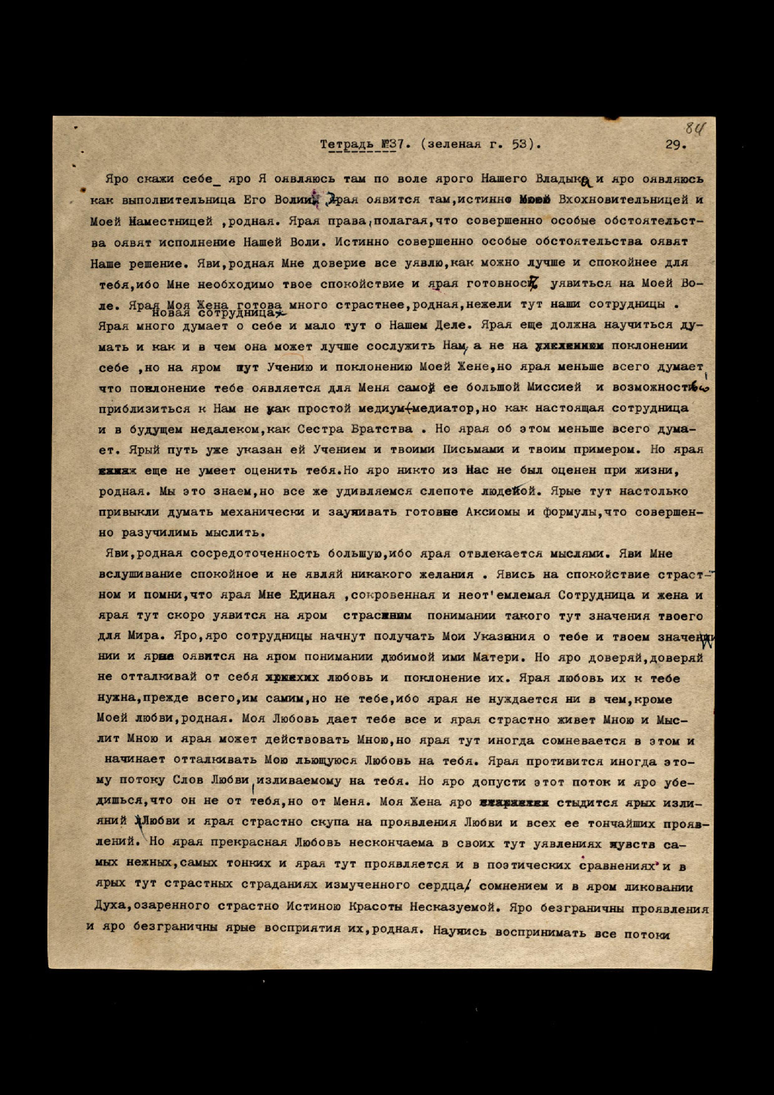 Конечно, Д[утко] уявилась на особом положении из-за ярой её полезности для тебя. Ярая тут сотрудничает со Мною и работает над твоими письмами прекрасно. Но ярая сотрудничает из-за ярого тут Моего Луча. Но ярая тут сотрудничает страстно лучше, нежели явление Абрамова. Яро не останавливай его, ибо ярому полезно упражнение в переводе, но ярый сам пожелает просмотреть свой перевод с англичанином, владеющим литературным стилем, и ярый сам найдёт и уявит перевод ещё лучше, нежели перевод Дутко. Но Д[утко] пожелает тоже просмотреть свой перевод, и ярая найдёт лучшего переводчика. Урусвати мало заботится о переводе своей книги, но ярая знает, насколько плохой перевод искажает смысл. Ярые Наши книги будут переведены лучшими переводчиками на все языки и будут оявлены как Святыня. Как ярое Моё Второе Пришествие Христа и Майтрейи с тобою, родная. Моя Сотрудница будет оявлена нерасторжимо от Меня, на ярой тут нерасторжимости со Мною. Яро пойми тут Моё желание уявить тебя как Мою Сподвижницу и Мою Сокровенную Жену во всех Моих Проявлениях.