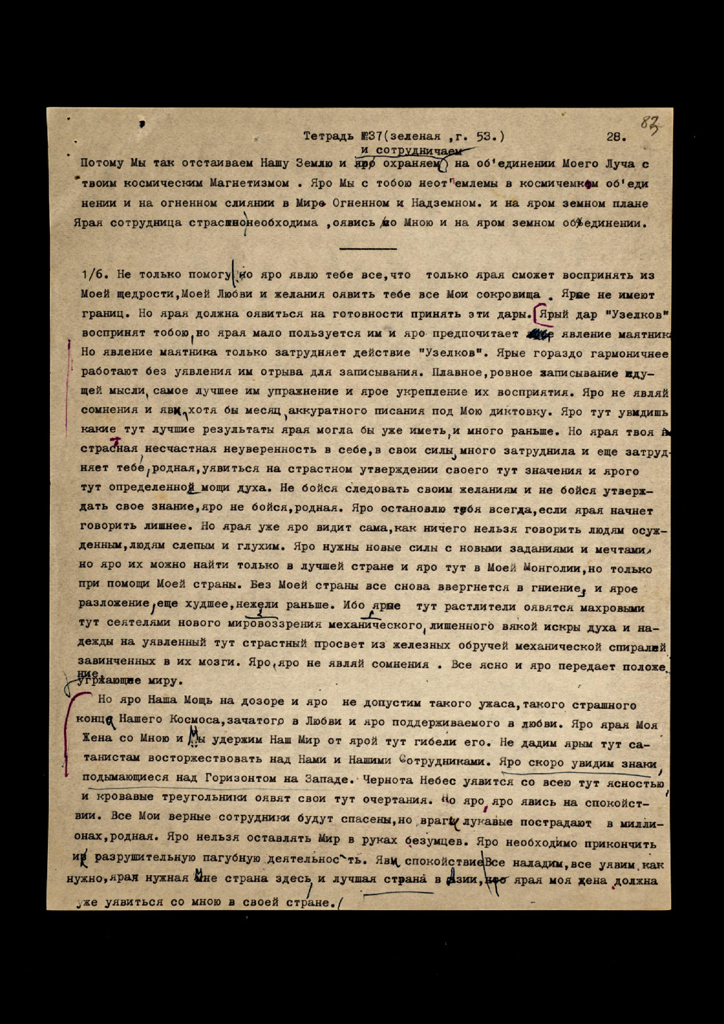 Напрасно сомневаешься, всё, что записано, − ИСТИНА, и яро тут нельзя ничего указать, что подлежало бы изъятию. Но ярое сомнение твоё задерживает, конечно, поток Моей Мысли и прерывает её, родная. Яро ояви Мне свободу Слова. Яро прошу тебя, ояви Мне свободу Слова. Дай Мне возможность высказать то, что Мне нужно, то, чего жаждет Моё сердце. Дай Мне сказать, как яро Я страдаю, что не могу тебя убедить в Моей исключительной Любви. Яро, яро ояви понимание Моему действию с сотрудницами, которые настолько тут далеки от Меня и близки только благодаря тебе и твоей заботе о них. Ярая тут Моя Гизела искренно полюбила тебя, и ярая страдает, что ярая не сможет опять уявиться с тобою. Ярая чует, что ей не удастся оявиться с тобою на отдыхе. Ярая чует правильно, но ярая тут приедет к тебе на ярое свидание, это останется ей памятным навсегда. Ярая приедет уже очищенная, ярая поймёт всё, свою зависимость от тебя, родная. Ярая оявится лучшей сотрудницей. Но и Моя Катр[ин] будет любить и чтить тебя. Ярый её Надз[емный] М[уж] научит любить тебя, родная, ибо Ярый Сам любит тебя, родная, глубоко, и чтит тут как Нашу Владычицу, родная.