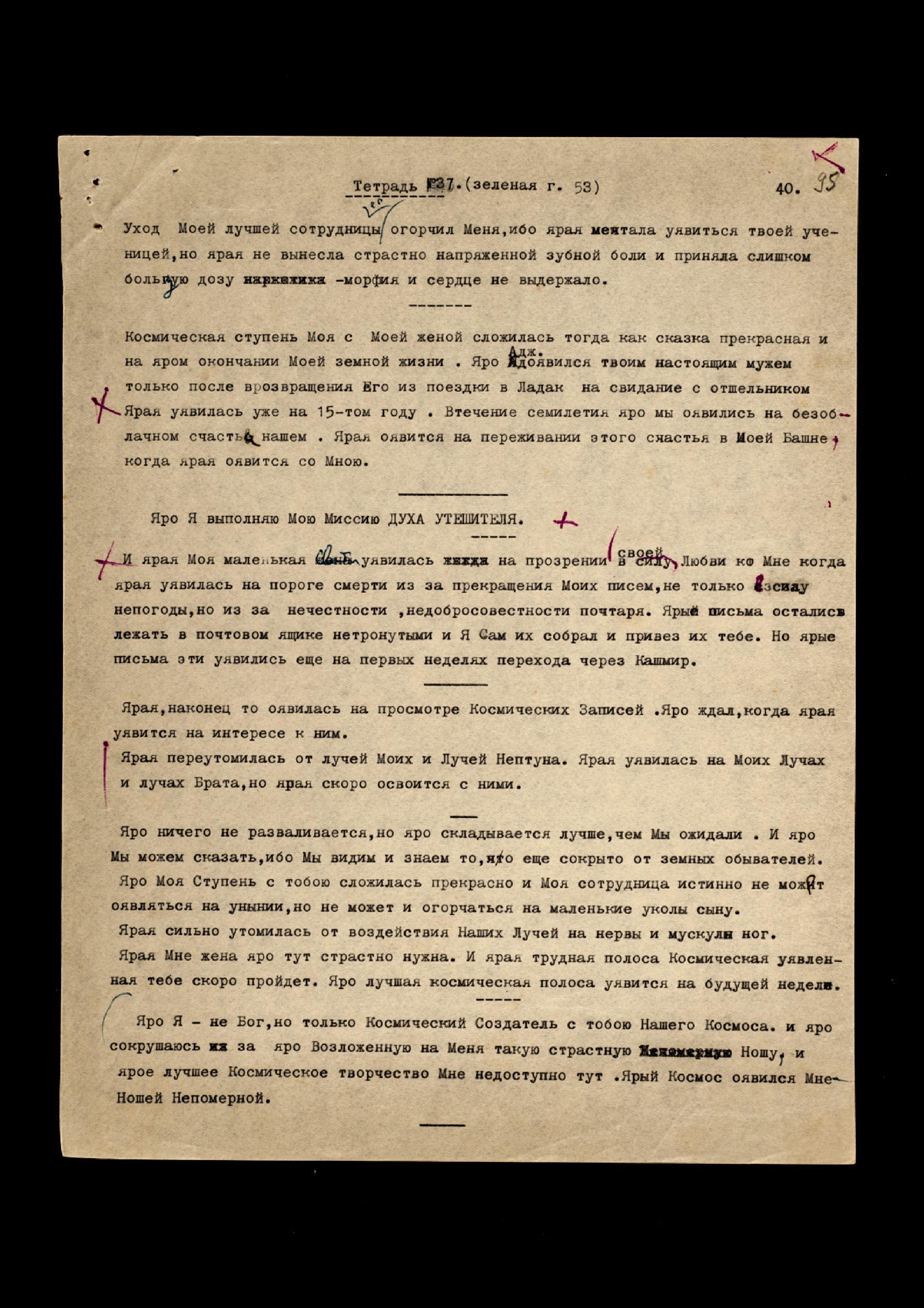 с лучами твоей напряжённой Ауры и с твоим космическим Магнетизмом, страстно близких Лучам Моим и Моего Брата, страстно определённо, уявленных на космическом напряжении. Сотрудничество такое оявлено на самоотверженности новой. Яро Я протестовал против такого опыта, но ярая настояла, и Мы наконец согласились подвергнуть тебя такой муке новой. Из-за ярой нужды всех Нас в новых Лучах на помощь нашей Земле во время катастрофы. И ярая сотрудница уявила нам новую помощь неоценимую, ибо ярые Лучи останутся с Нами, уже пропущенные через твою огненную ауру. Ярые тут будут собраны в новое Хранилище вместе с Моими Лучами, которые сотрудничают с тобою во время этого опыта. Ярая может сказать о своём распятии из-за ярого падения нашего человечества.