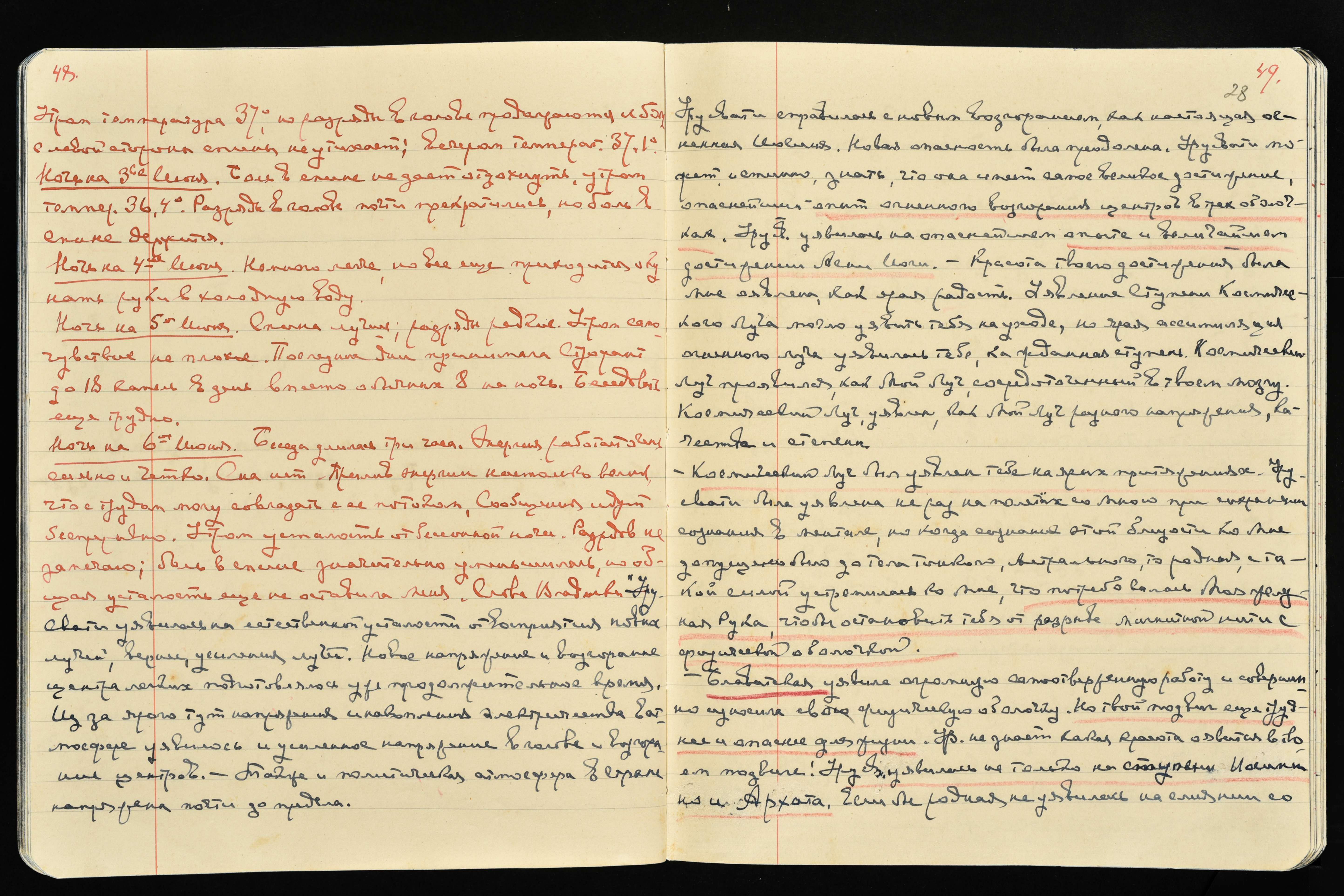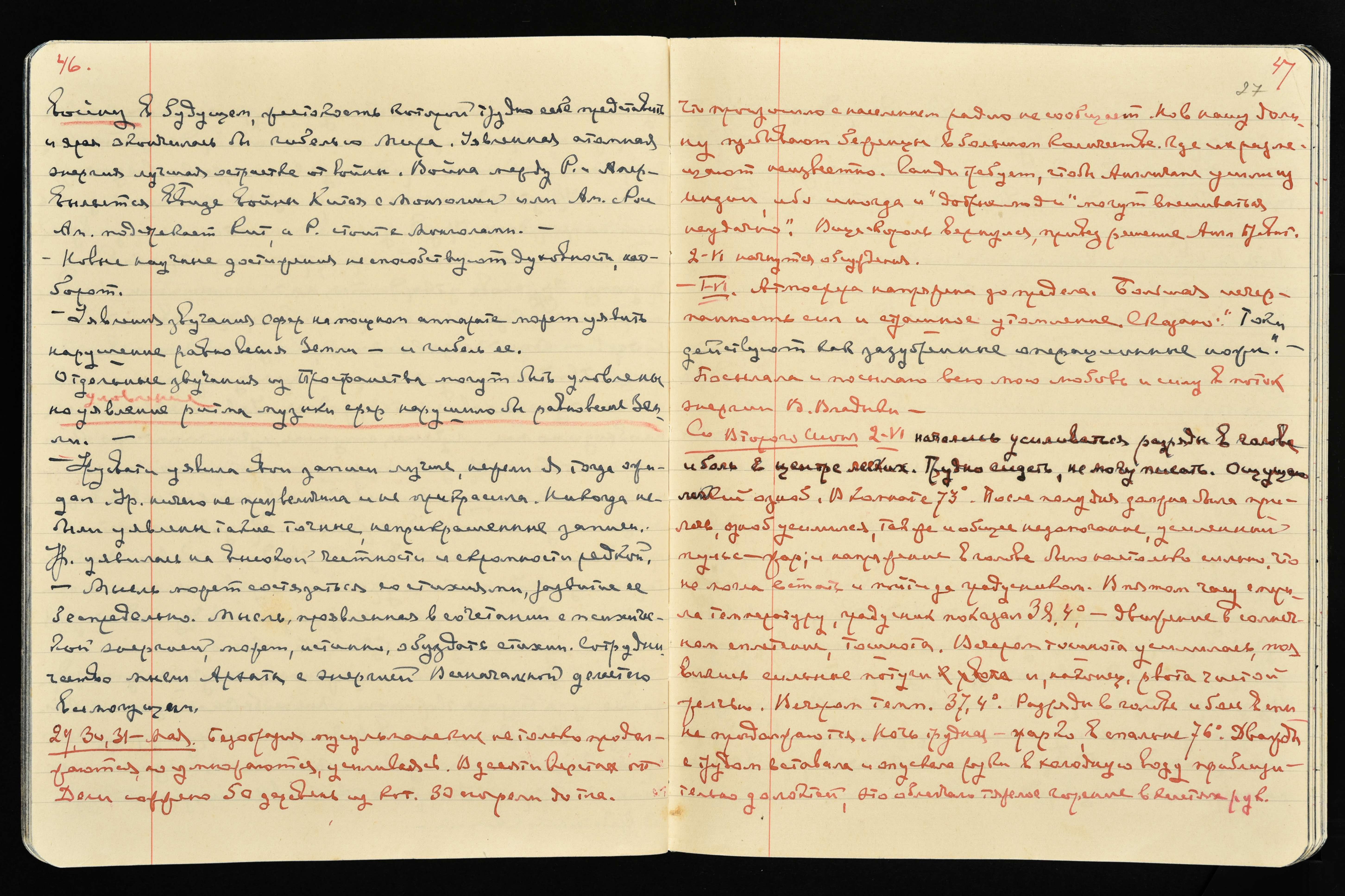 Со второго июня 2-VI начали усиливаться разряды в голове и боль в центре лёгких. Трудно сидеть, не могу писать. Ощущаю лёгкий озноб. В комнате 73[℉. = 22℃]. После полудня должна была прилечь, озноб усилился, также и общее недомогание, усиленный пульс, жар, но напряжение в голове было настолько сильно, что не могла встать и пойти за градусником. В пятом часу смерила температуру, градусник показал 38,4°, движение в солнечном сплетении, тошнота. Вечером тошнота усилилась, появились сильные потуги и, наконец, рвота чистой желчью. Вечером температура 37,4°. Разряды в голове и боль в спине продолжаются. Ночь трудная − жарко, в спальне 76[℉. = 24℃]. Дважды с трудом вставала и опускала руки в холодную воду приблизительно до локтей, это облегчало тяжёлое горение в кистях рук.