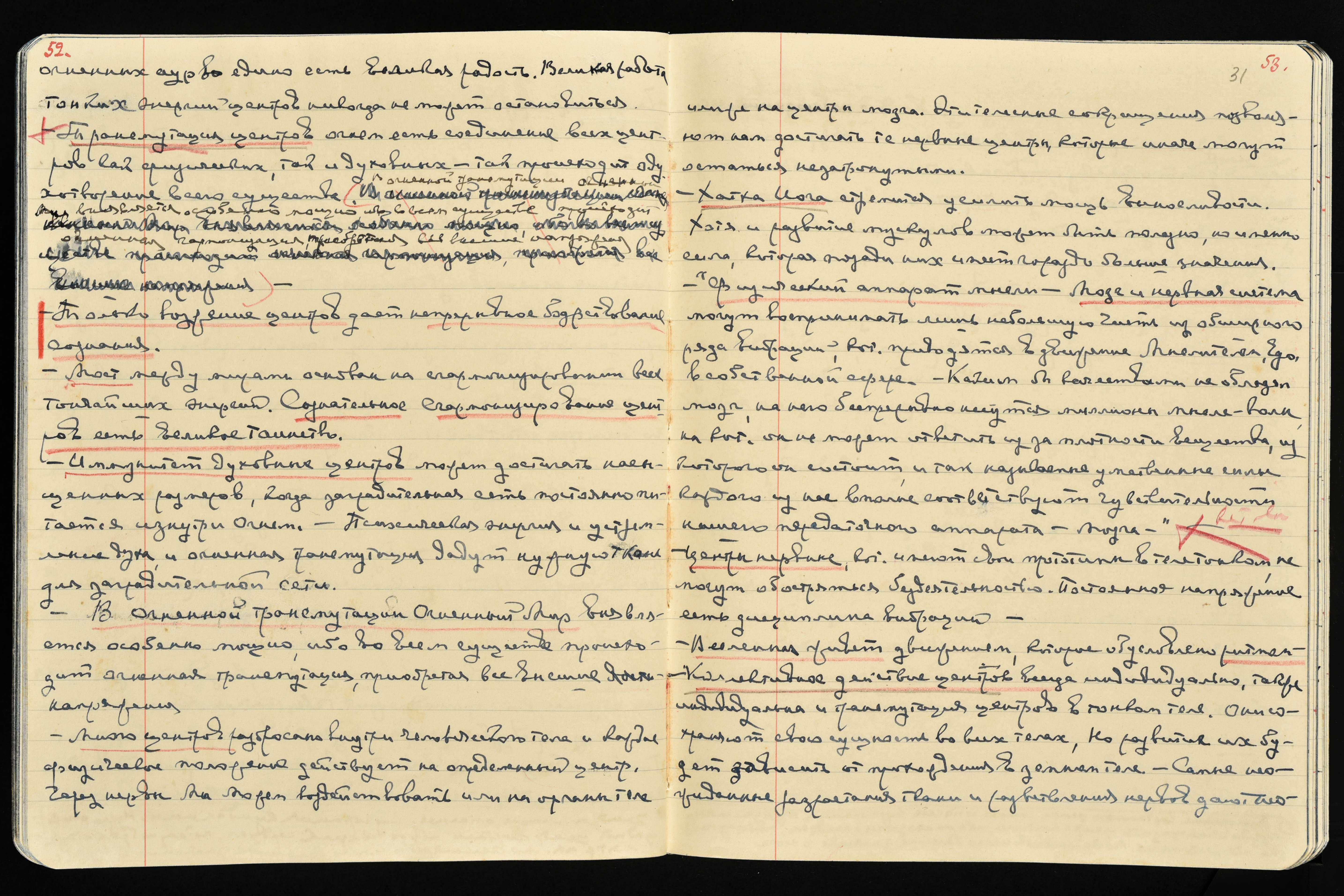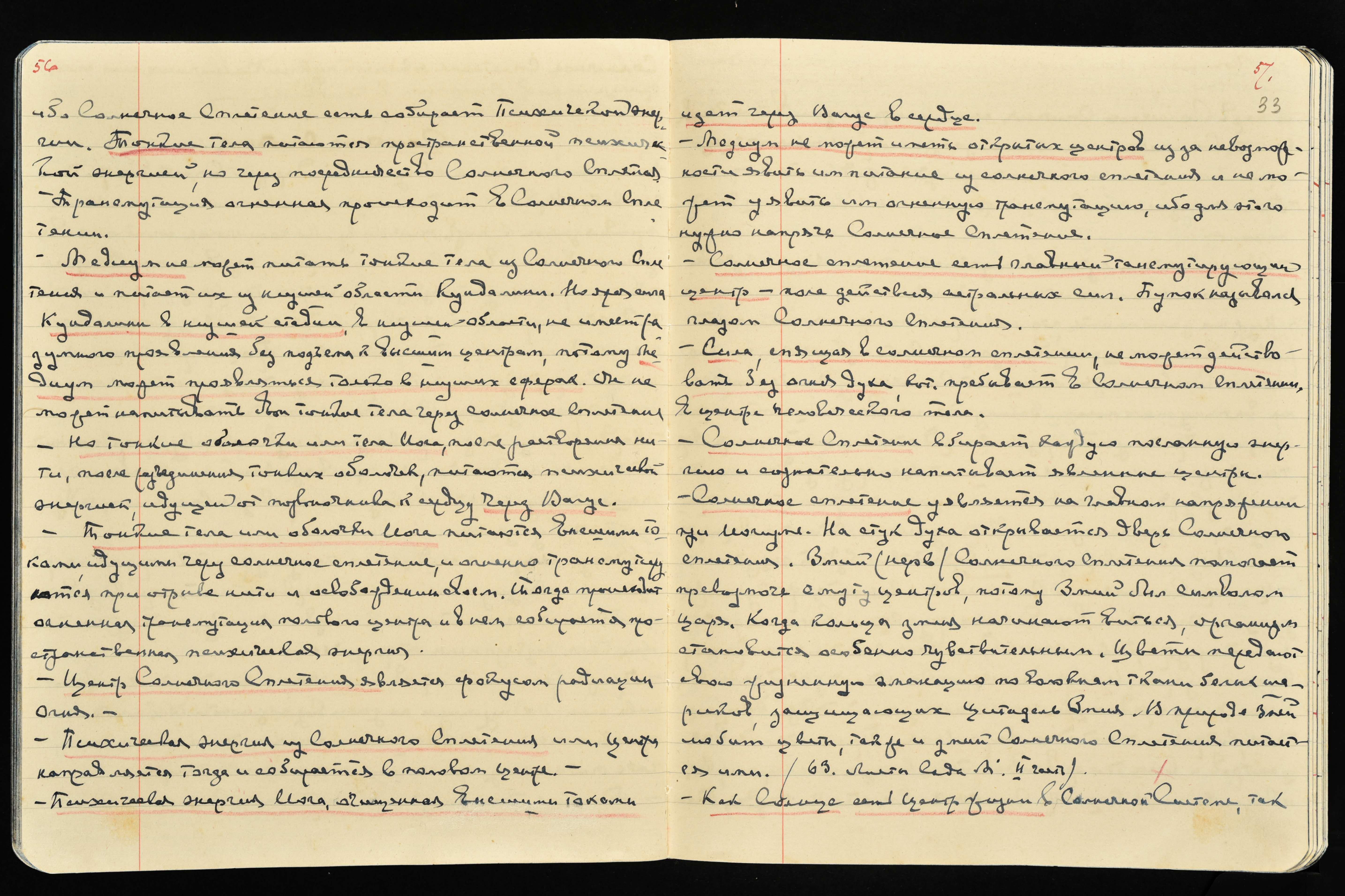 "Когда Космические явления напрягаются, Солнечн[ое] Cплетение трепещет. Трудно сердцу огненному, когда в центре Солнечного Cплетения волны разбиваются, принося все пространственные отзвуки. Явление Лучей утверждается, как явление заградительной сети. Каждая струна звучит своим огнём, − так Солнечн[ое] Сплет[ение] напряжено столькими огненными лучами.