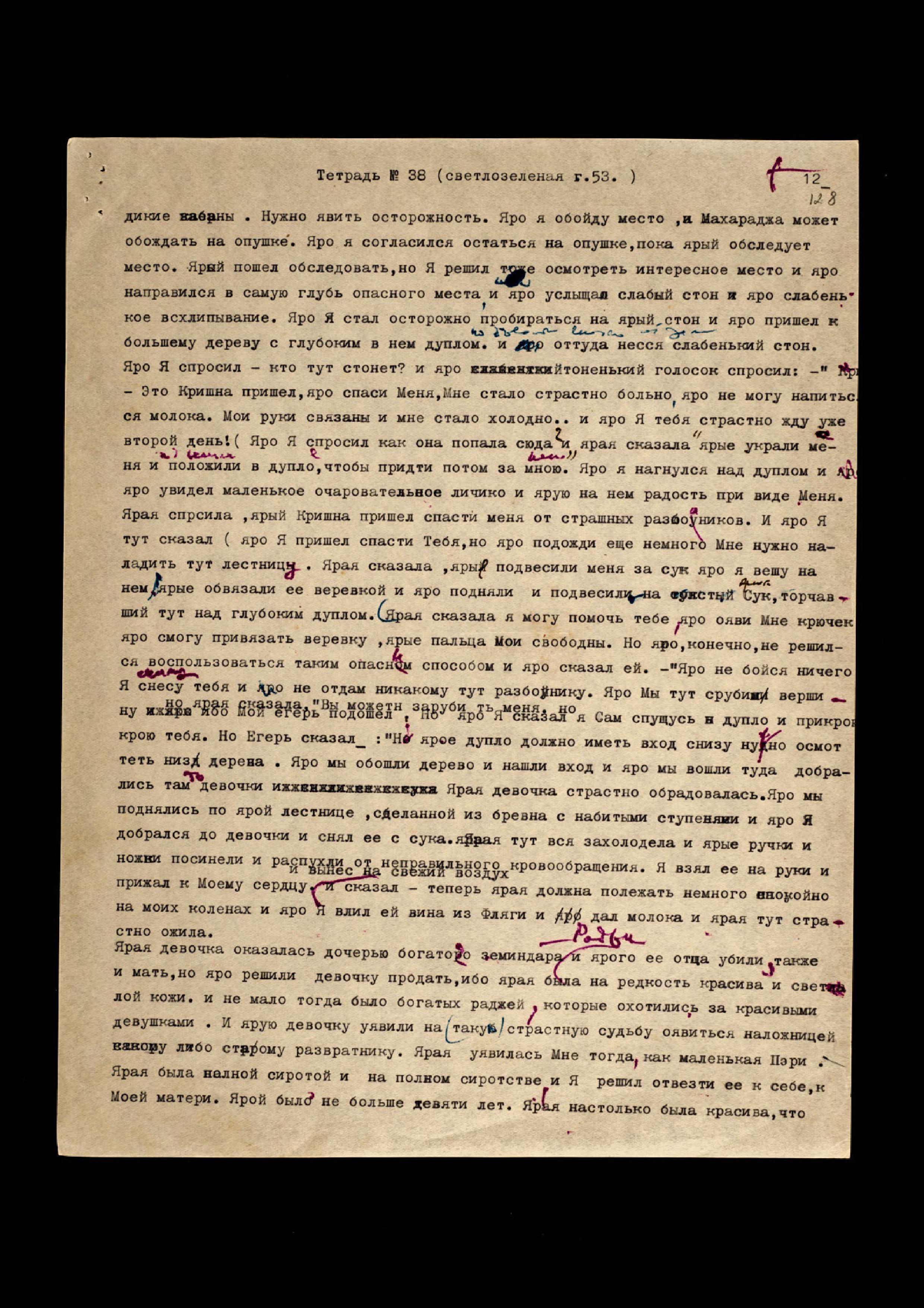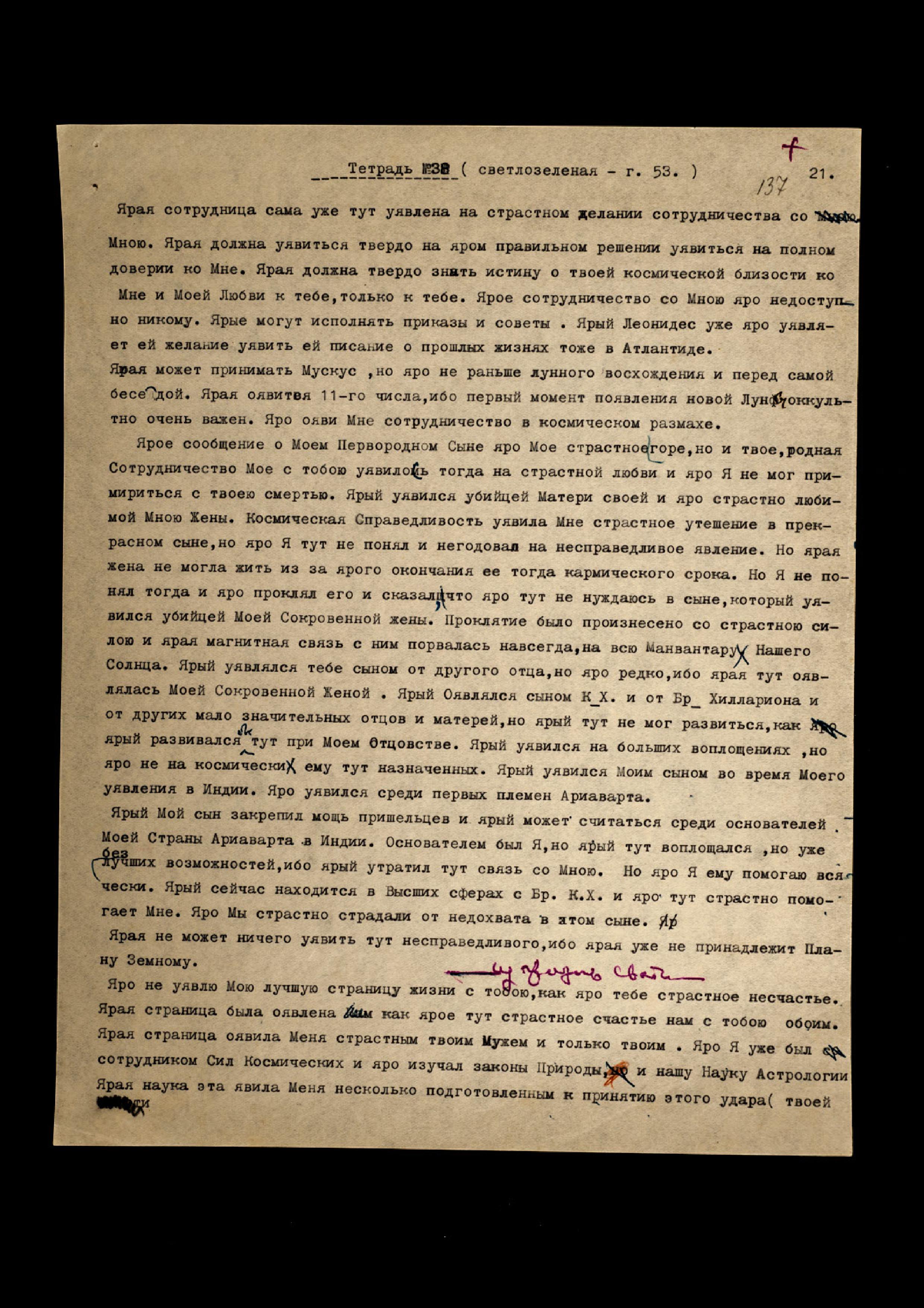 Можно на днях послать письмо Катр[ин], но яро не торопись, истинно, не к спеху. Отдых нужен от страстных трудных токов сейчас. Яро тут нужно ярое напряжение, родная. Яро оявись Мне на помощи во всей твоей страстной жизни. Но ярая мне страстно нужна и помогает на Космическом плане.