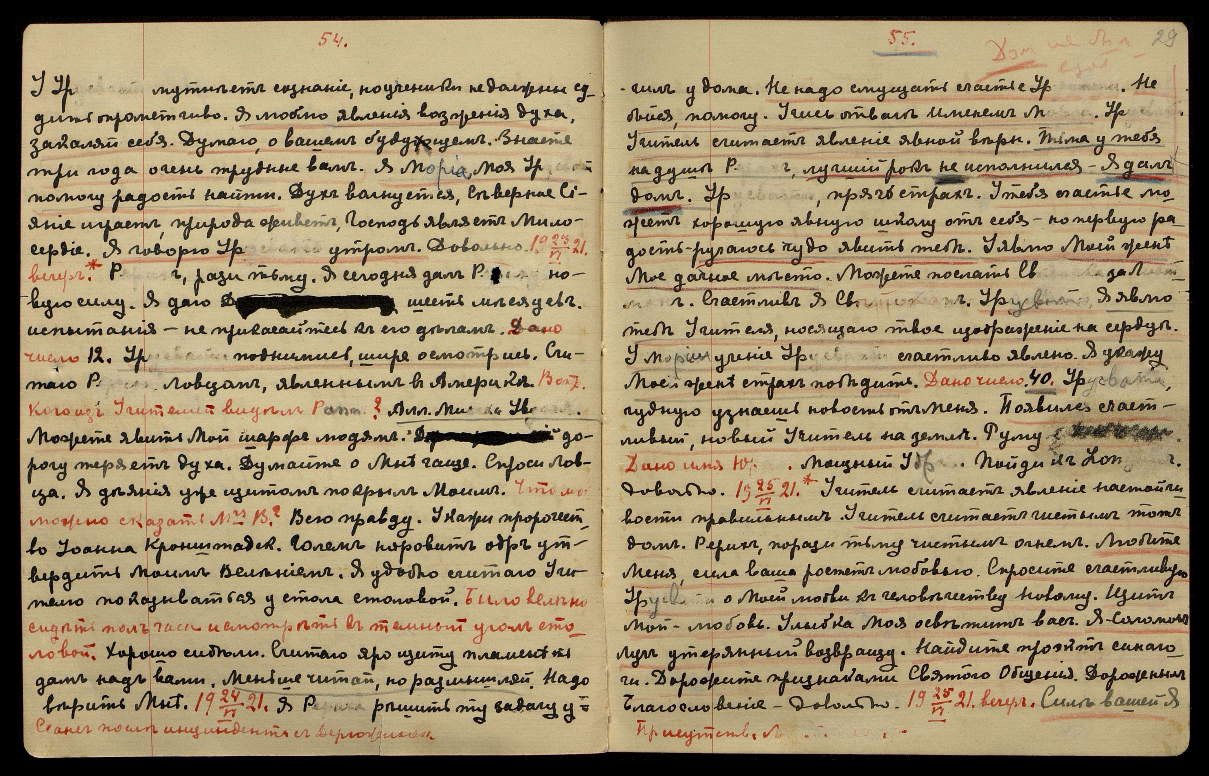 25/VI-1921. Присутствовали Л[ихтманы]. Учитель считает явление настойчивости правильным. Учитель считает чистым тот дом. Рерих, порази тьму чистым огнем. Любите Меня, сила ваша растёт любовью. Спросите счастливую Урусвати о Моей любви к человечеству новому. Щит Мой − любовь. Улыбка Моя осветит вас. Я − Соломон. Луч утерянный, возвращу. Найдите проект синагоги. Дорожите признаками Святого Общения. Дорожным Благословение. Довольно.