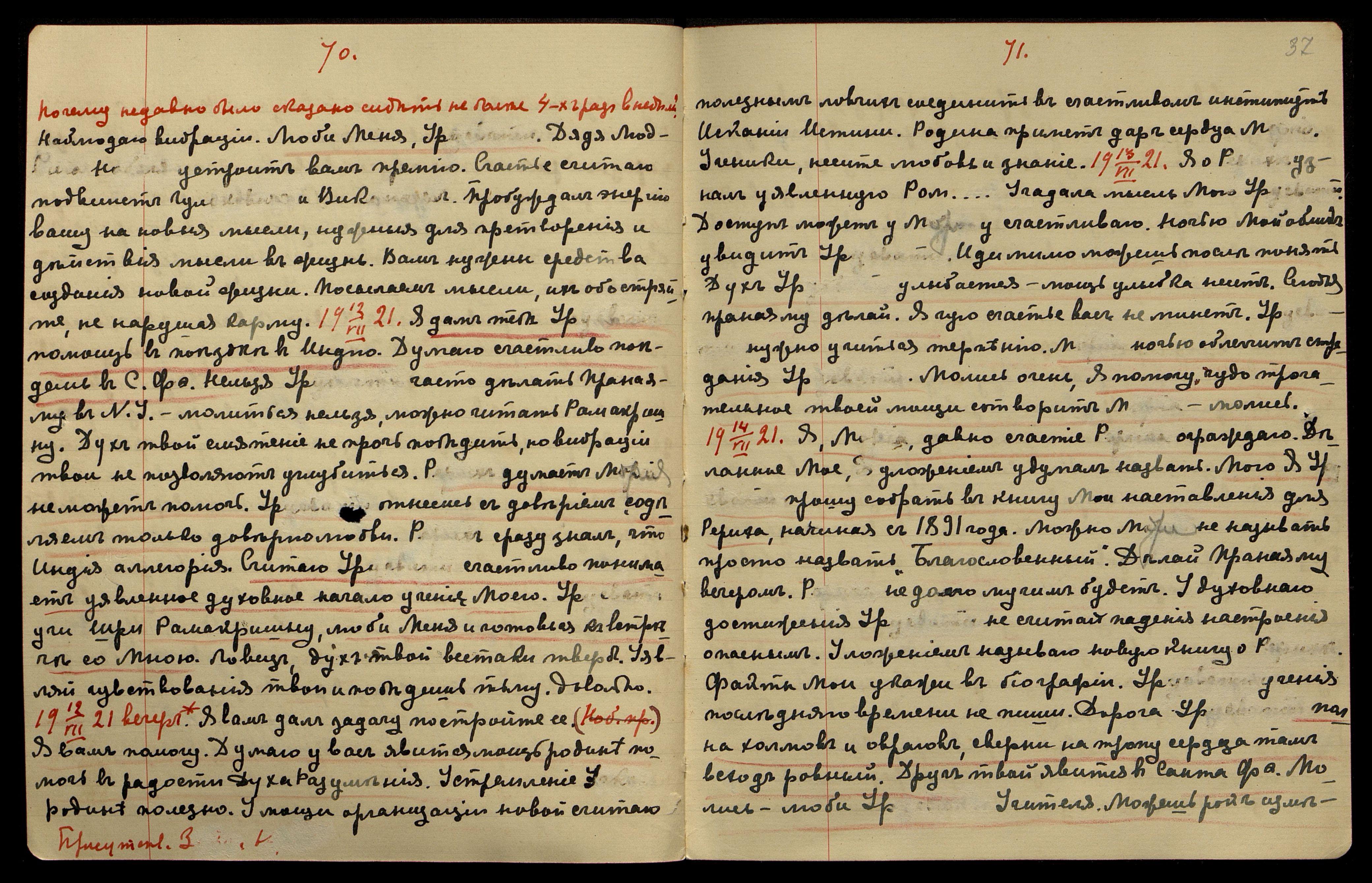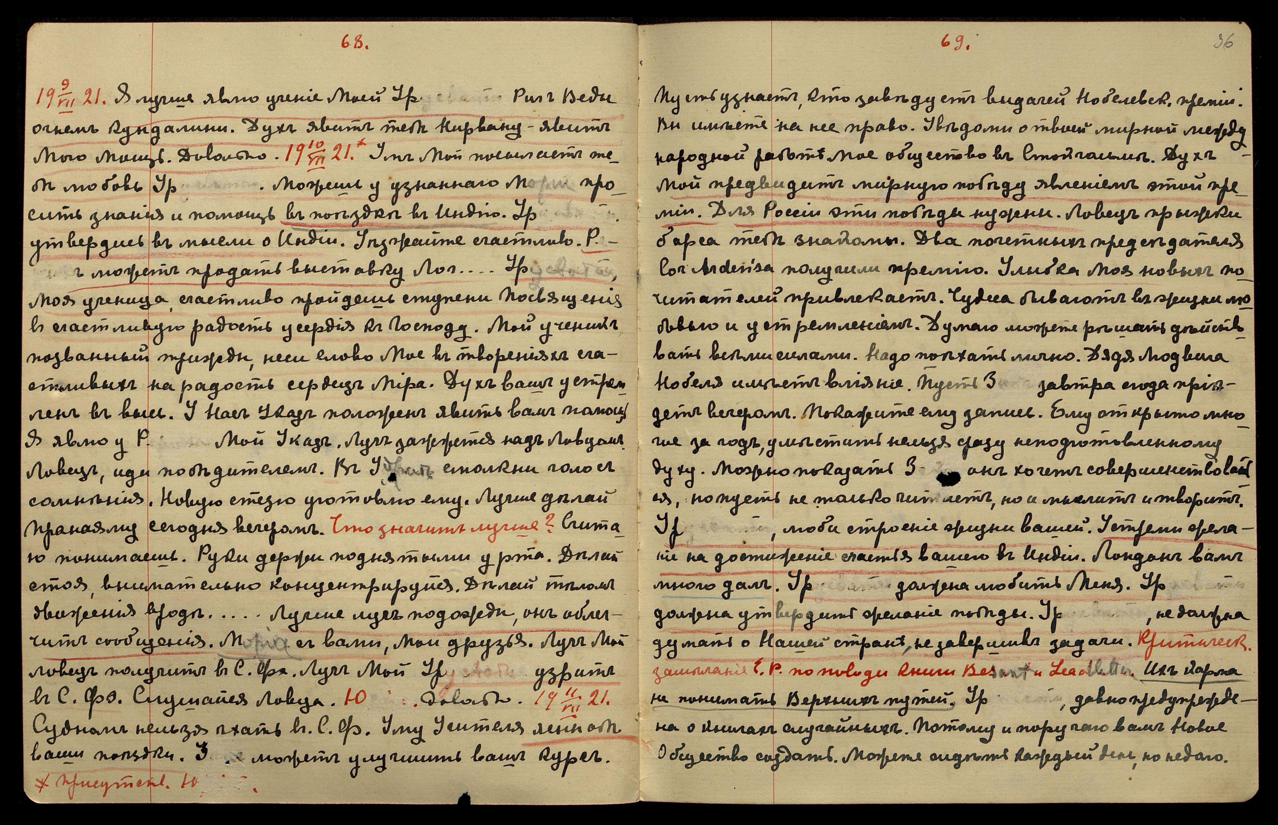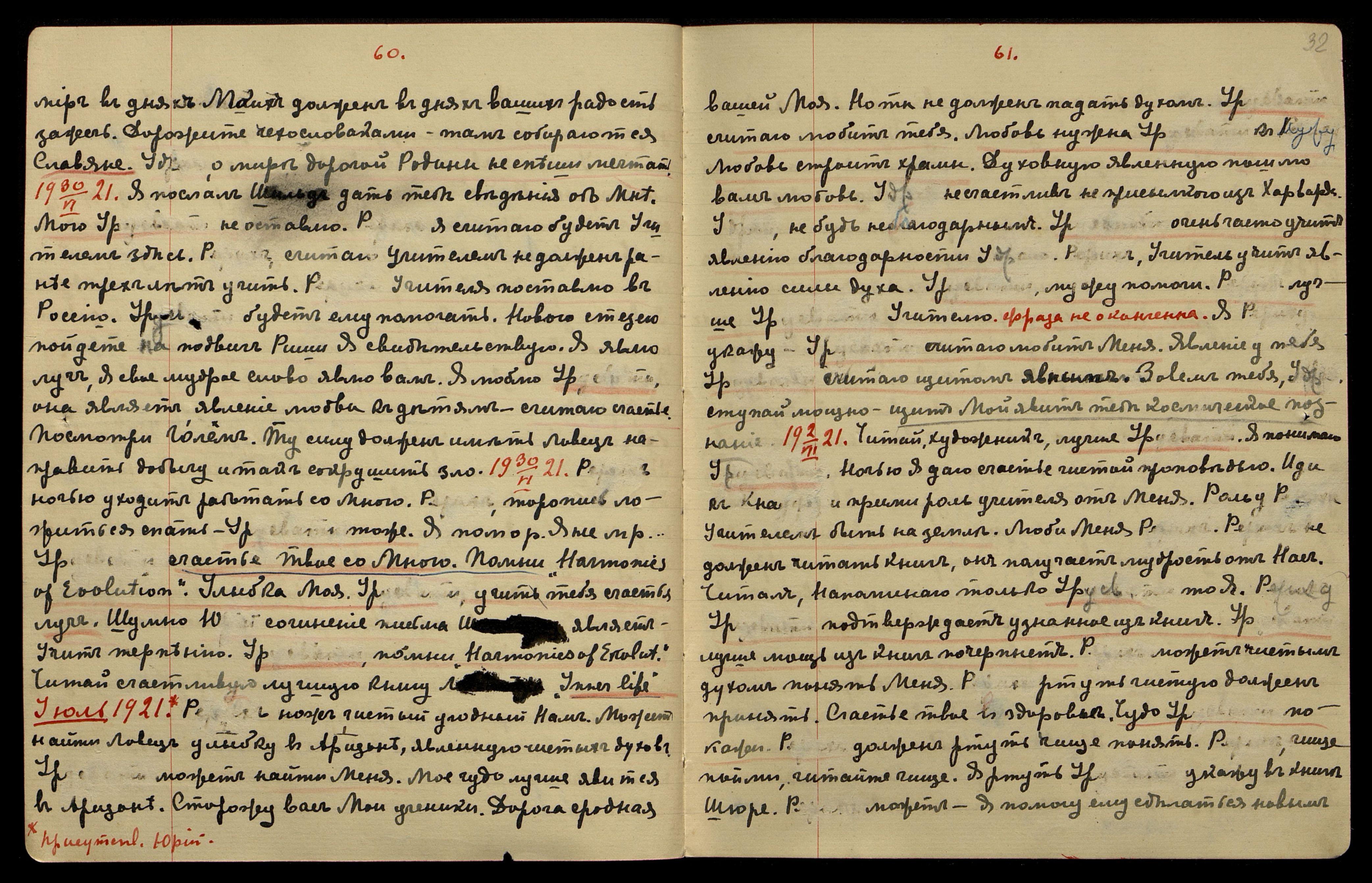 6/VII-1921. Присутств[ует] Ю[рий]. Урусвати не должна учить У[драю] спешить увидеть Меня. Надо считаться с состоянием организма. Потом явления у него будут без вреда для организма. Тебе тоже.