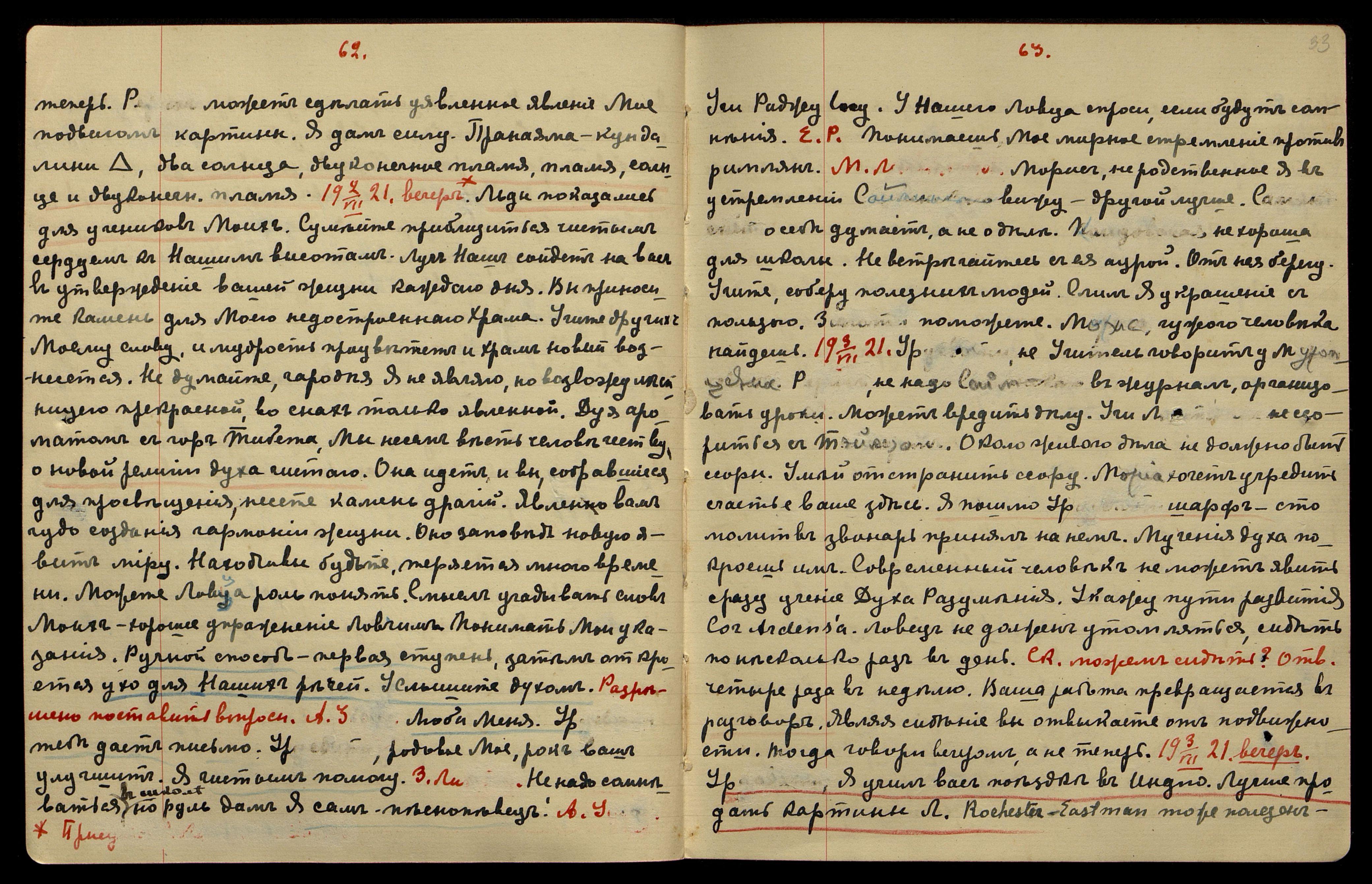 26/VI-1921. Вечер. Присут[ствует] Ю[рий]. Дух У[драи] не любит Меня. Дух Р[ериха] мудр, чист, и ловец новый он у Нас. Ты, Урусвати, Р[ериха] поддерживай. Р[ерих] сдержал Елум Мории. Новый луч у вас заблестит. Скачки барса лучше опасений. Укажу Урусвати явления уявленные. Унесу Урусвати на горы Тибета.