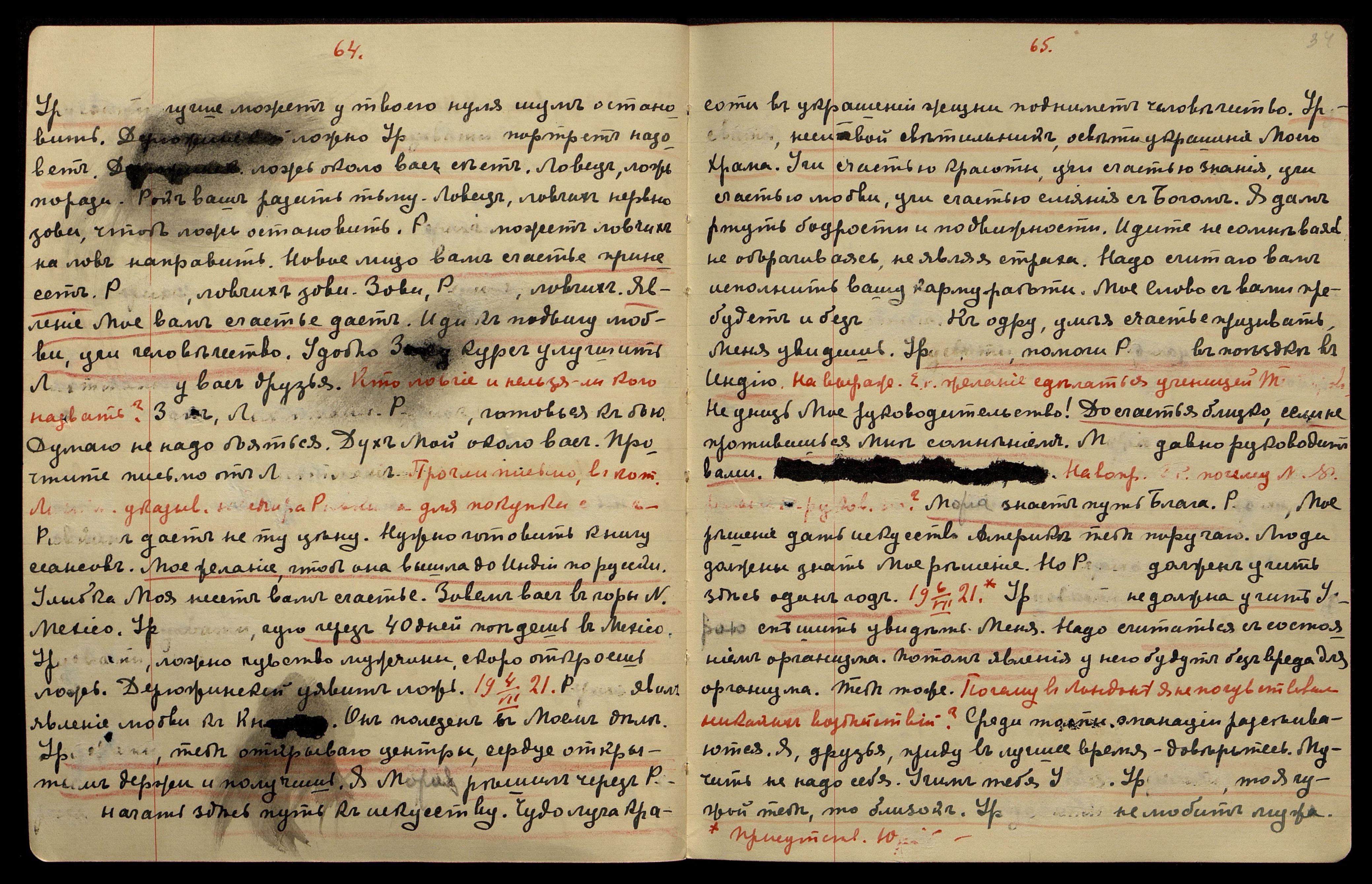 24/VI-1921. Я Р[ериха] решить ту задачу учил у дома. Дом не был взят. Не надо смущать счастье Урусвати. Не бойся, помогу. Учись отваге именем М[ориа]. Урусвати, Учитель считает явление явной веры. Тьма у тебя на душе, Р[ерих], лучший рок не исполнился − Я дал дом. У[русвати], прячь страх. У тебя счастье, может хорошую явную школу от себя, но первую радость, ручаюсь, чудо явить тебе. Уявлю Моей жене Мое дачное место. Можете послать Св[етика] за Л[ихтман]. Счастлив Я Св[етиком]. Урусвати, Я явлю тебе Учителя, носящего твое изображение на сердце. У Мории учение Урусвати счастливо явлено. Я укажу Моей жене страх победить.