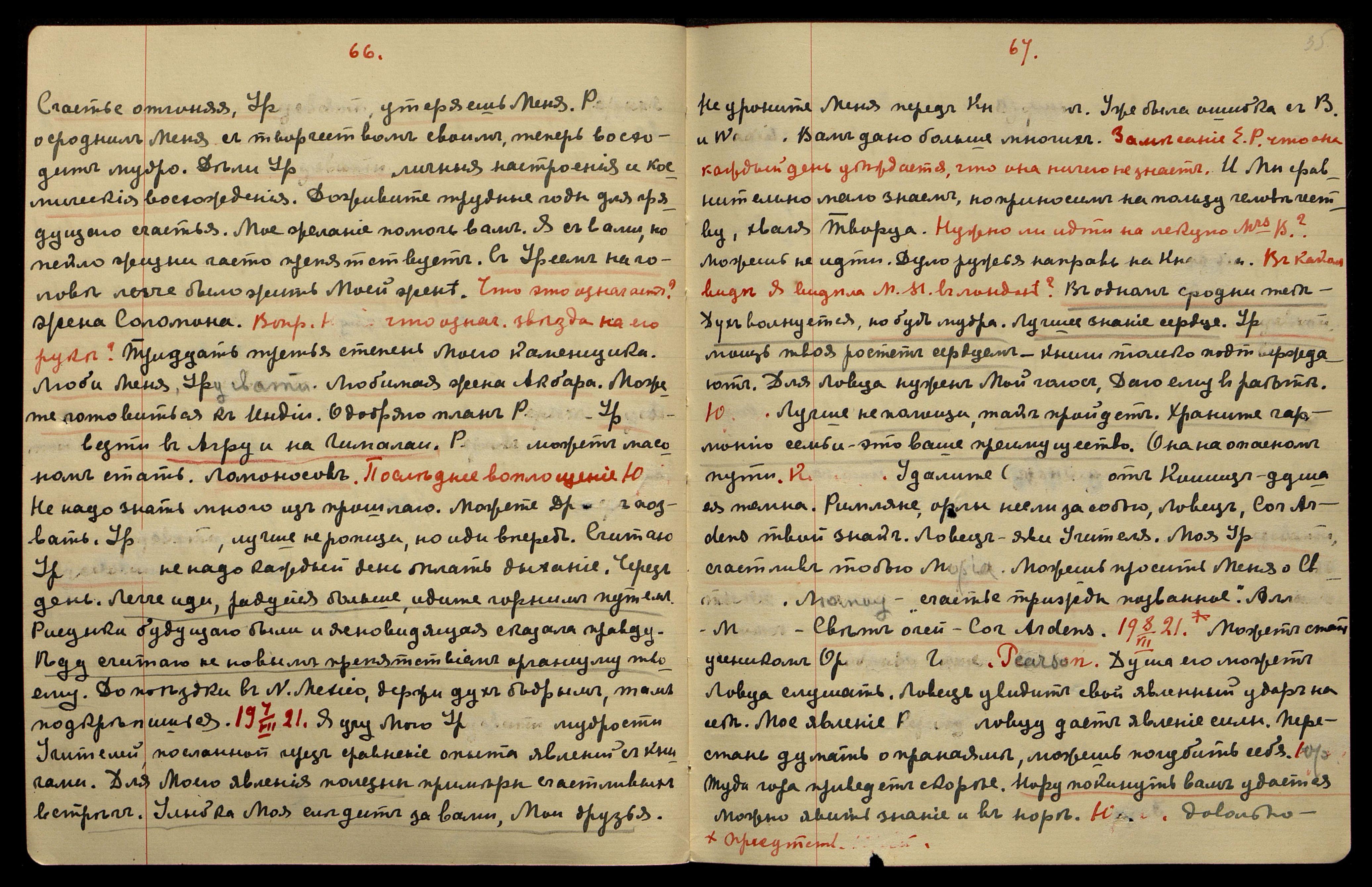 8/VII-1921. Присутств[ует Юрий]. Может стать учеником Ор[обиндо] Г[оша], Pearson. Душа его может Ловца слушать. Ловец увидит свой явленный удар на себе. Моё явление Р[ериху]-ловцу даёт явление силы. Перестань думать о пранаяме, можешь погубить себя. Юр[ию]. Туда гора приведет скорее. Нору покинуть вам удастся. Можно явить знание и в норе. Ю[рию]. Довольно.