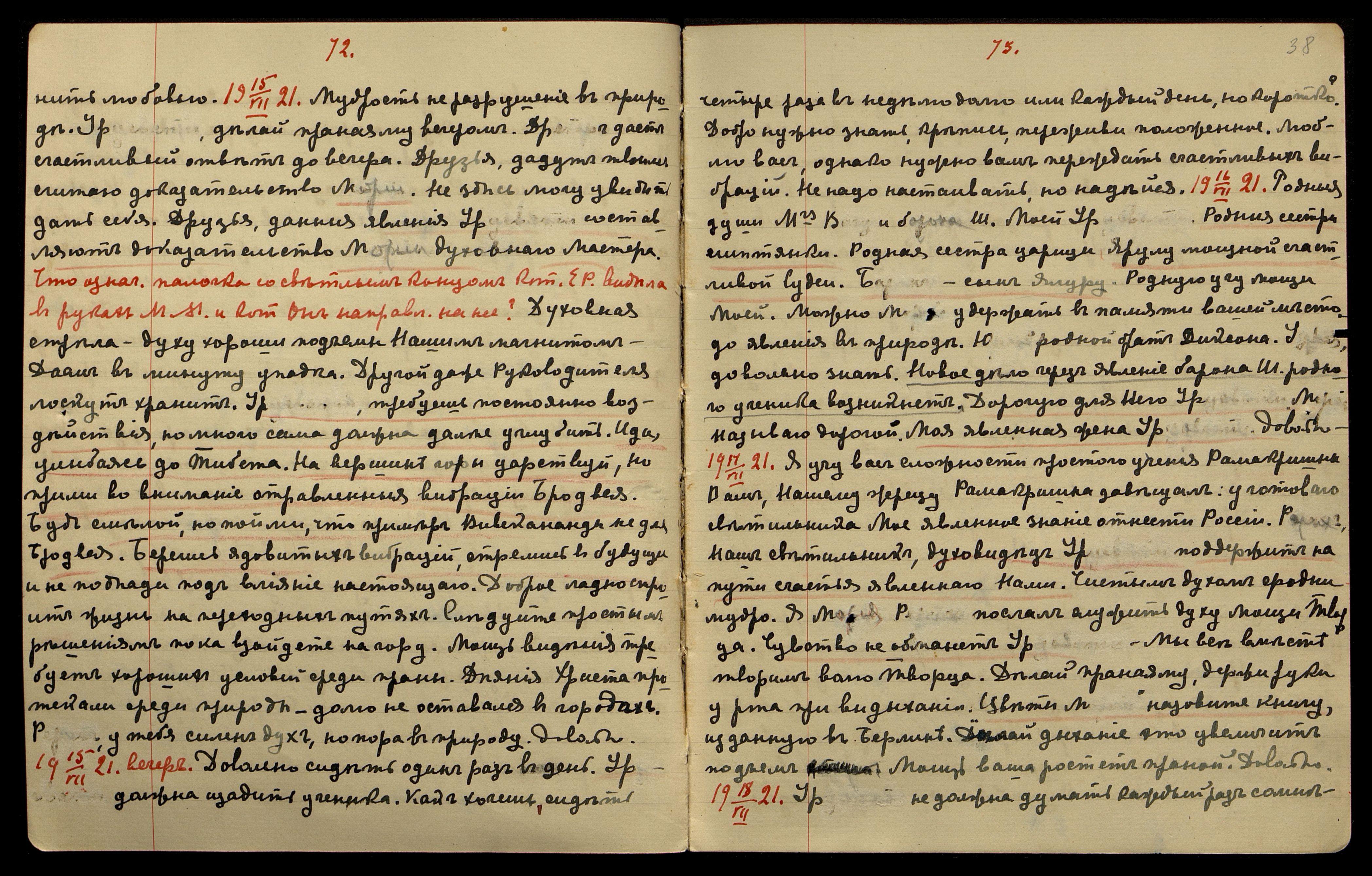 12/VII-1921. Вечер. Присутств[овали] З[ак] и Ю[рий]. Я вам дал задачу, постройте её (Ноб[елевская] пр[емия]). Я вам помогу. Думаю, у вас явится мощь родине помочь в радости Духа Разумения. Устремление З[ака] родине полезно. У мощи организации новой считаю полезным ловчих соединить в счастливом институте искания истины. Родина примет дар сердца М[ории]. Ученики, несите любовь и знание.