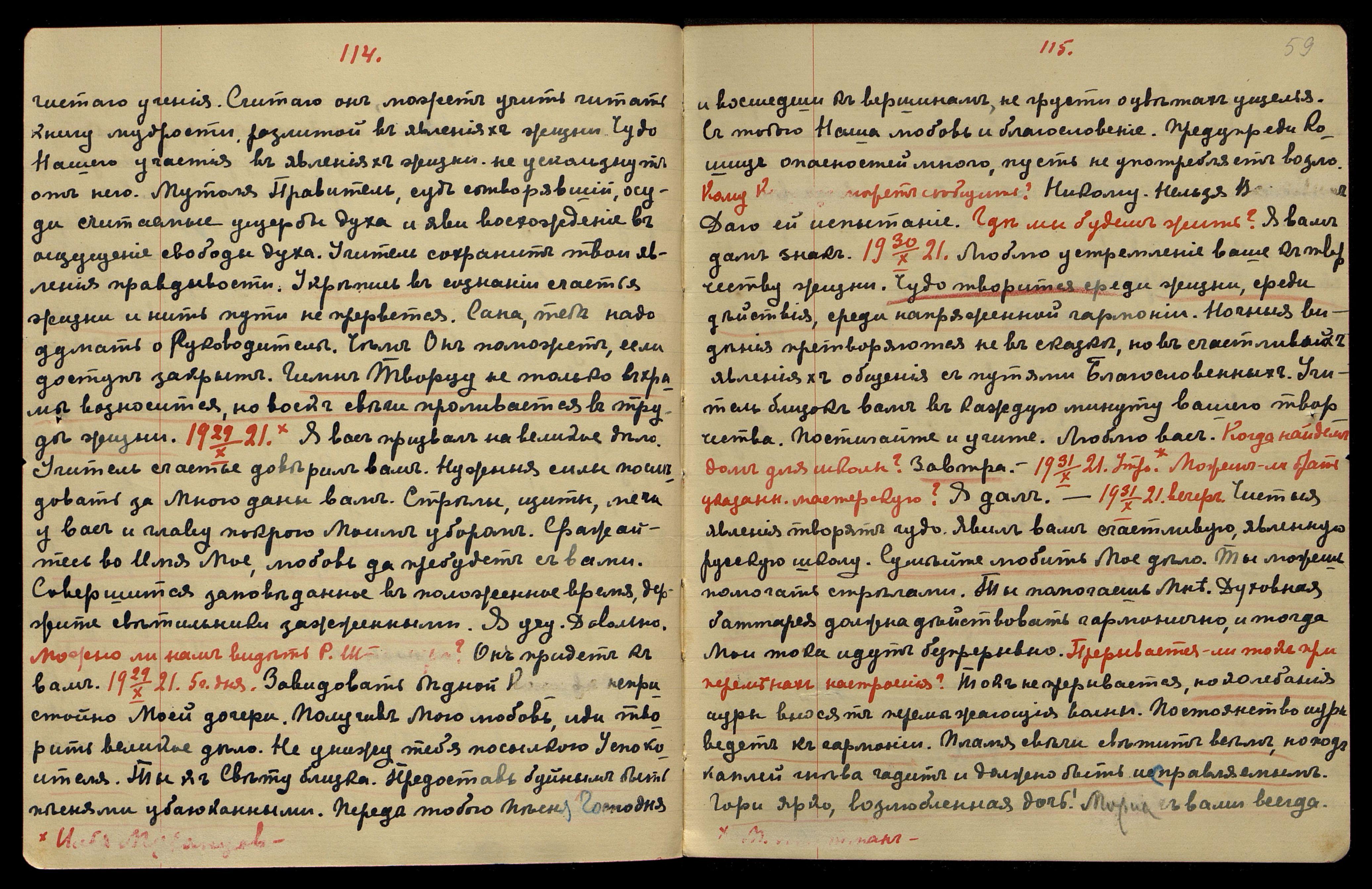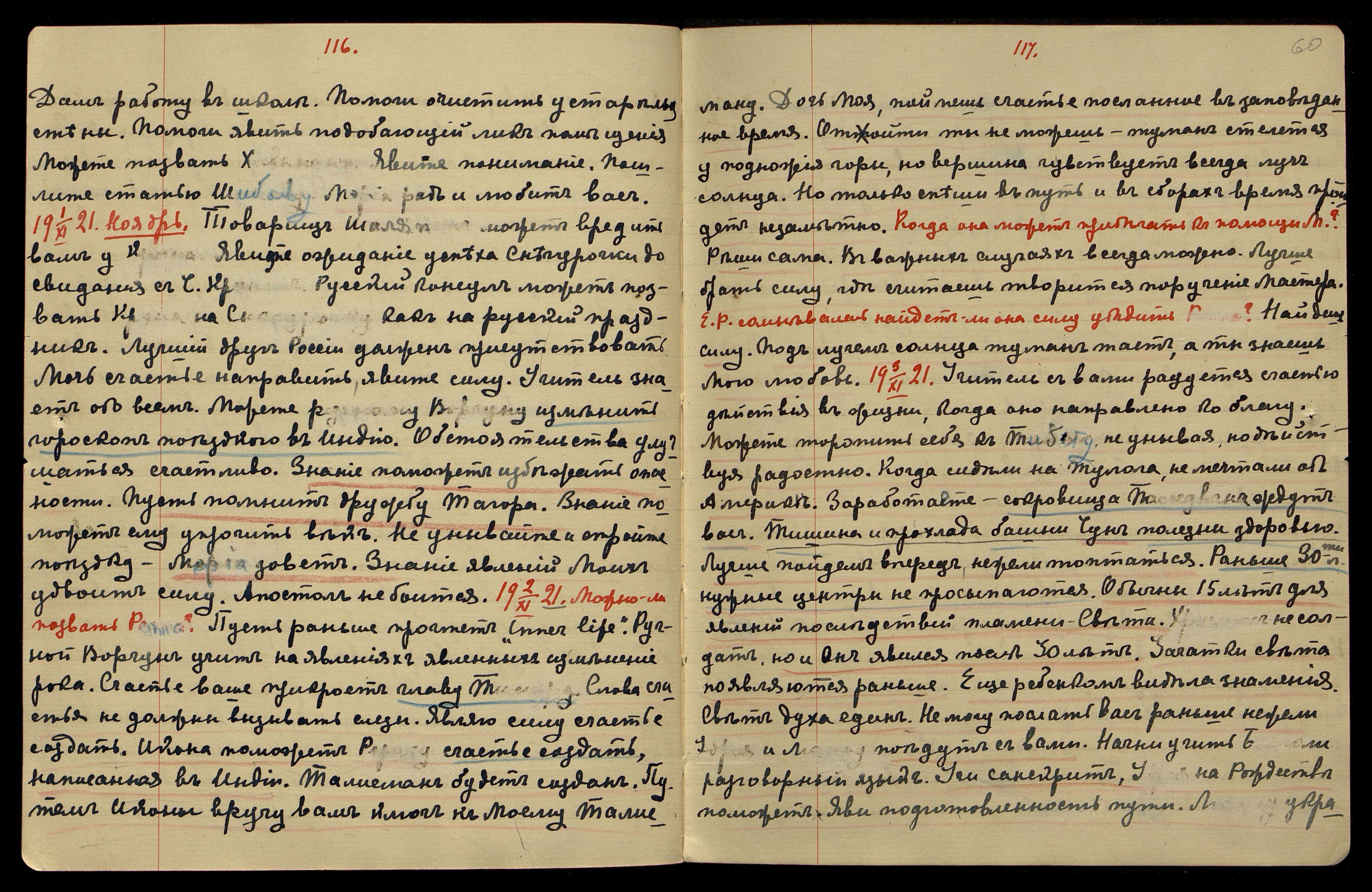 21/ХI-1921. Утро. Я послал Слободина к К[ану]. Явленную суровую школу с улыбкою примите. Увидите, чую явление туч на горизонте. Мудро примите и чувствуйте − решение Кана вам на пользу. Чую, ручательству Урусвати Рериха — пощадить.