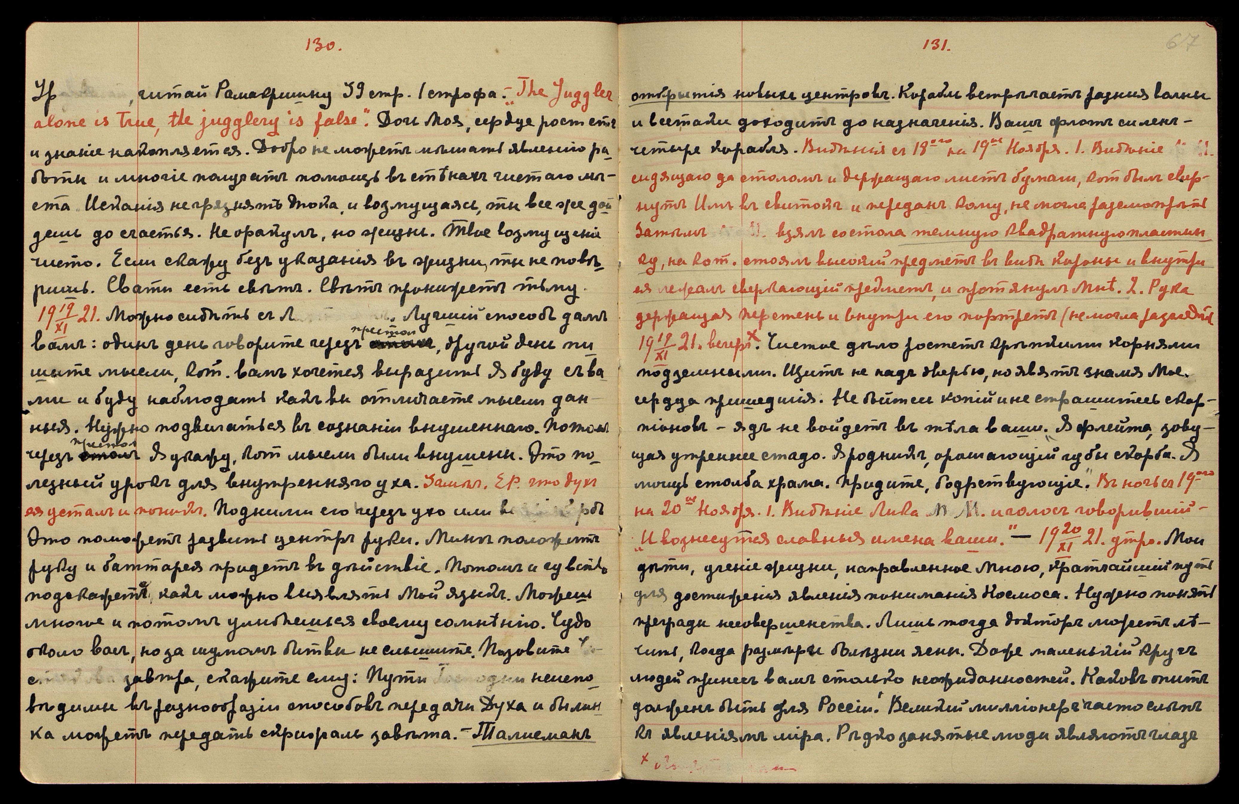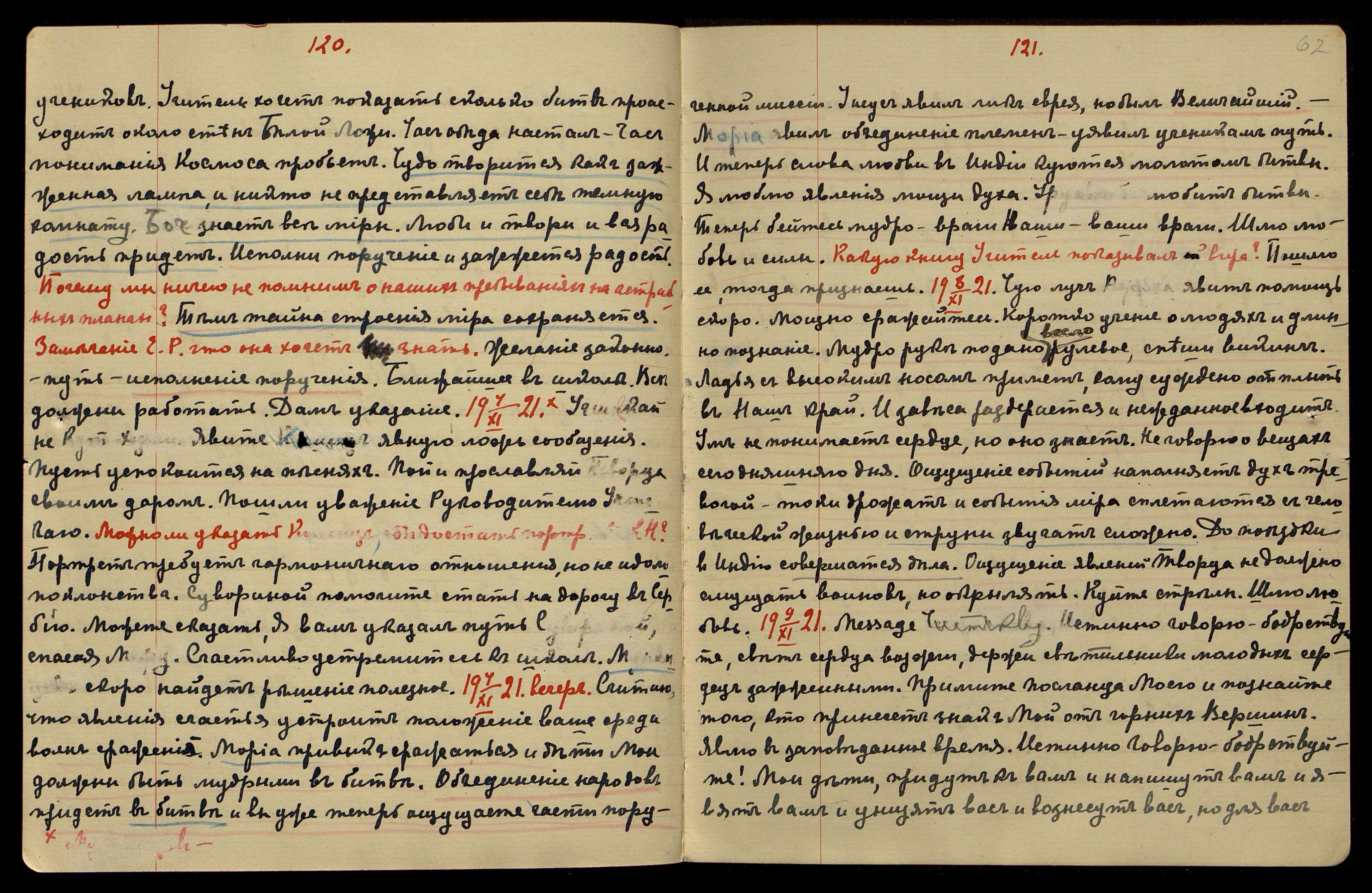 5/XI-1921. Рерих, люби русских, тебе су[жде]но р[уководить Россией]*. Щитом чистым прикрою вас. Урусвати, Учитель знает решение Братства. У Нас положена работа каждому из вас. Новые знаменья дам вовремя. Новую Россию строить создателю мощь дам. Избегайте русских, идите своим путём. С разных сторон из всех стран пошлю вам помогающих. Не надо избирать, но примите приходящих к вам. Ученики ваши придут к вам. Считайте случай предначертанием. Явление случая усмотрено Нами. Кажущийся случай — для вас страница будущего. Будьте все четверо гармоничны и силы ваши умножатся. Поездка в Индию деяния указанные укрепит. Можете спокойно и бодро трудиться. Вам надлежит знать путь ваш. Дух Лихтман нуждается в опоре. Любите малых, как Я люблю вас. Желай и поможешь многим.