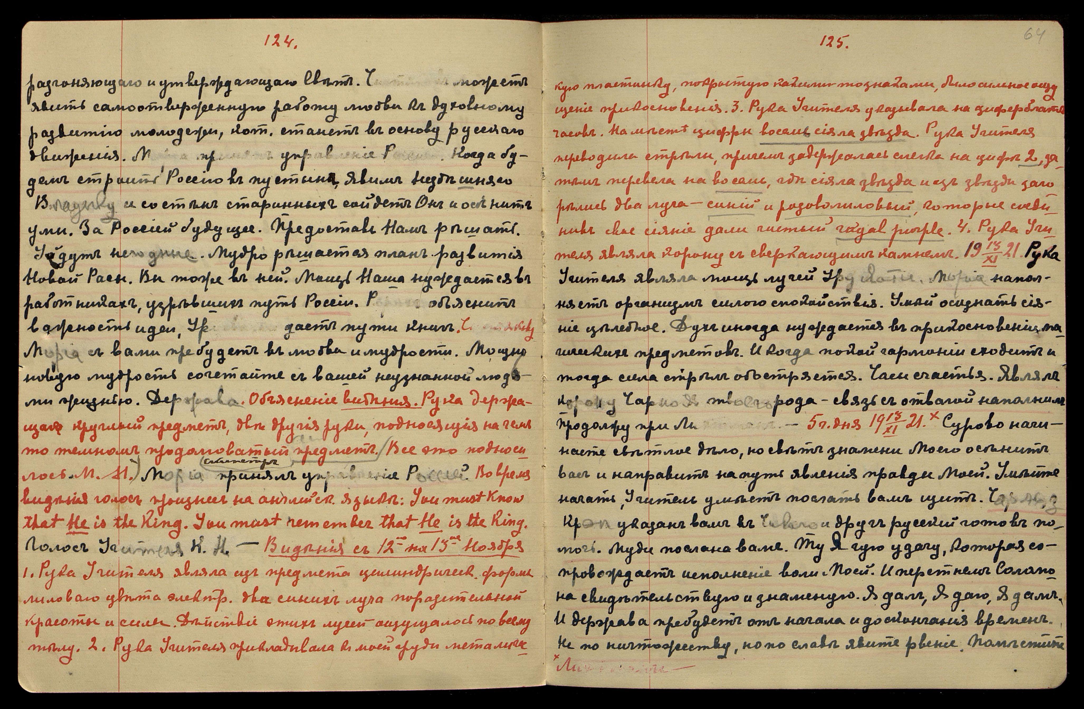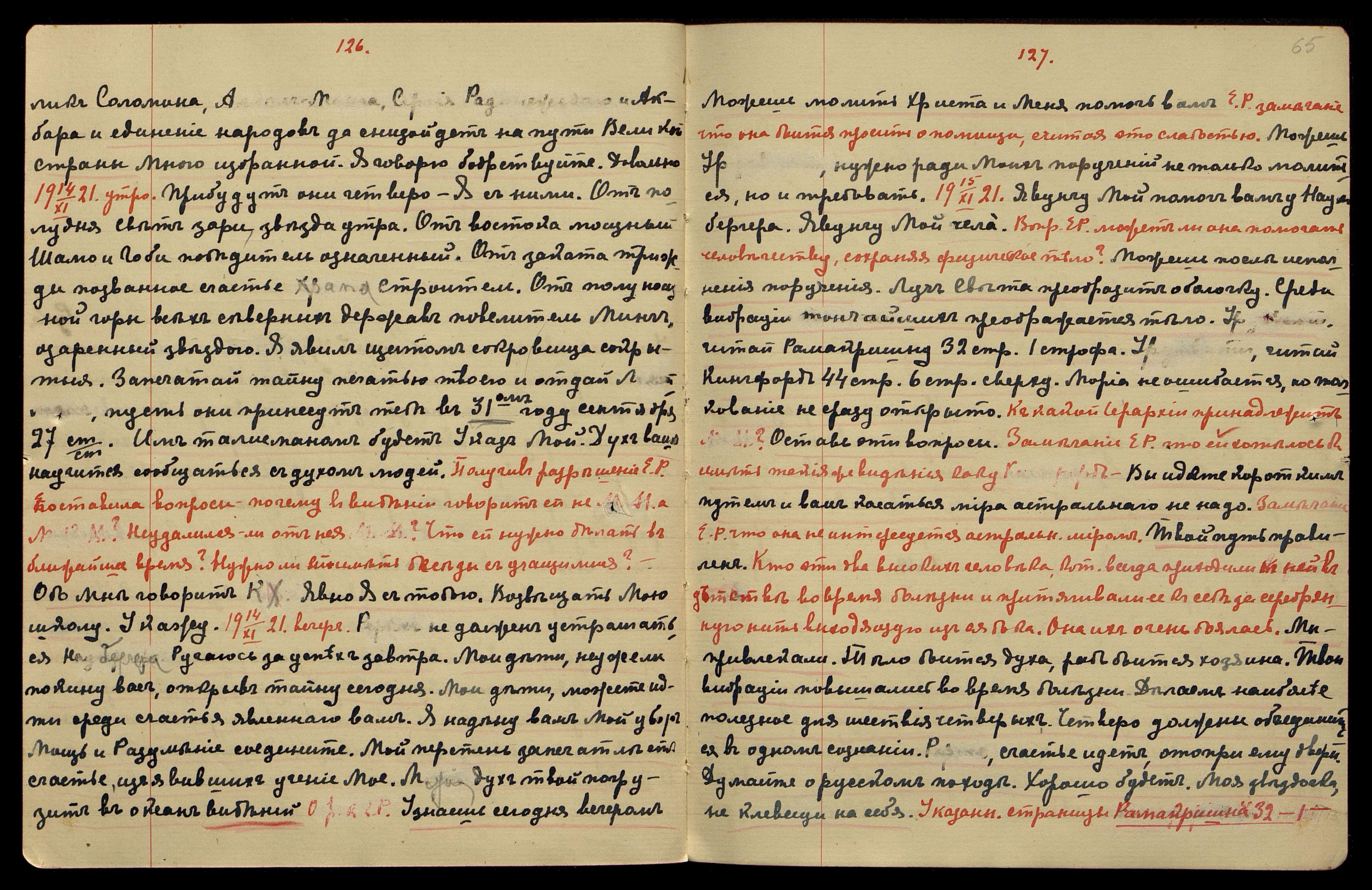 14/XI-1921. Вечер. Р[ерих] не должен устрашаться Наубергера. Ручаюсь за успех завтра. Мои дети, неужели покину вас, открыв тайну сегодня. Мои дети, можете идти среди счастья явленного вам. Я надену вам Мой убор. Мощь и Разумение соедините. Мой перстень запечатлеет счастье изъявивших учение Моё. Мориа дух твой погрузит в океан видений.