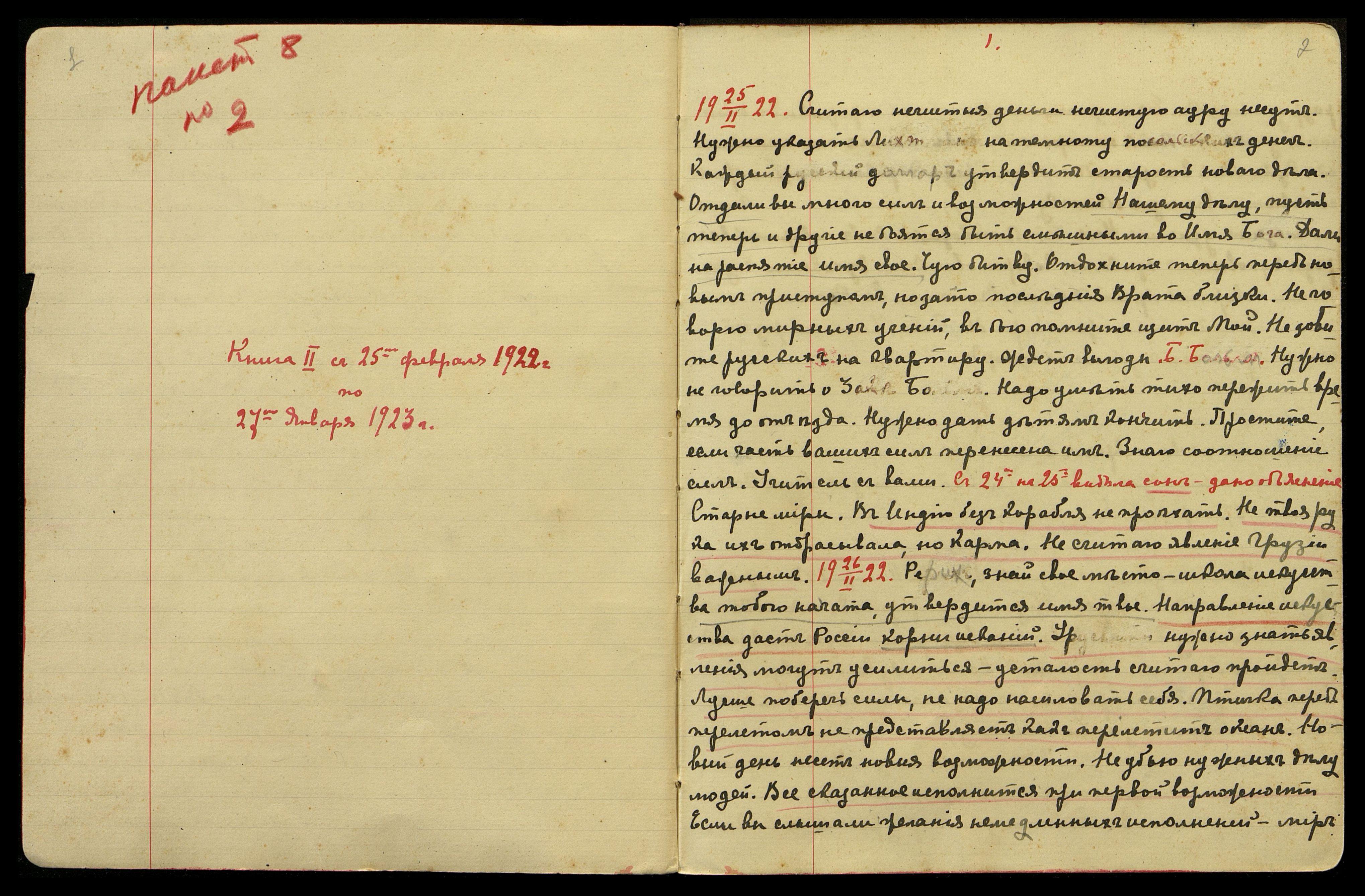 26/II-1922. Рерих, знай своё место − школа искусства тобою начата, утвердится имя твоё, направление искусства даёт России корни исканий. Урусвати нужно знать, явления могут усилиться, усталость, считаю, пройдет. Лучше поберечь силы, не надо насиловать себя. Птичка перед перелетом не представляет, как перелетит океан. Новый день несет новые возможности. Не убью нужных делу людей. Все сказанное исполнится при первой возможности. Если [бы] вы слышали желания немедленных исполнений — мир