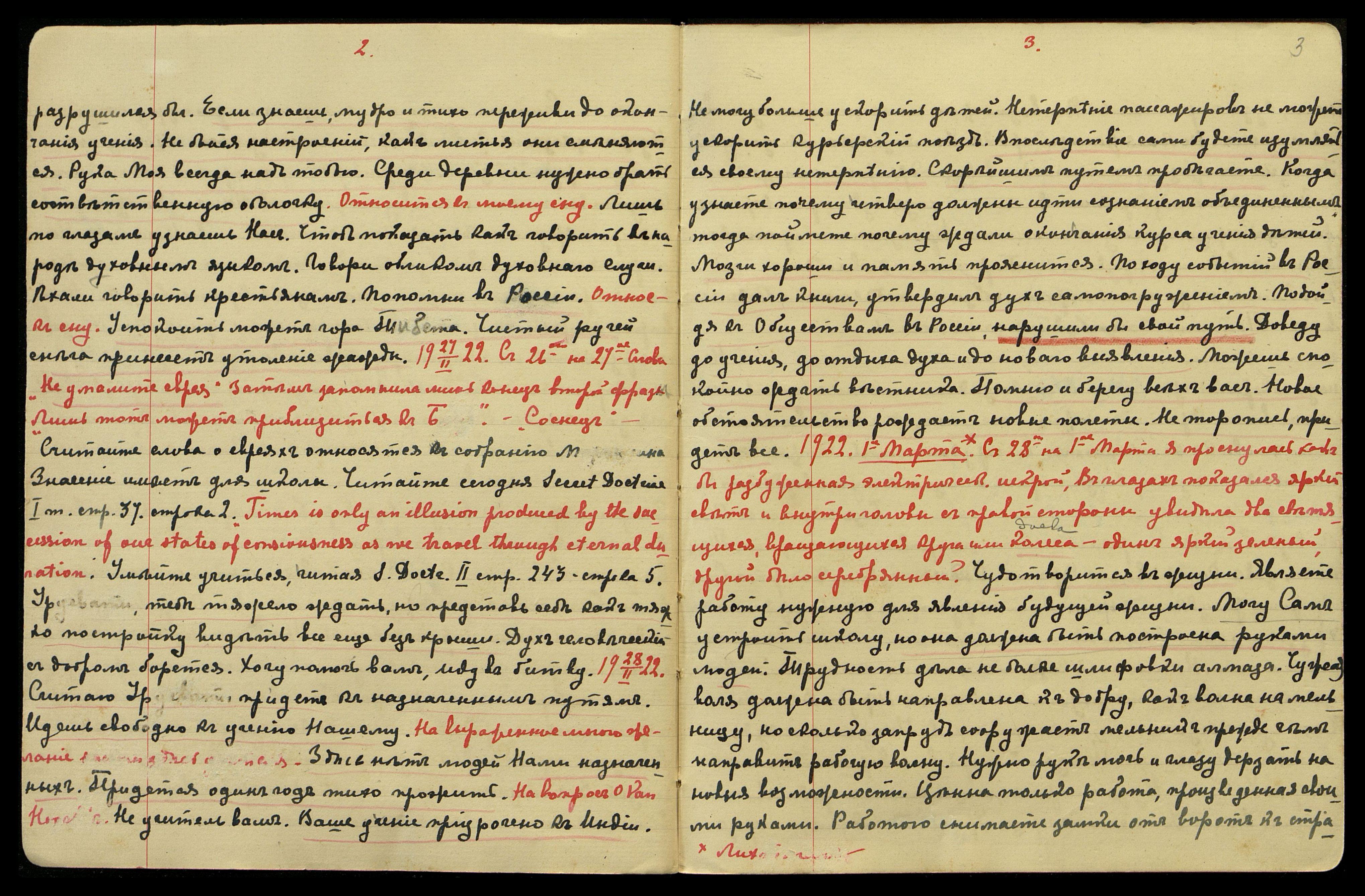 Название, датировка и формат оригинала на сайте ГМР: Записи бесед с Учителем. [серия «Учение»] Тетрадь 2 [США] 1922.02.25 - 1923.01.27 автограф русский (стар. орф.) 98 Тетрадь «Vendel-Shakespeare» (Франция, Париж), форзац розовый