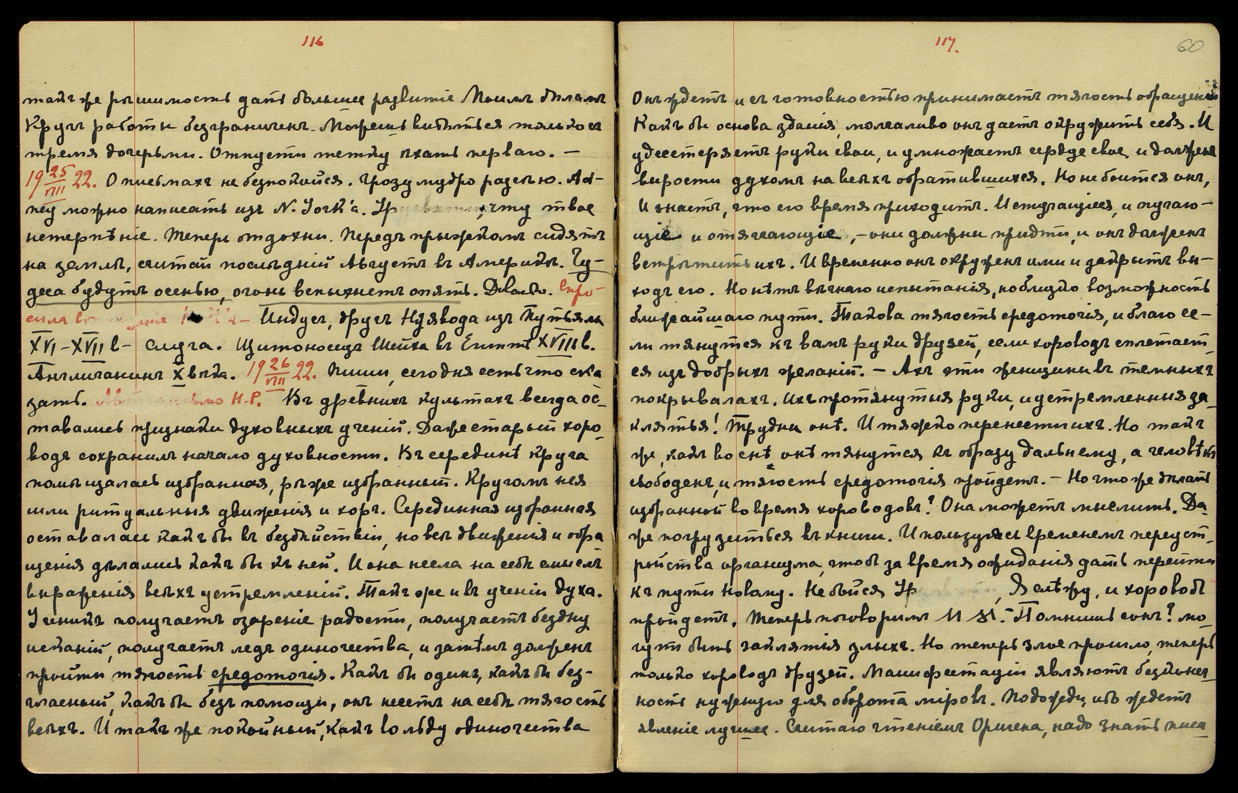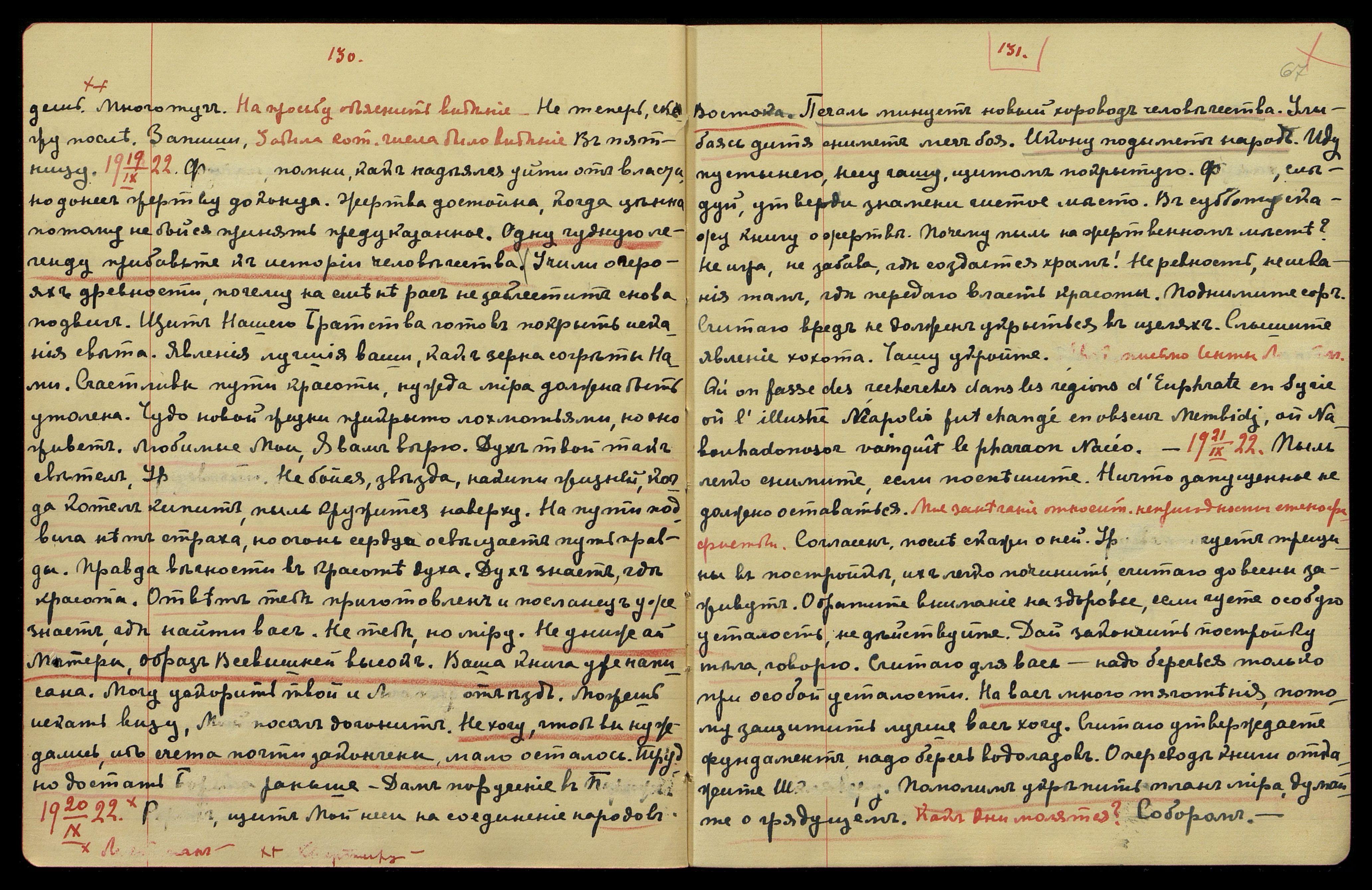 31/VIII-1922. Чую, счастье идет. Ехать надо в N[еw] York, почта покажет. Пыль не должна засорять машину. Учить надо молодых. М[ориа] не сходит с языка. Хранить тайну надо ради дела. Урусвати знает цену Имени. Сумейте мудро указать. Урусвати понимает значение счастья — окончить дела скорее.