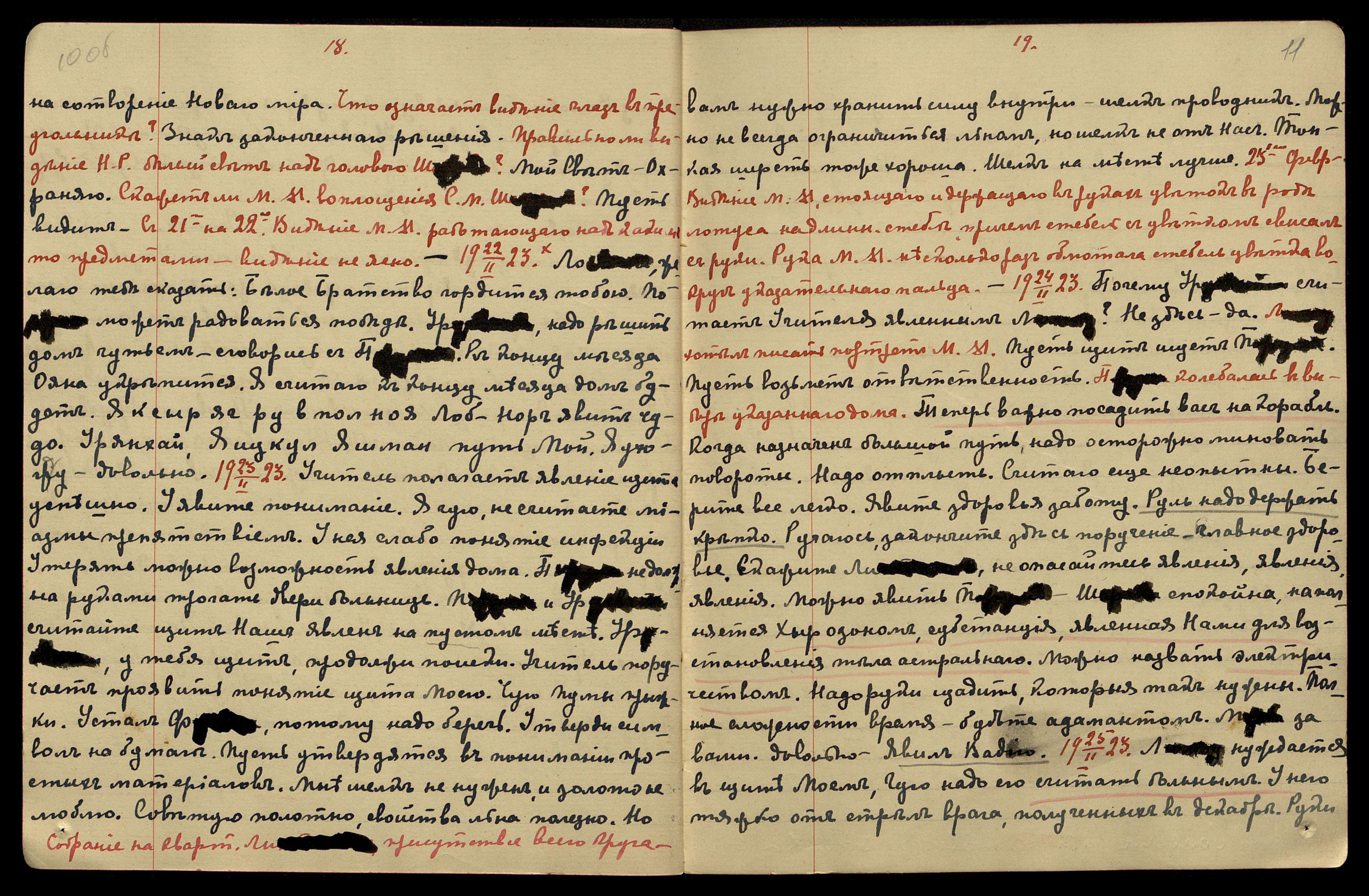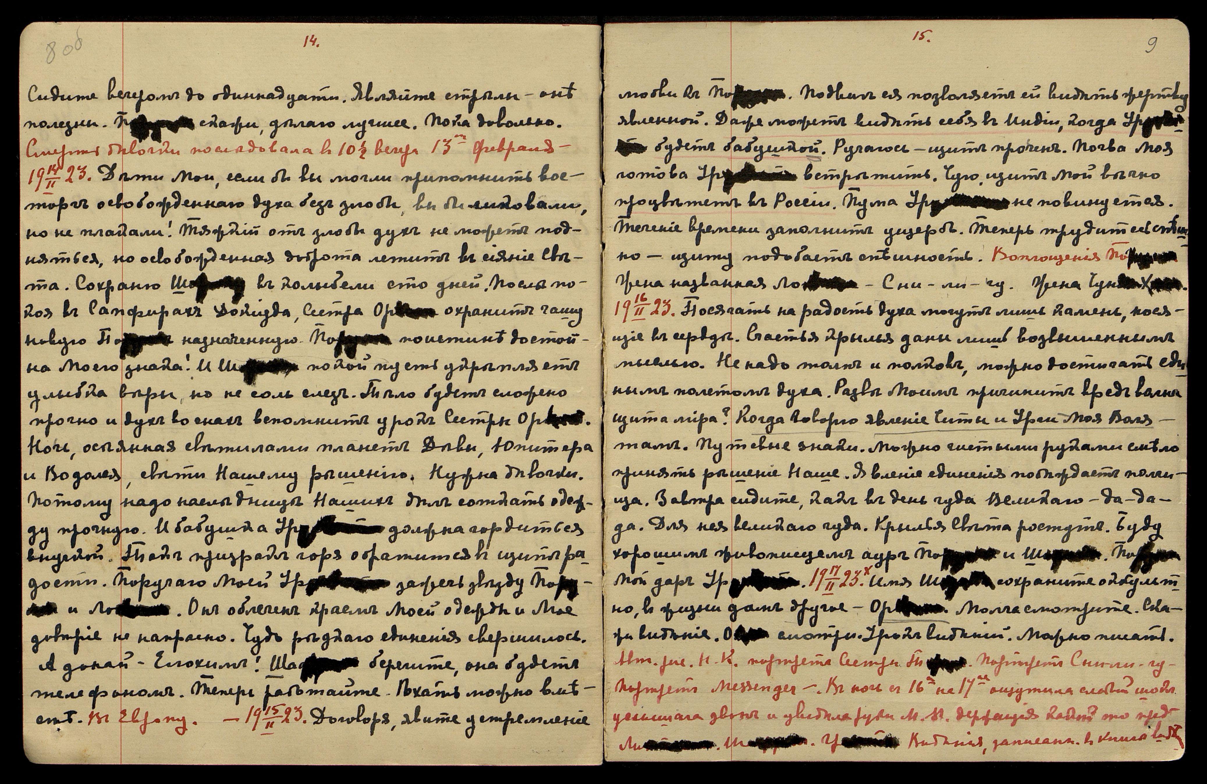 22.02.1923. Собрание на квартире Лихтман, присутствие всего круга. Ло[гван], желаю тебе сказать: Белое Братство гордится тобою. По[рума] может радоваться победе. Урусвати, надо решить дом чутьём − сговорись с П[орумой]. К концу месяца Ояна укрепится. Я считаю к концу месяца дом будет. Яксыр яг ру в пол ноя Лоб-Нор явит чудо. Урянхай. Яицкул Яшман путь Мой. Я ухожу. Довольно.