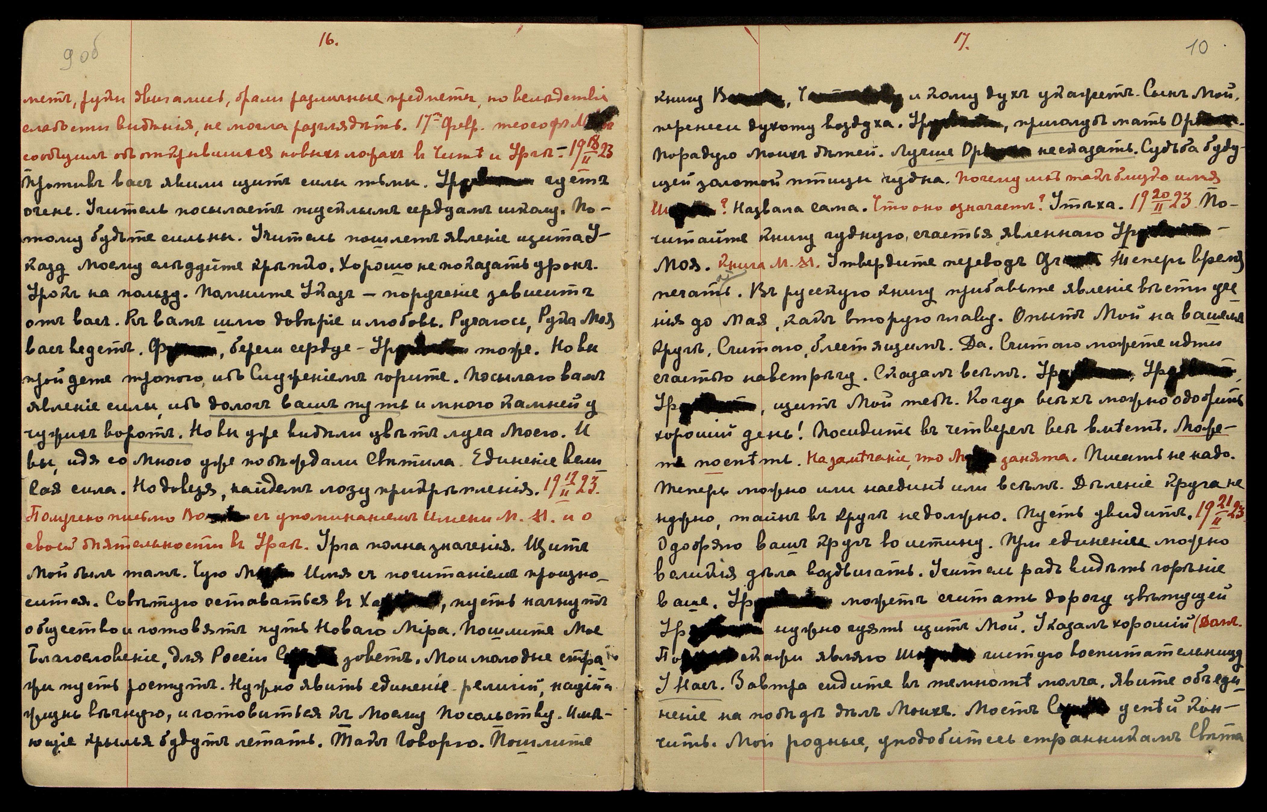17.02.1923. [Присутствовали] Лихтманы, Шафран, Grant. Видения записаны в книге видений. Имя Ш[ораки] сохраните оккультно, в жизни дам другое − Ор[иола]. Молча смотрите. Скажи видение. О[яна], смотри. Урок видений. Можно писать. Авт[оматический] рис[унок] Н[иколая] К[онстантиновича] портрета Сестры Т[ерезы]. Портреты Сни-ли-чу. Портрет Messenger [англ.: вестник]. В ночь с 16-го на 17-ое ощутила слабый шок, услышала звон и увидела руки М[ахатмы] М[ории], держащие какой-то пред-