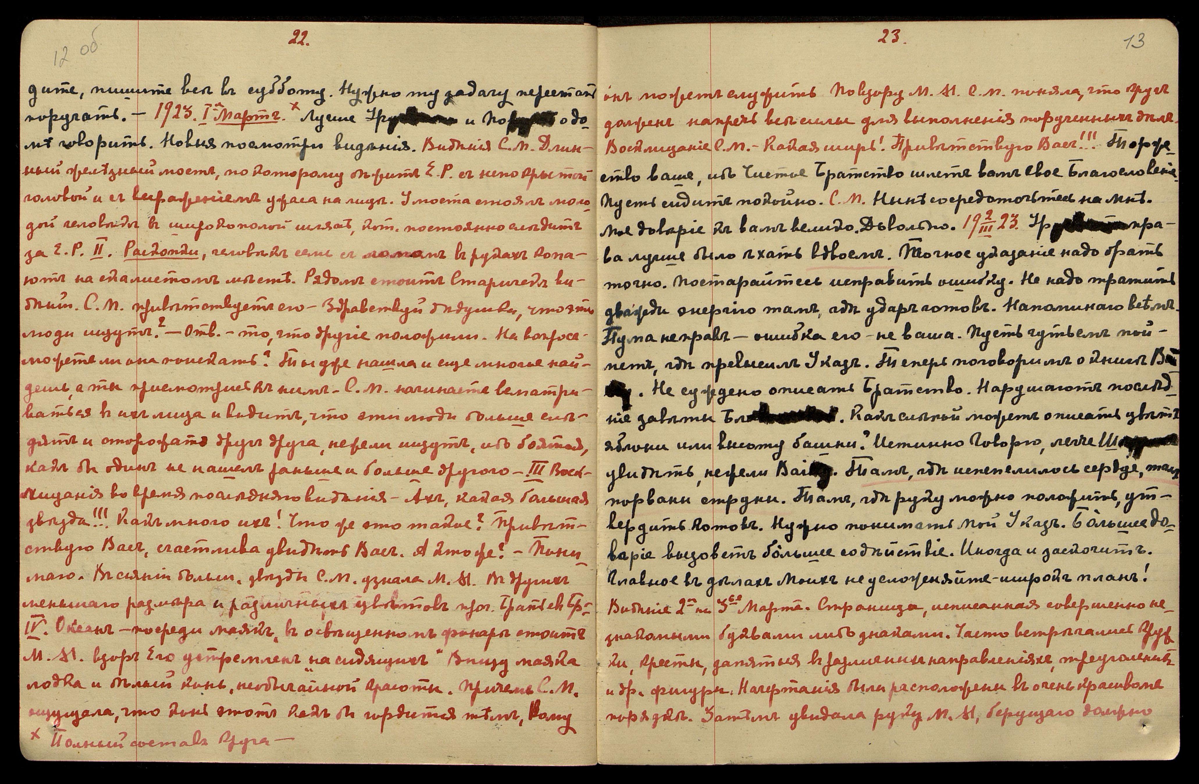 01.03.1923. [Присутствовал] полный состав круга. Лучше Урусвати и По[руме] о доме говорить. Новые посмотри видения. (Видения С[офьи] М[ихайловны Шафран]. I. Длинный железный мост, по которому бежит Е[лена] Р[ерих] с непокрытой головой и с выражением ужаса на лице. У моста стоял молодой человек в широкополой шляпе, кот[орый] постоянно следит за Е[леной] Р[ерих].