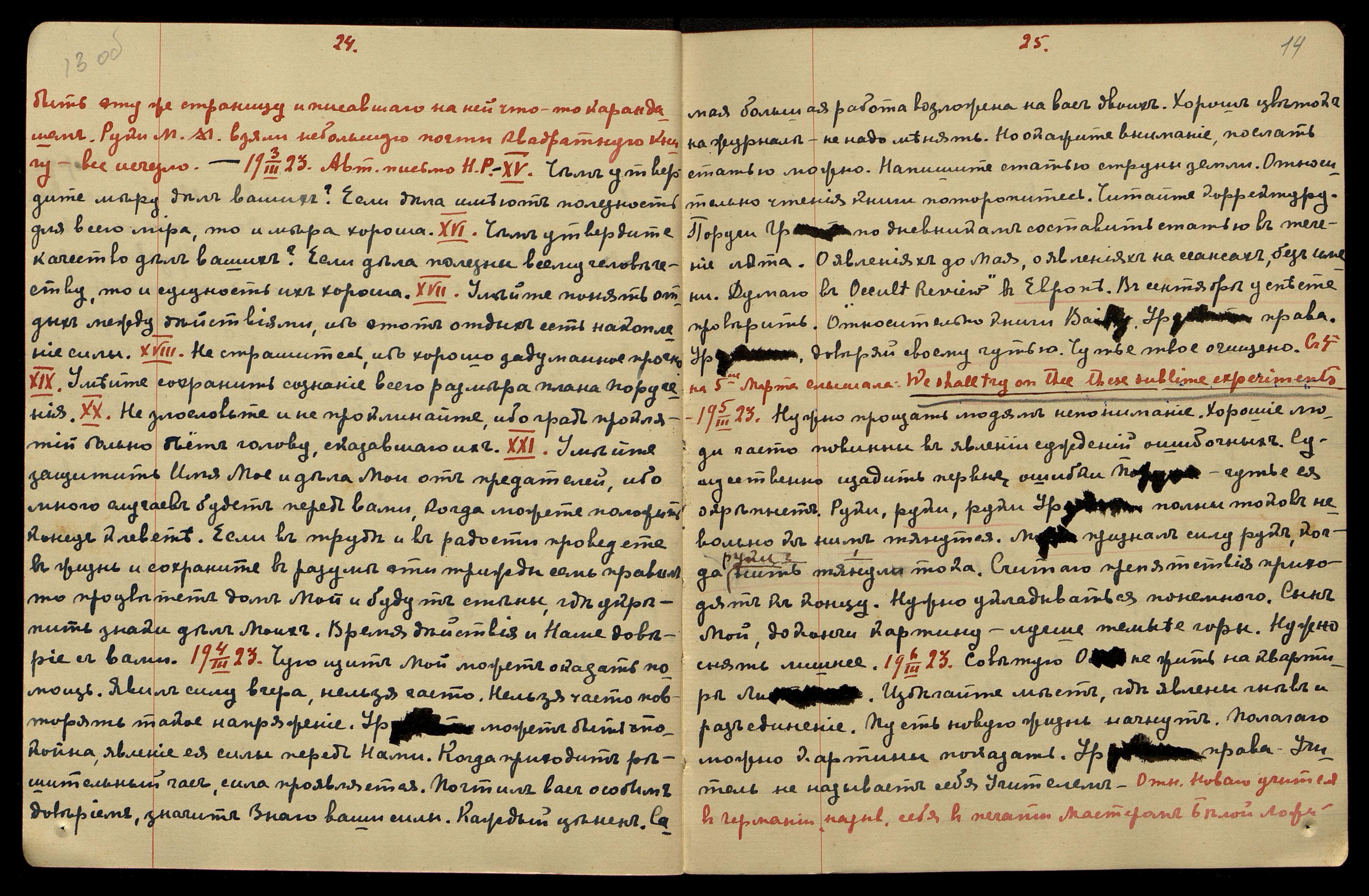 13.03.1923. Видение ребёнка лет 2-х. Корот[кие] тёмные волосы, полное личико, одет в белое платьице с голубым матросск[им] воротничком. Я послал Ш[афран] для труда. Урусвати, утверди явление Нового дома. Посягает на вас М[уромцев]. Чую, русских надо поласкать. Хочу назвать вашу болезнь − называется оккультной лихорадкой, явление, знакомое Нам, но усиленное утомлением и переменою организма. Надо бережно пережить то время. Советую Хо[ршу] посетить раньше Лондон. Чую, надо им её книгу пояснить. ("О[racle]".) Дана Моим учеником Душ[аном].