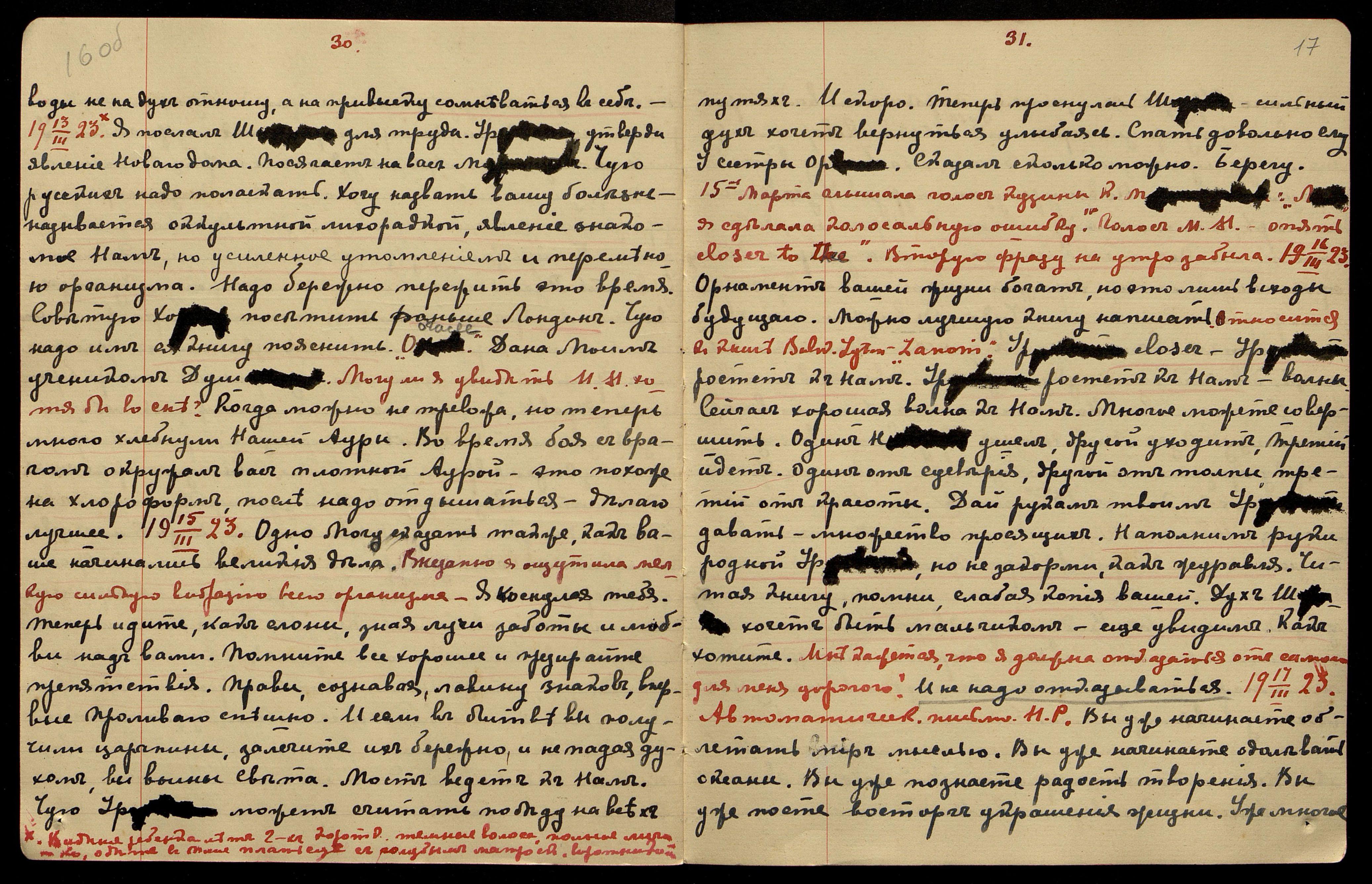 06.03.1923. Советую О[яне] не жить на квартире Ли[хтман]. Избегайте мест, где явлены гнев и разъединение. Пусть новую жизнь начнут. Полагаю, можно картины показать. Урусвати права − Учитель не называет себя Учителем. (Отн[осительно] нового учителя в Германии, назыв[ает] себя в печати Мастером Белой Ложи.)