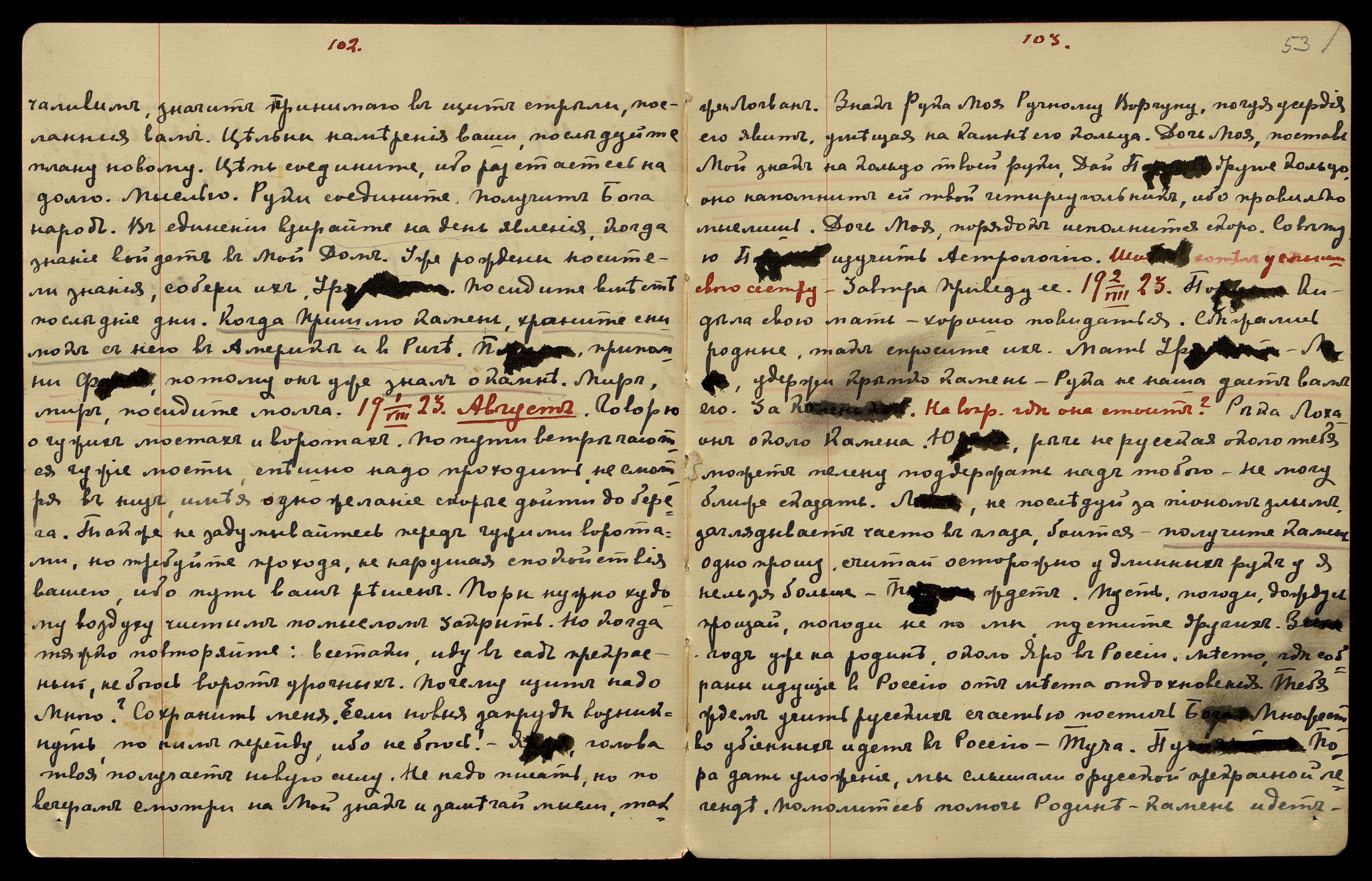 06.08.1923. Я послал Я[рую] прорубить первое окно в Россию. Харбин пока мало трогайте до Указаний. Урусвати, не случайно слышишь, ибо отбудете по послед-