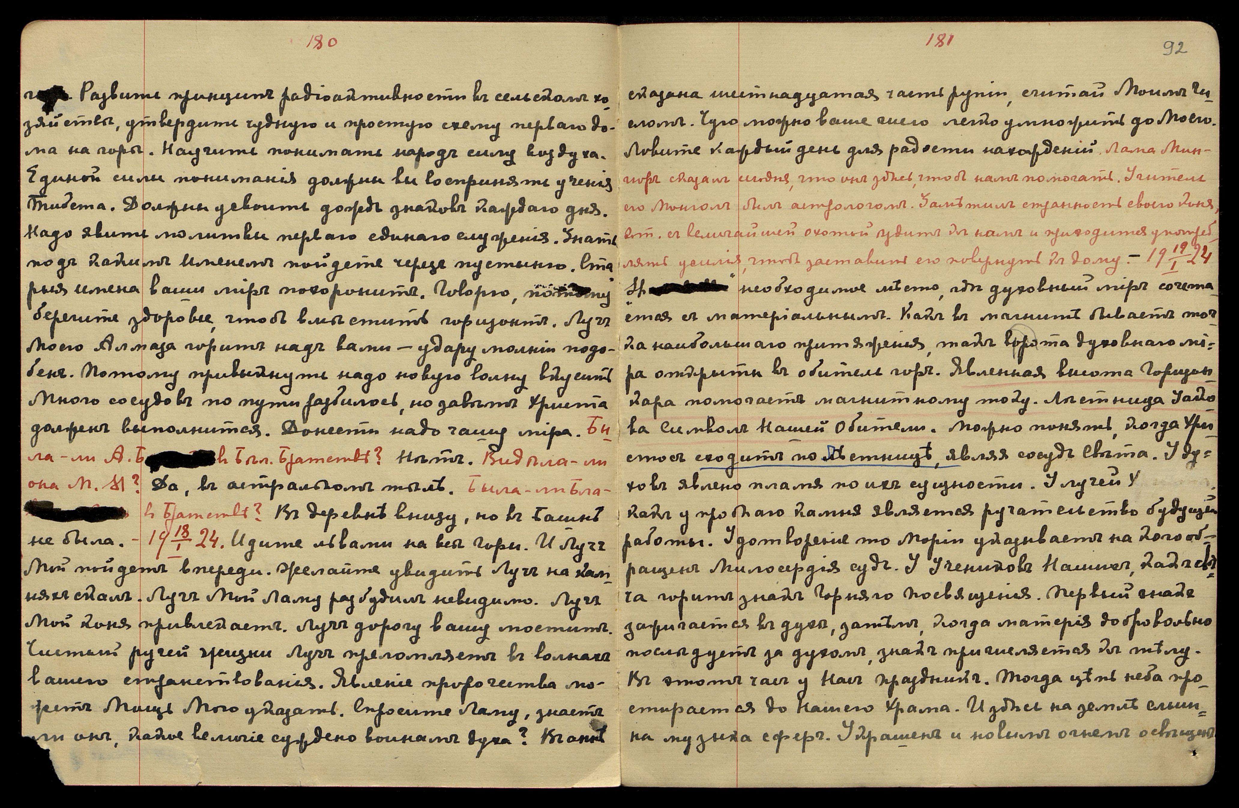 23.01.1924. Прошу предоставить обуздание лютых духов Нам. Надо меры принять. Желание оградить тайну своевременно. Приведу вовремя на место — пусть пройдут своим путём. Невозможно наделить вас поклёпами. Нельзя мешать данному времени отдыха. Теперь протекает очень важный год. Налажены события, косвенно строящие данные сроки. Пусть протекут месяцы в тихом труде. Знаю все опасности — потому только здоровье берегите, остальное приведу в порядок. Чистую комнату сохраните и со Мною говорите там. Лучше обед заменить обедом внизу.
