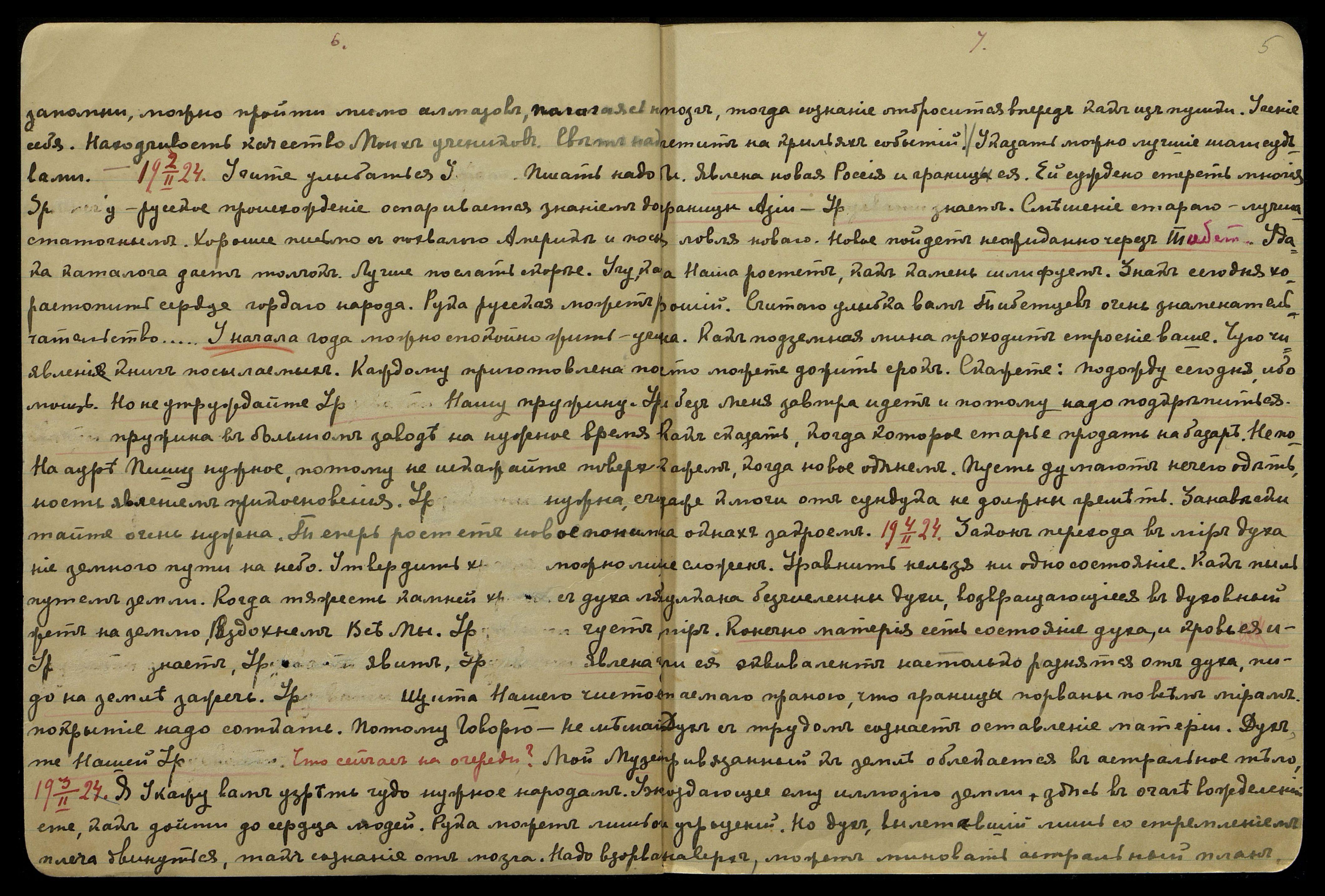 5/II-1924. Чую знак недобрый — по-новому Камень шагает. Камень ещё не проснулся, но надобность уже велика. Рука неприятеля тянется к дому Моему. Мой дом унижен. Урусвати сегодня может услышать зов Мой. Разойдемся сегодня рано. Желаю ерунду споров избежать. Урусвати, отдохни — шелест надо слышать. Лучше завтра разрешим вопросы о несуществующей смерти. Погрузи мысли на Америку. Учитель думает Камень скоро разбудить. Сделай стол между постелями чистый. Посидите, молча четверо — успокоить надо.