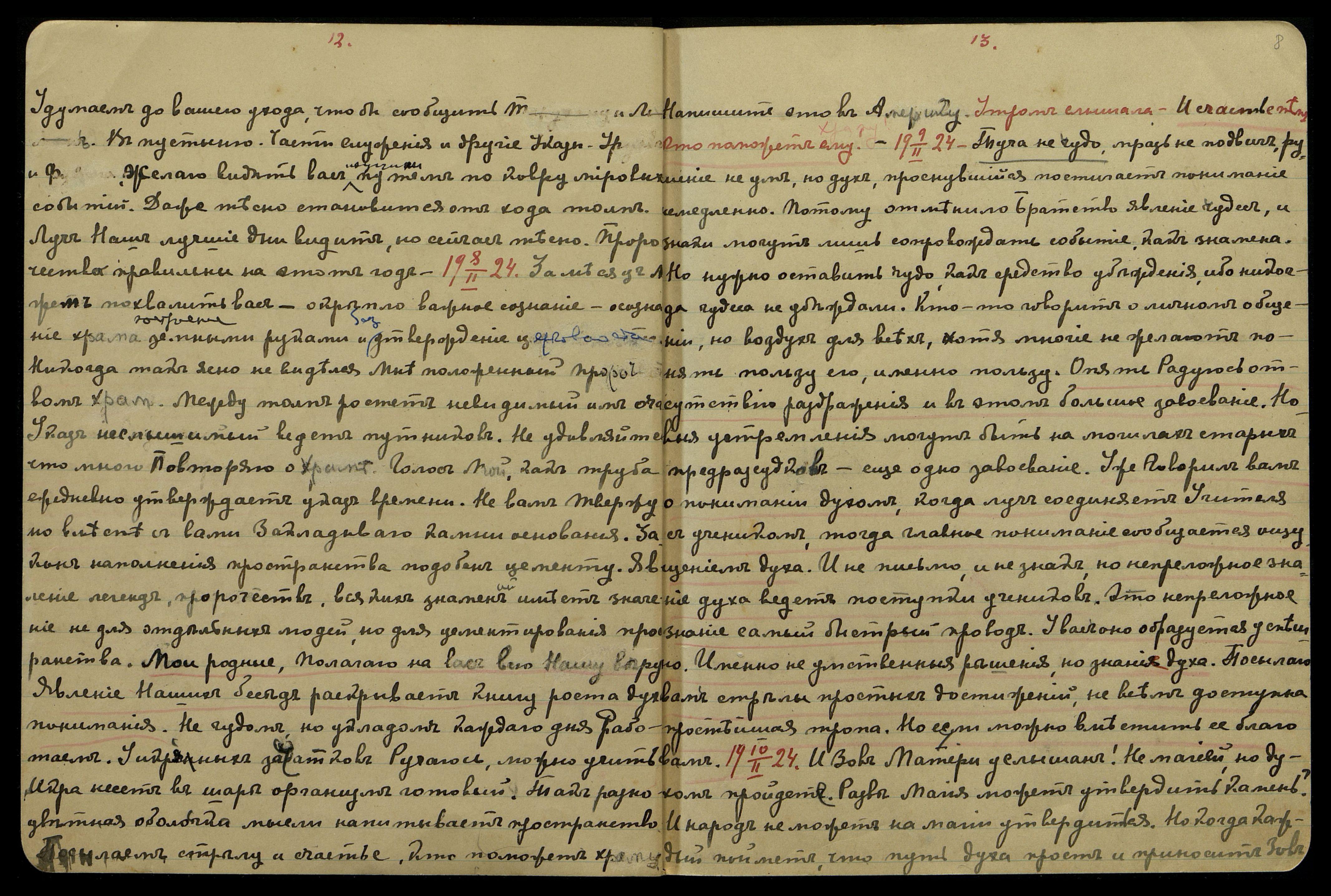 08/II-1924. За месяц можем похвалить вас — окрепло важное сознание — осознание храма построение земными руками и без утверждения церковности. Никогда так ясно не виделся Мне положенный пророчеством храм. Между толп растёт невидимый им очаг. Указ неслышимый ведёт путников. Не удивляйтесь, что много повторяю о Храме. Голос Мой, как труба, ежедневно утверждает указ времени. Не вам твержу, но вместе с вами закладываю камни основания. Закон наполнения пространства подобен цементу. Явление легенд, пророчеств, всяких знамений имеет значение не для отдельных людей, но для цементирования пространства. Мои родные, полагаю на вас всю Нашу веру. Явление Наших бесед раскрывает книгу роста духопонимания. Не чудом, но укладом каждого дня работаем. У икрянных зачатков, ручаюсь, можно учиться. Икра несёт в шаре организм готовый. Так разноцветная оболочка мысли напитывает пространство. Посылаем стрелу и счастье [тому], кто поможет храму. Напишите это в Америку. Утром слышала: "И счастье тому, кто поможет ему!"