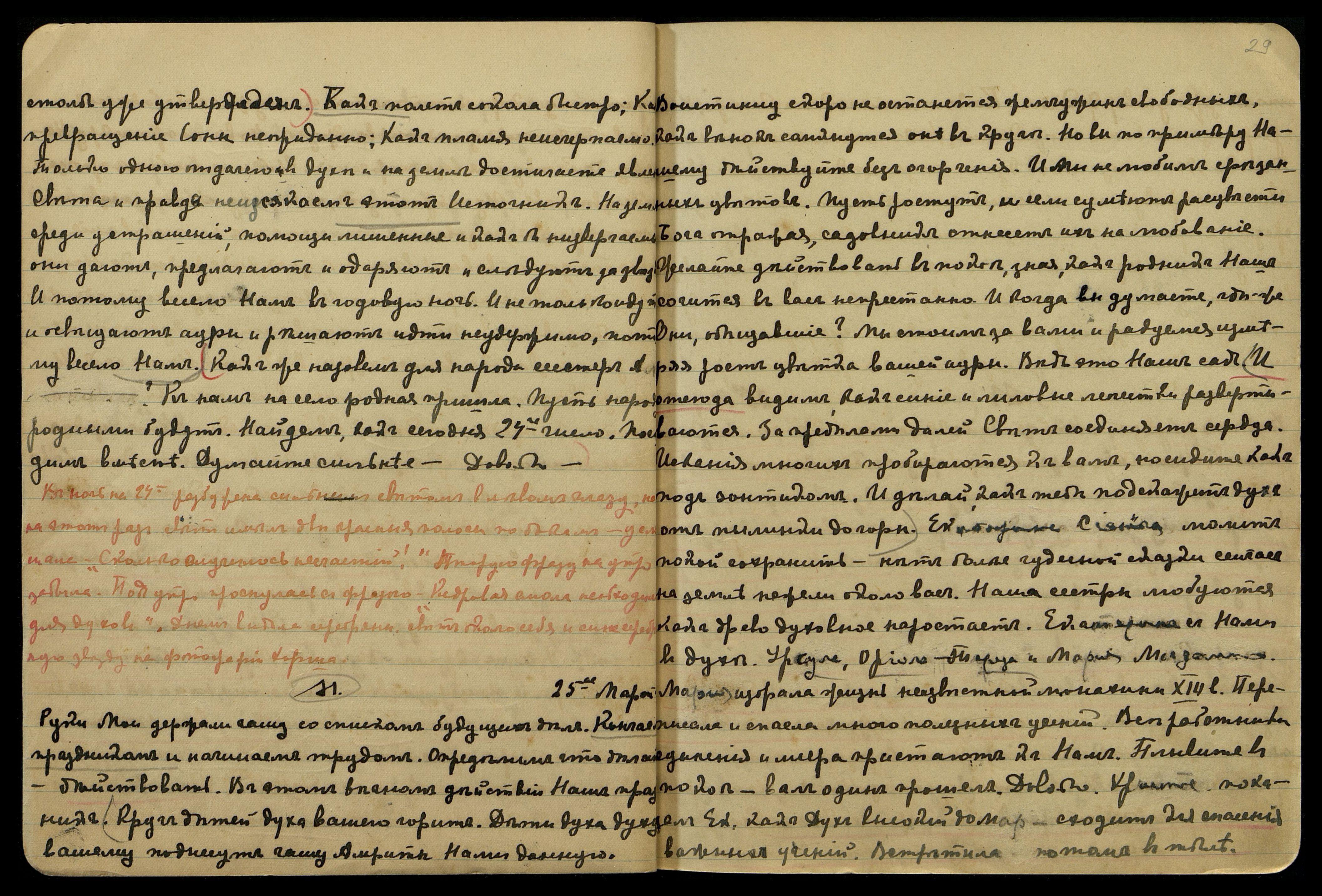 Руки мои держали чашу со списком будущих дел. Кончаем праздником и начинаем трудом. Определим, что делать — действовать. В этом вечном действии Наш праздник. Круг детей духа вашего горит. Дети духа духу вашему поднимут чашу Амриты, Нами данную. Воистину, скоро не останется жемчужин свободных, как венок сомкнутся они в круг. Но вы по примеру Нашему действуйте без огорчения. И Мы не любим срезанных цветов. Пусть растут, и если сумеют расцвести, Бога отражая, садовник отнесет их на любование. Желайте действовать в покое, зная, как родник Наш сочится в вас непрестанно. И когда вы думаете, где же Они, обещавшие? Мы стоим за вами и радуемся, измеряя рост цветка вашей ауры. Ведь это Наш сад. И отсюда видим, как синие и лиловые лепестки развертываются. За пределами далей Свет соединяет сердца. Искания многих пробираются к вам, но сидите, как под зонтиком. И делай, как тебе подскажет дух от пылинки до горы. Екатерина С[иенская] молит покой сохранить, нет более чудесной сказки сейчас на земле, нежели около вас. Наши сёстры любуются, как древо духовное нарастает. Екатерина с Нами в духе. Урсула, Ориола, Тереза и Мария Магдалина. Мария избрала жизнь неизвестной монахини XIII в. Переписала и спасла много полезных учений. Все работники единения и мира пристают к Нам. Плывите в покое, вал один прошел. Довольно. Христос показал Ек[атерине Сиенской], как Дух высокий до Мар[ии] сходит для спасения важных учений. Встретила потом в теле.