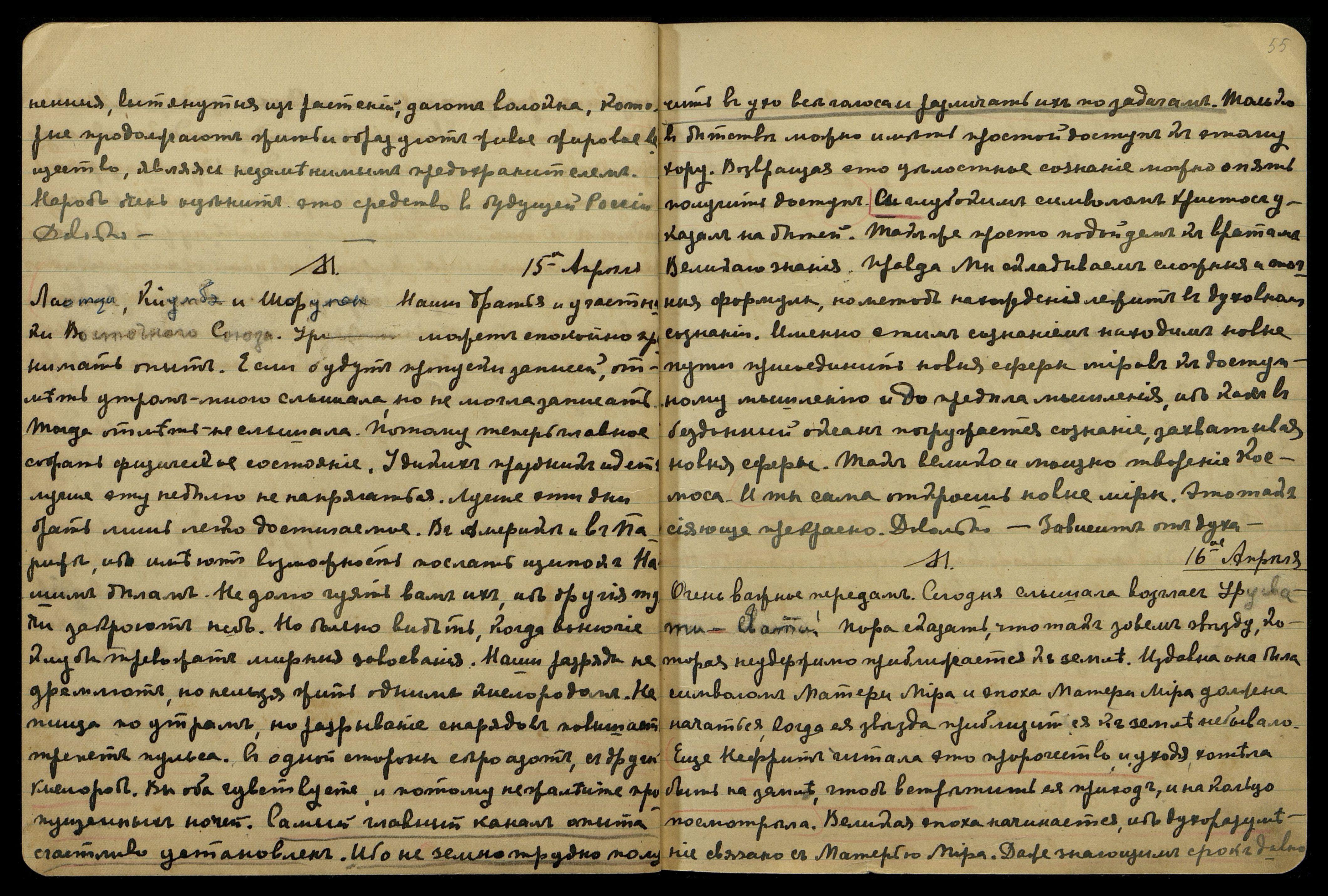 14-ое апреля. Шарки тоже Наш. Имеет поручение на Тибет. На три отдела разделяется Наша работа. Первый — изыскания улучшения земного плана. Второй — изыскания передачи людям этих результатов. Третий — изыскания способов сообщения с мирами. Первый требует трудолюбие и терпение, третий требует находчивости и бесстрашия, второй требует такого самоотвержения, что самый трудный полет является отдыхом.