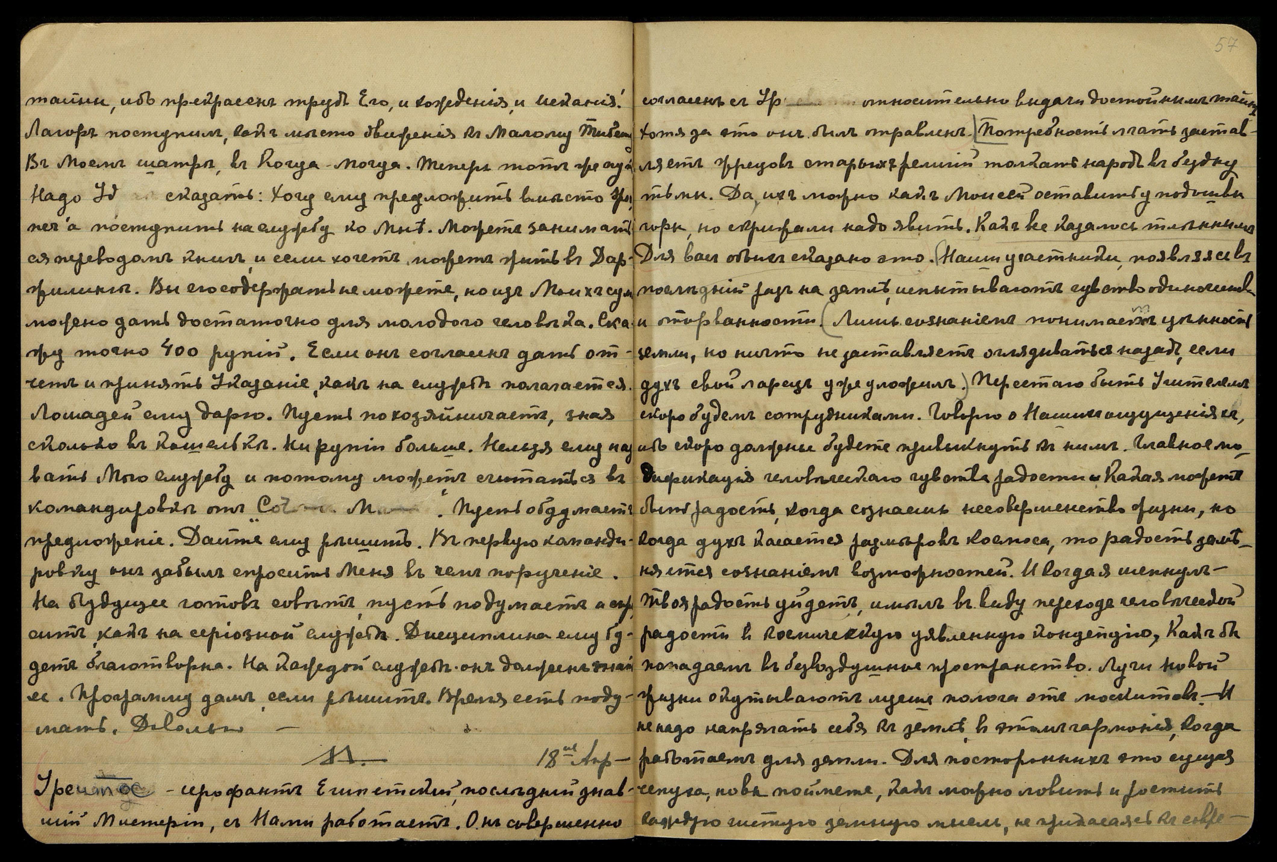 тайны, ибо прекрасен труд Его, и хождения, и искания! Лагор поступил, как место движения к Малому Тибету. В Моем шатре, в Когуа-Могуа. Теперь тот же аум. Надо Уд[рае] сказать − хочу ему предложить вместо Spesner'а поступить на службу ко Мне. Может заниматься переводом книг, и, если хочет, может жить в Даржилинге. Вы его содержать не можете, но из Моих сумм можно дать достаточно для молодого человека. Скажу точно — 400 рупий. Если он согласен дать отчет и принять Указание, как на службе полагается. Лошадей ему дарю. Пусть похозяйничает, зная сколько в кошельке. Ни рупии больше. Нельзя ему назвать Мою службу и потому может считаться в командировке от Сor[ona] М[undi]. Пусть обдумает предложение. Дайте ему решить. В первую командировку он забыл спросить Меня — в чём поручение. На будущее готовь совет, пусть подумает и спросит, как на серьёзной службе. Дисциплина ему будет благотворна. На каждой службе он должен знать её. Программу дам, если решит. Время есть подумать. Довольно.