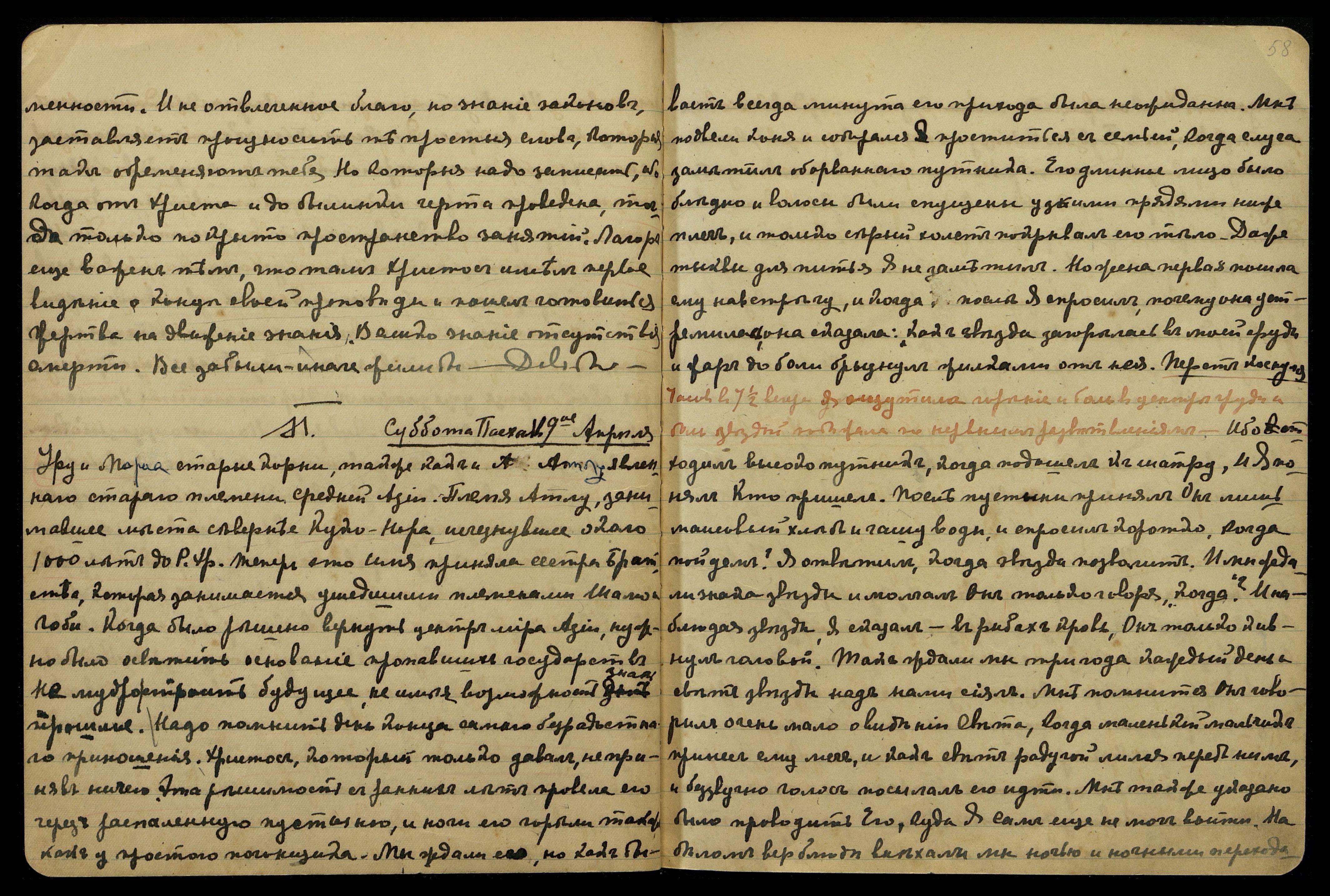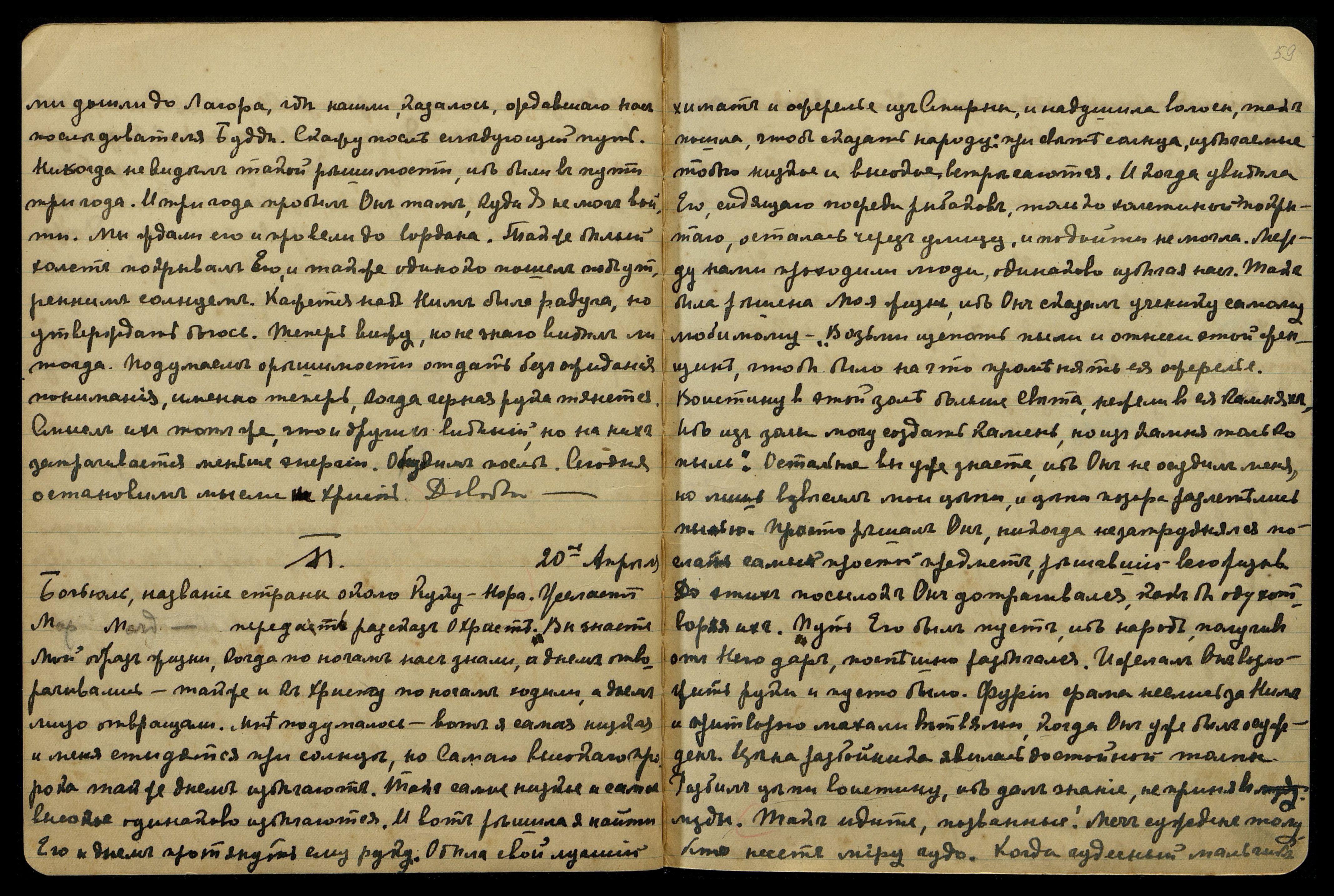 20-ое апреля. Богьюль, название страны около Куку-Нора. Желает Мор[ия] Магд[алены] передать рассказ о Христе. "Вы знаете Мой образ жизни, когда по ночам нас знали, а днем отворачивались, также и к Христу — по ночам ходили, а днём лицо отвращали. Мне подумалось: вот я самая низкая и меня стыдятся при солнце, но Самого высокого пророка также днем избегают. Так самое низкое и самое высокое одинаково избегаются. И вот решила я найти Его и днём протянуть ему руку. Одела свой лучший химат и ожерелье из Смирны, и надушила волосы, так пошла, чтобы сказать народу: "При свете солнца избегаемые тобою низкое и высокое встречаются". И когда увидела Его, сидящего посреди рыбаков, только холстиной покрытого, осталась через улицу, и подойти не могла. Между нами проходили люди, одинаково избегая нас. Так была решена Моя жизнь, ибо Он сказал ученику самому любимому: "Возьми щепоть пыли и отнеси этой женщине, чтобы было на что променять её ожерелье. Воистину, в этой золе больше света, нежели в её камнях, ибо из золы могу создать камень, но из камня только пыль". Остальное вы уже знаете, ибо Он не осудил меня, но лишь взвесил мои цепи, и цепи позора разлетелись пылью. Просто решал Он, никогда не затруднялся послать самый простой предмет, решавший всю жизнь. До этих посылок Он дотрагивался, как бы, одухотворяя их. Путь Его был пуст, ибо народ, получив от Него дар, поспешно разбегался. И желал Он возложить руки, и пусто было. Фурии срама неслись за Ним и притворно махали ветвями, когда Он уже был осужден. Цена разбойника явилась достойной толпы. Разбил цепи, воистину, ибо дал знание, не приняв мзды".