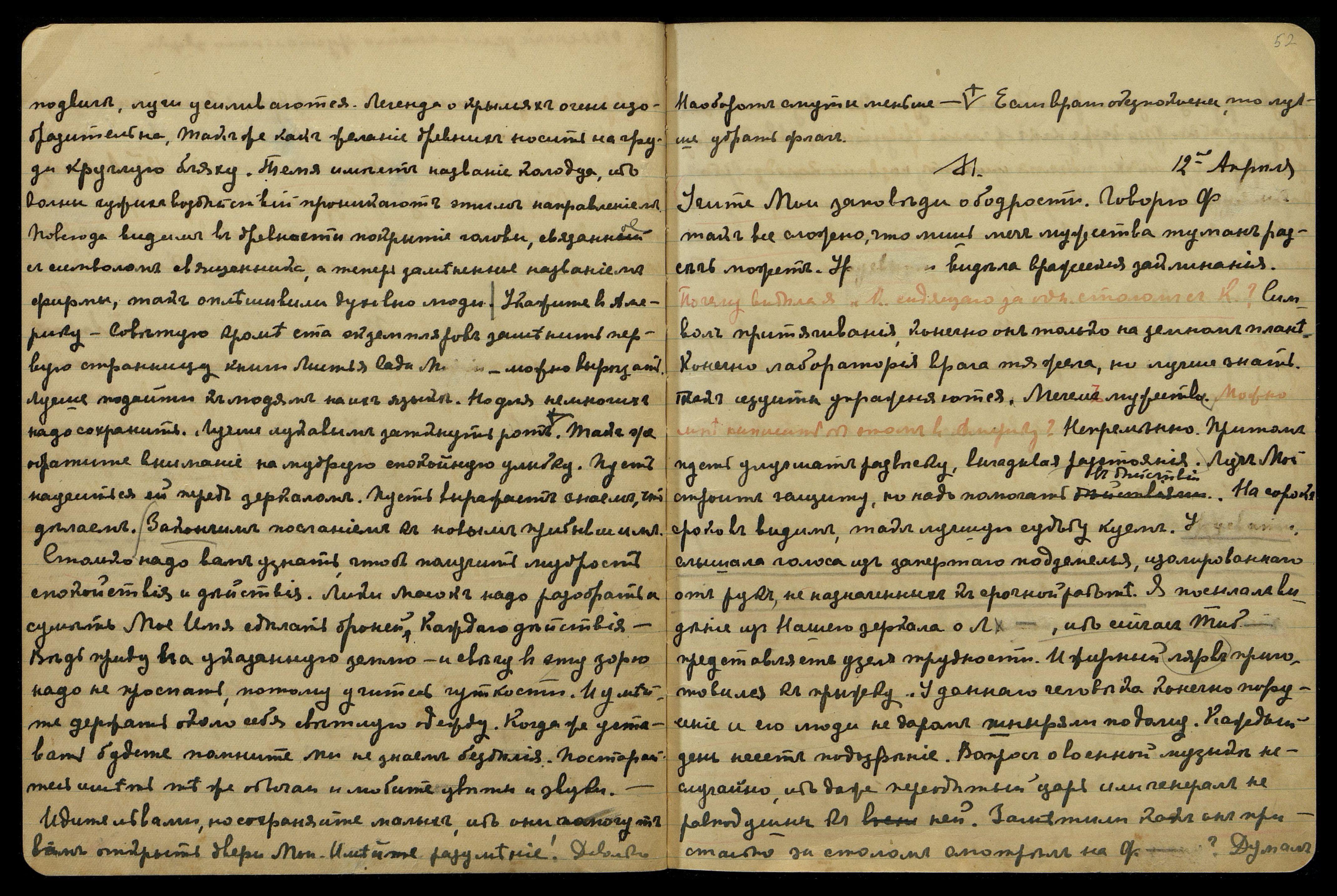 13-ое апреля. Турмалы — он тоже Наш и знал Искандер Ханум. Он решит значение революции в Индии. Он знает народ, ибо долго ходил саньязином. Религия ведь их оставила народ. Урусвати постепенно узнает всех друзей. Постепенно весь собор Братства обнаружится. Не надо Урусвати на птиц сердиться, ибо каждый звук опыт вооружает. Можно потратить 77 ночей, чтоб узнать Имена Братства. Каждый будет объяснен, но без их лучей знакомство не будет полезным для будущего. Считаю опыт протекает прекрасно. Лучше не напрягаться, можно достичь лучшей координации центров, не избегая проявлений жизни. Привыкнув к звукам и мелким вторжениям можно слышать всегда. Только не надо спешить, ибо каждое завоевание должно врасти. Уже видела окна башни и резонанс вышины. Теперь узнаешь беззвучные голоса подземелий. Кто на вышках башен, кто под землею пользуется лучшими условиями работы. Самое главное не записано в книгу — разнообразие деятельности и метод телеграфной работы. Дай нарасти опыту. Сама видишь, как даже птицы кажутся мешающими. Пойми два основания. Одно − личное, для прихода к Нам вам нужно ознакомиться со многим, которое накопится за эти годы. Второе − мировое, ибо принесешь миру постоянное сознательное общение. Надо иметь возможность общения по разным областям. Когда многие земные аппараты придется уничтожить вследствие вреда, тогда настаёт время приблизить человечество посредством природного аппарата. Грамотный буквою может действовать лишь на поверхности земли, грамотный духом может действовать вне границ. Если знание Братства не важно... ([Стёрто одно предложение, написанное красными чернилами]). Меньше половины дано, то теперь важно знать несущих настоящей задачи решение. Братство работает группами, и нарастание задачи гармонично соединяет совет для новых комбинаций. Надо не поддаваться тяжким лучам земли. Оставь частицу земли Кон[раду]. Он напряг луч своей лаборатории, зная, что 36-й год принесет ему личную борьбу со Мною. Но в Америке его луч собран. К тому говорю, что по