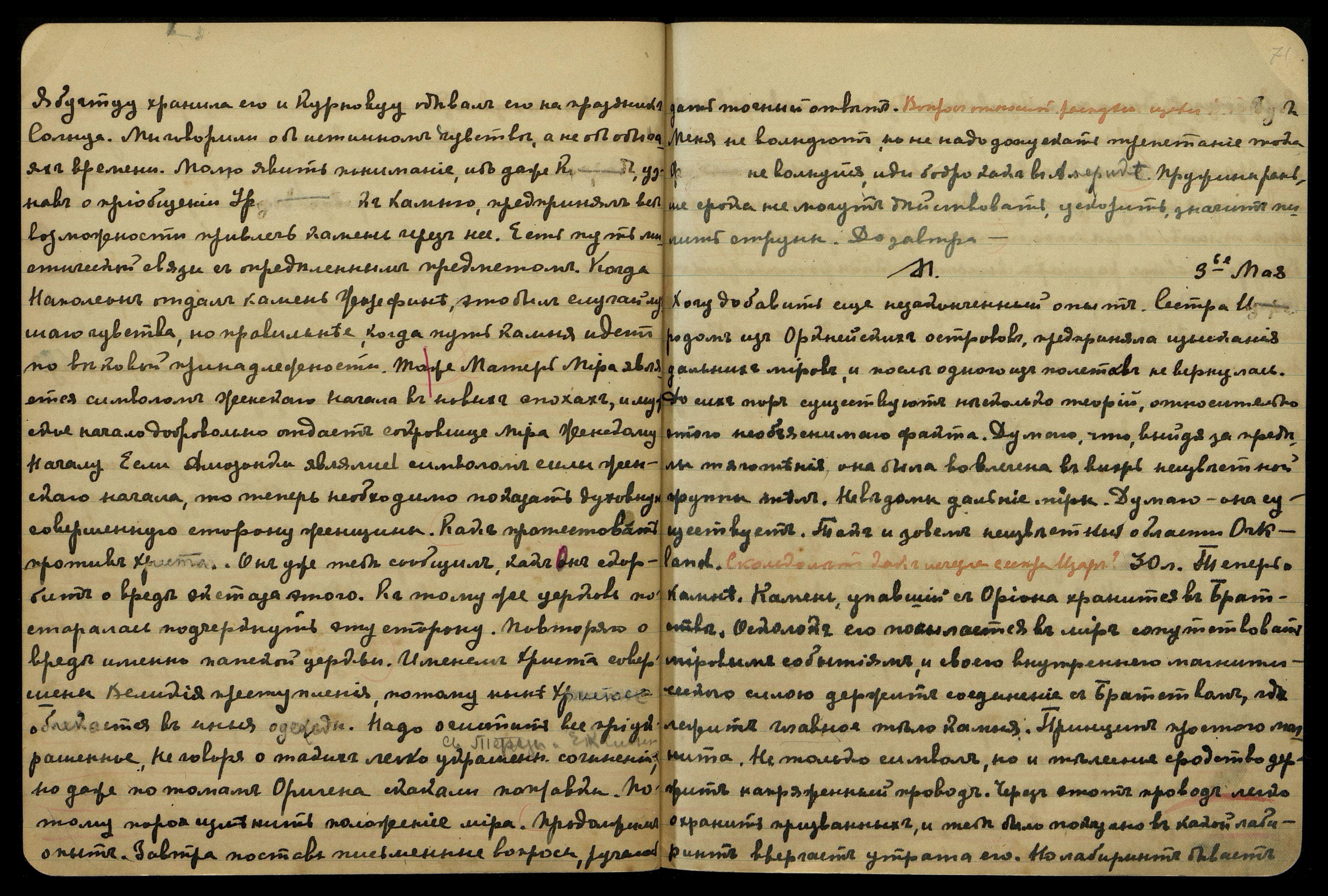 4-ое мая. Примите совет, как распределить материал новой книги. На отдельных листах три части. Первая — общее учение, подлежащее скорому печатанию. Вторая — описание жизни Братства и Членов Его. Сюда же относятся пророчества и история Камня. III часть — всё касающееся вас, о прежних жизнях и о поручении. Таким образом весь материал вольётся в три русла. Явление переписки сократится, ибо не нужен второй экземпляр. I часть носит преж-